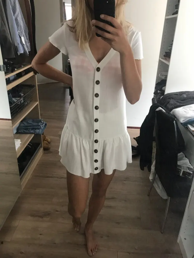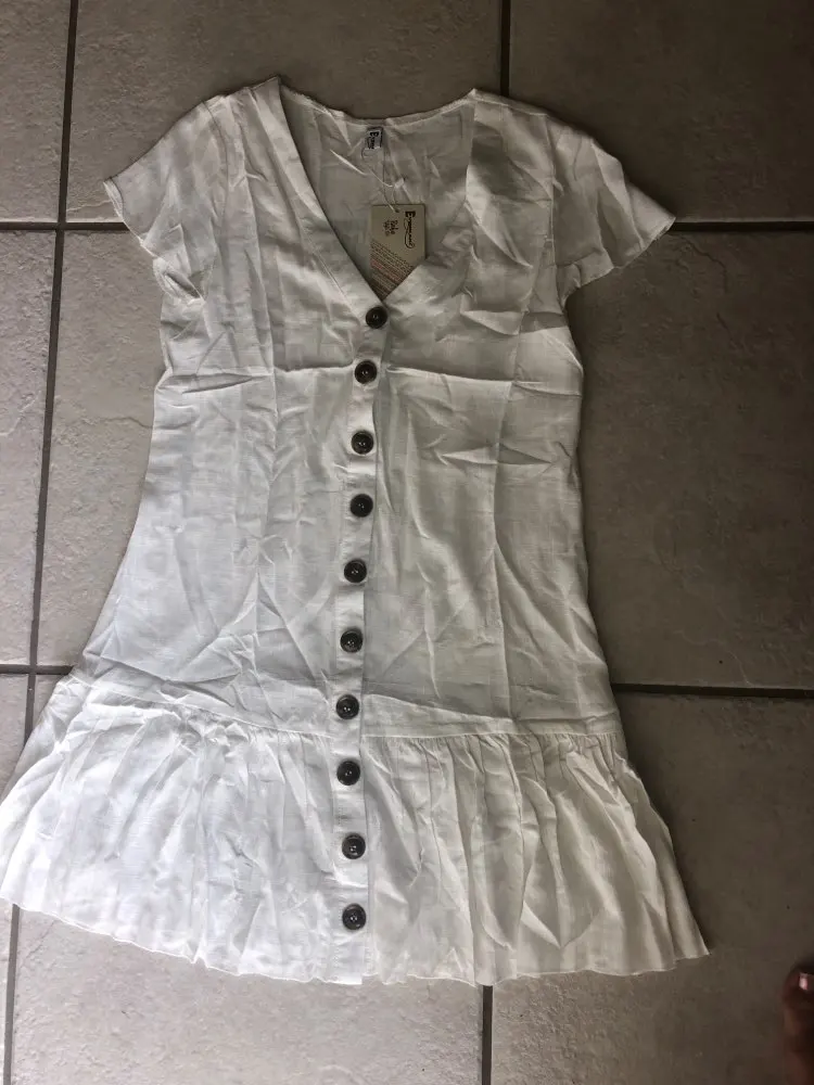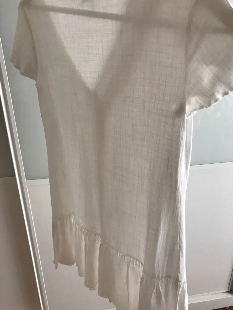 Dress has come after 12 days, registered mail! Size L is such 40. I I wear 42 and under bust is for ciasna, material in general don't extends, it is probably Len. Carefully sewn, not stinks. A little short on 164 cm growth barely for butt, for higher people will be more like tunic.
