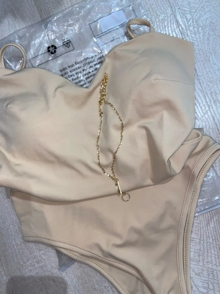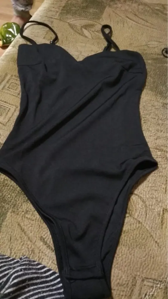 Хороший боди. Чашечки в комплекте совершенно не подходят ему. Нет кармана-фиксатора для них, то есть могут сползти на живот. Без них лучше. Ткань плотная, не мнется.