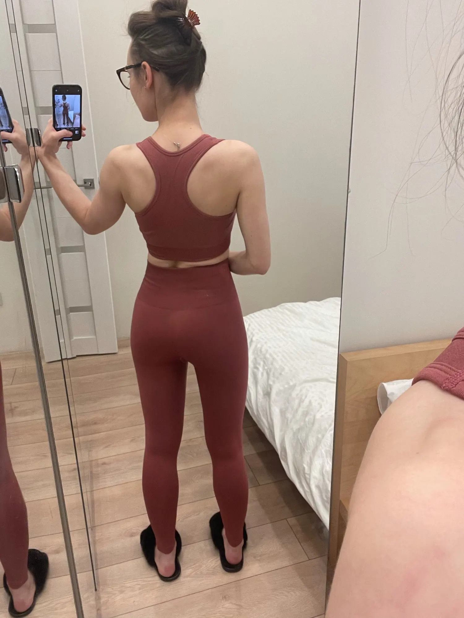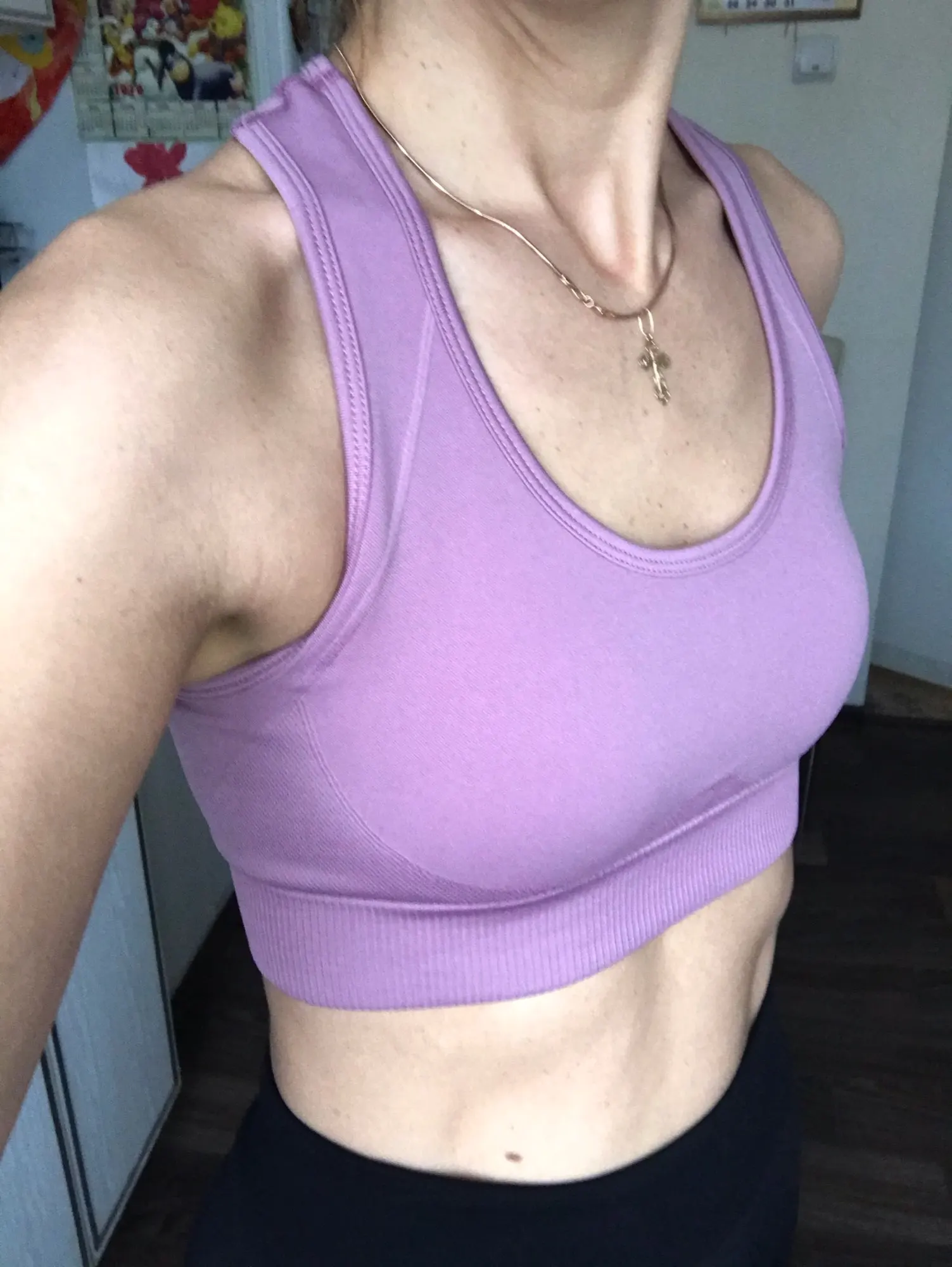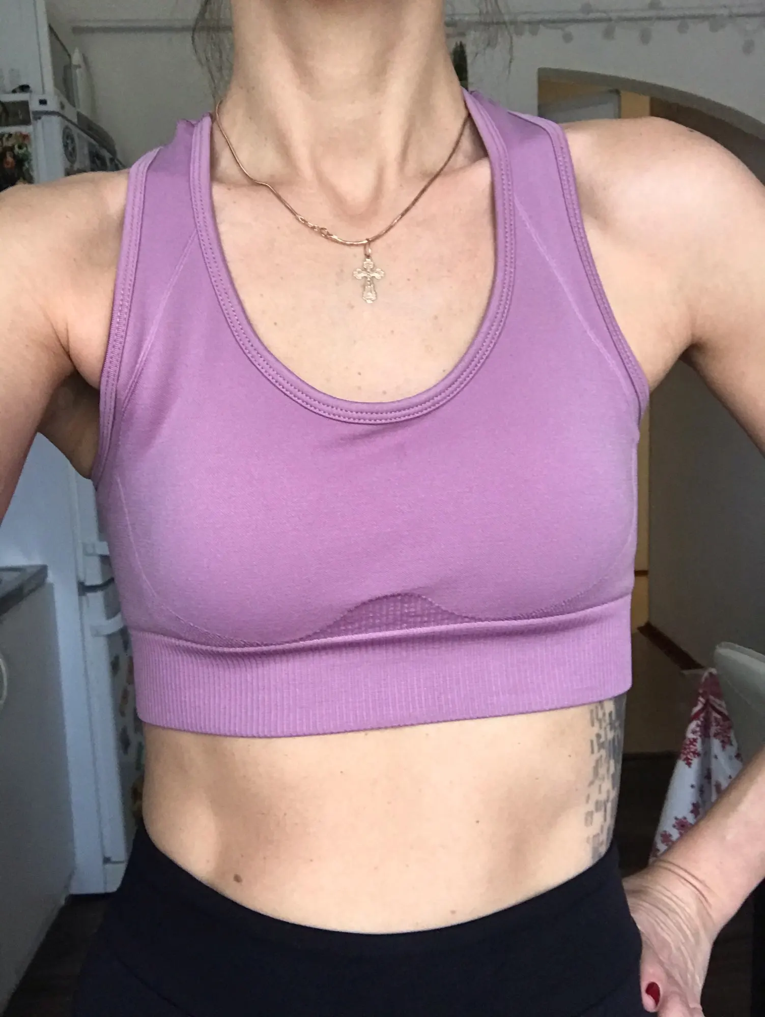 Костюм просто опупительный! Компрессия хорошая, мышцы все держит. Цвет точно как на фото. И он просто восхитительный. Переживала за топ, но зря. Сел хорошо, не плющит. Есть вставки-чашечки. Лосины не светят. А с бесшовным бельём вообще ничего видно не будет. Не смотря на то, что ткань плотная и с утяжкой, попу не уплощают. Довольна как слон! Посмотрю как в носке и закажу в других цветах. Доставка до Москвы быстрая в Пятёрочку. Спасибо продавцу.