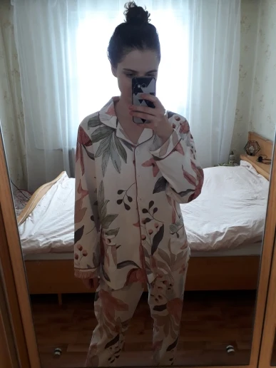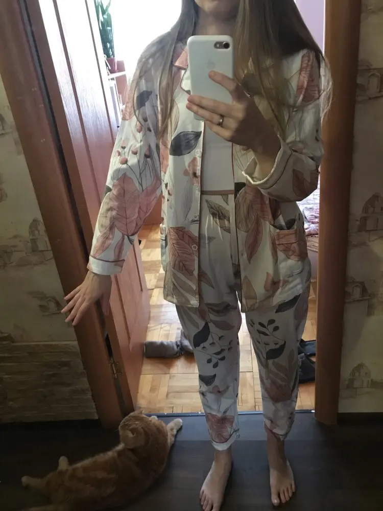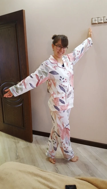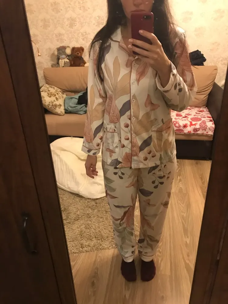 Chic pajamas. The best I 've ever had with Ali. Smooth seams. Perfectly sewn. Very pleasant, soft. On my parameters: height 170, og 85, OT 65, about 95 in the size of L sat well. The only thing that is still short sleeves and pants, if you put on as expected on the waist, but I was guided by the reviews and knew that it would be so. I'm uncritical. The elastic in the pants is not tight. The store is very prompt, polite, quickly answers. I ordered a top with pajamas, I asked to change the color. Sent everything as requested. Thank you!