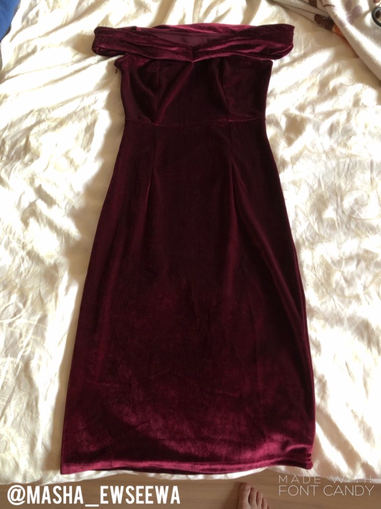 Delivery 2,5 weeks. My parameters are 82 (opg 75)-69-90, height 163 cm, size s-great. Length below the knees. Dress with open shoulders. Side zipper. V-neck. Material-velvet. Good, dense, moderately stretches. Lining is not (and not needed). Dress beautiful color. It looks very interesting, i like it (if it was the size). The quality of the product suited me. I did not find any defects, only a couple extra threads on the wrong side. In general, the dress is cool.