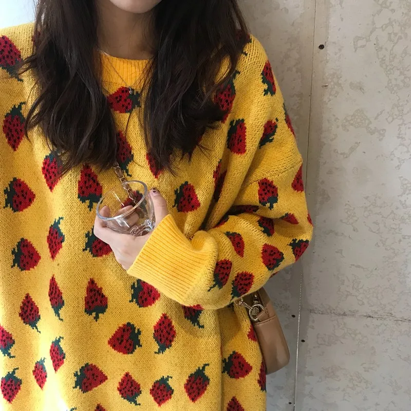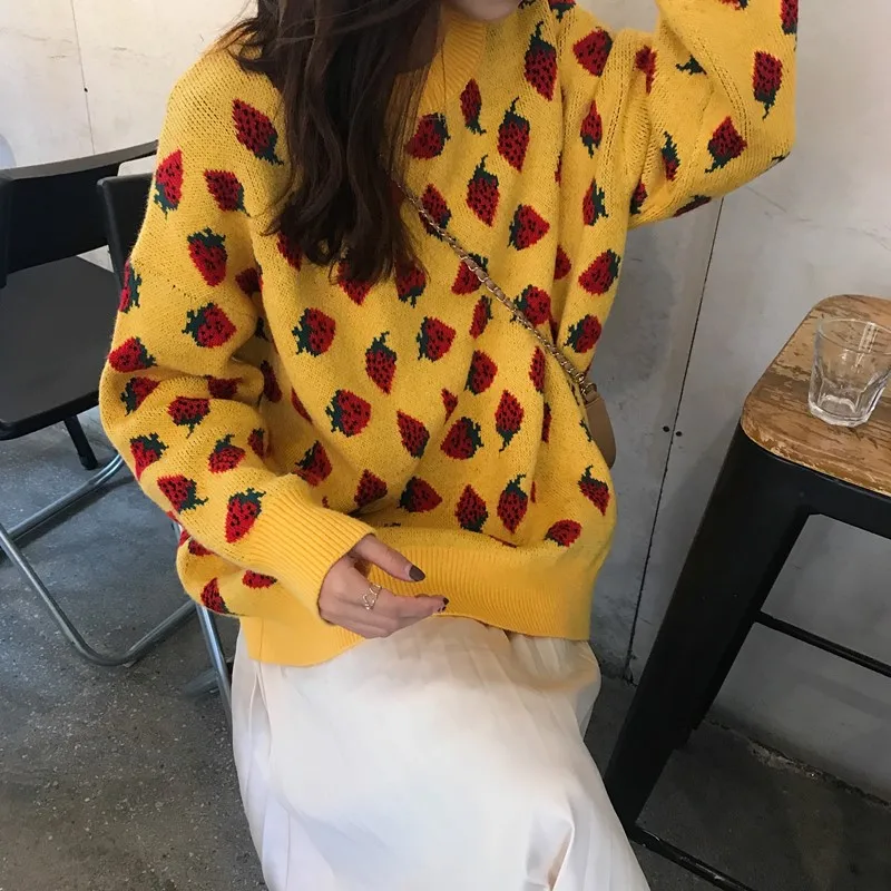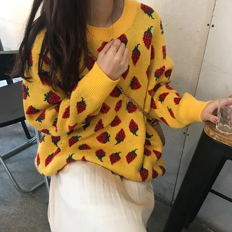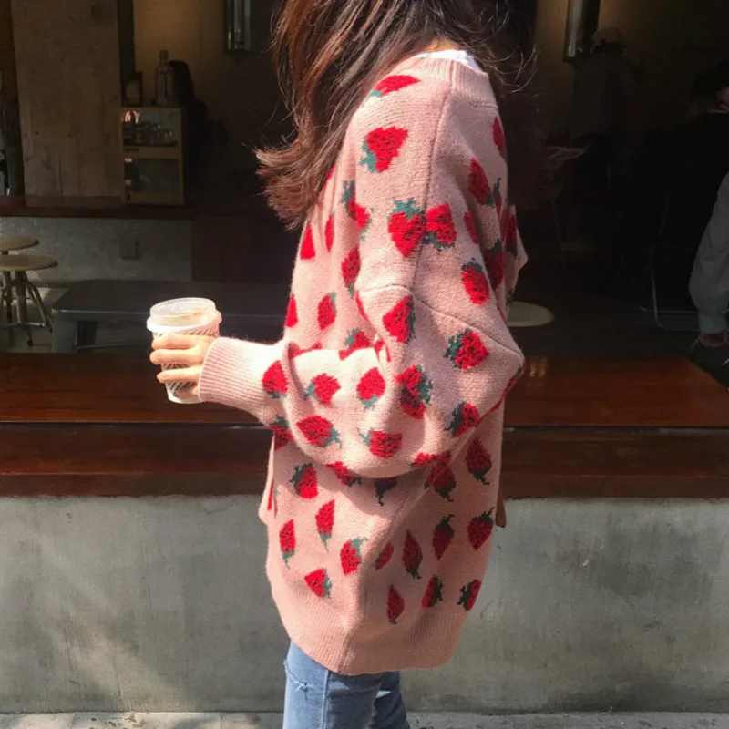FREE SHIPPING Strawberry Sweater College Wind Sweet Strawberry Jacquard JKP1420