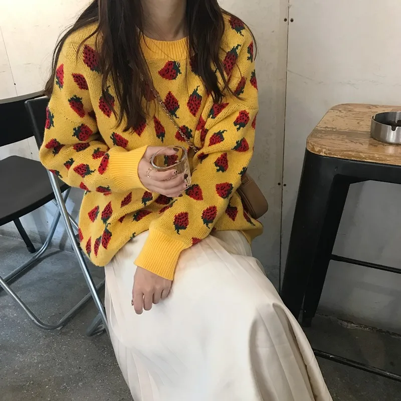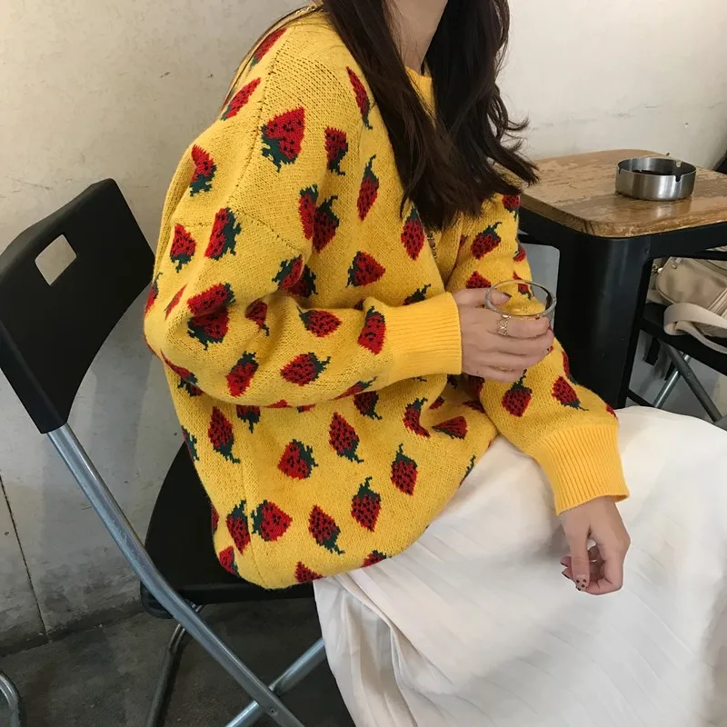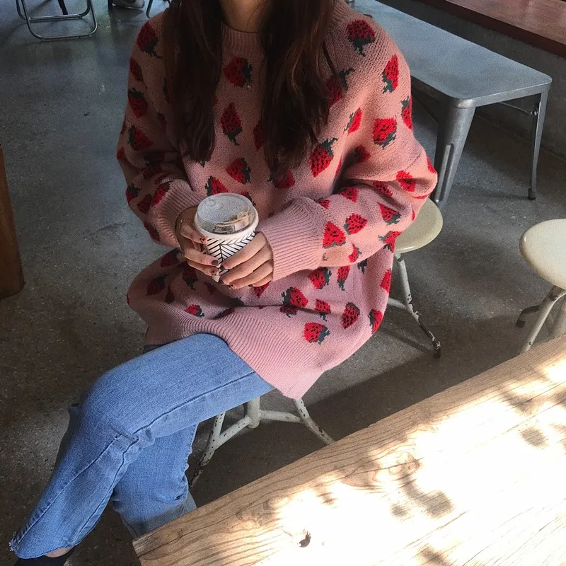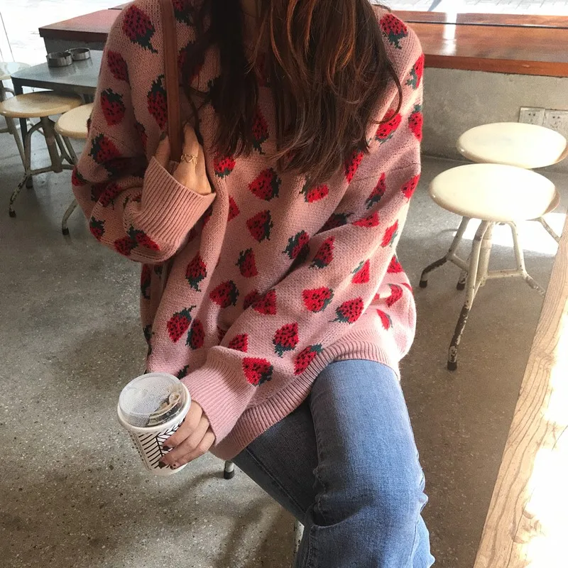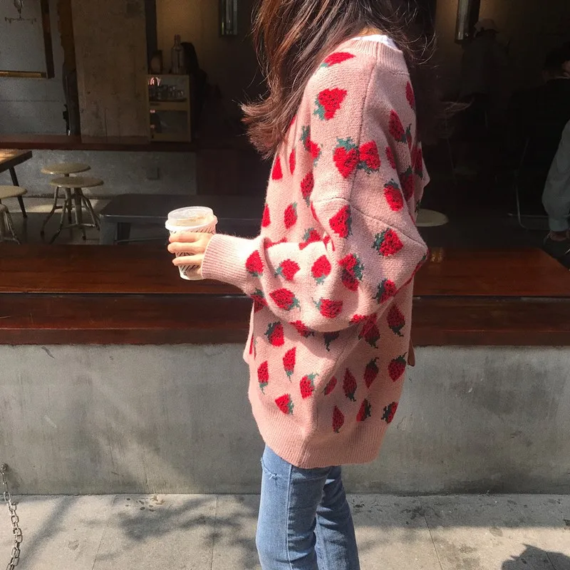 FREE SHIPPING Strawberry Sweater College Wind Sweet Strawberry Jacquard JKP1420