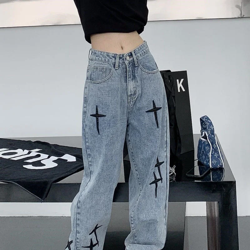 FREE SHIPPING Streetwear Straight Baggy Pants Cross Embroidery Jeans JKP6984