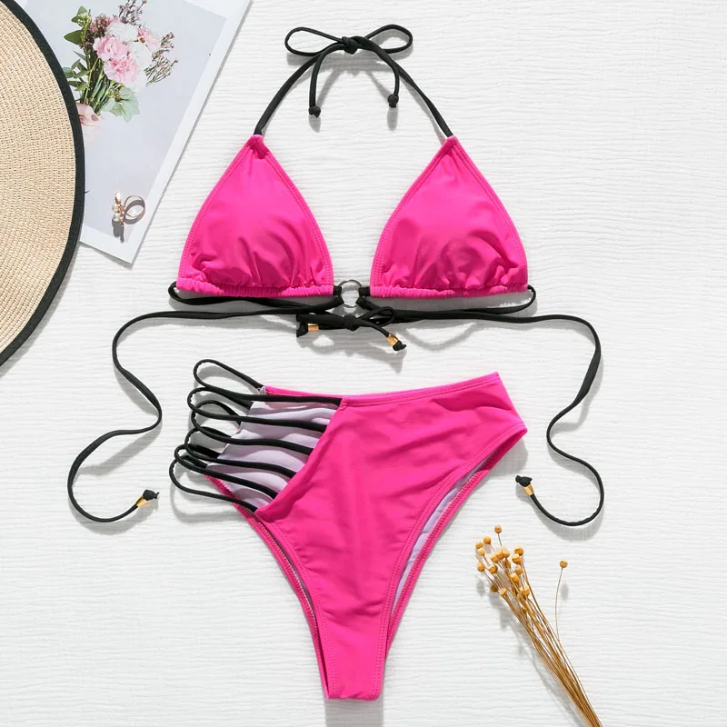 FREE SHIPPING String Lace Up Bandage Bathing Suit Neon Halter High Waist Swimwear JKP3713