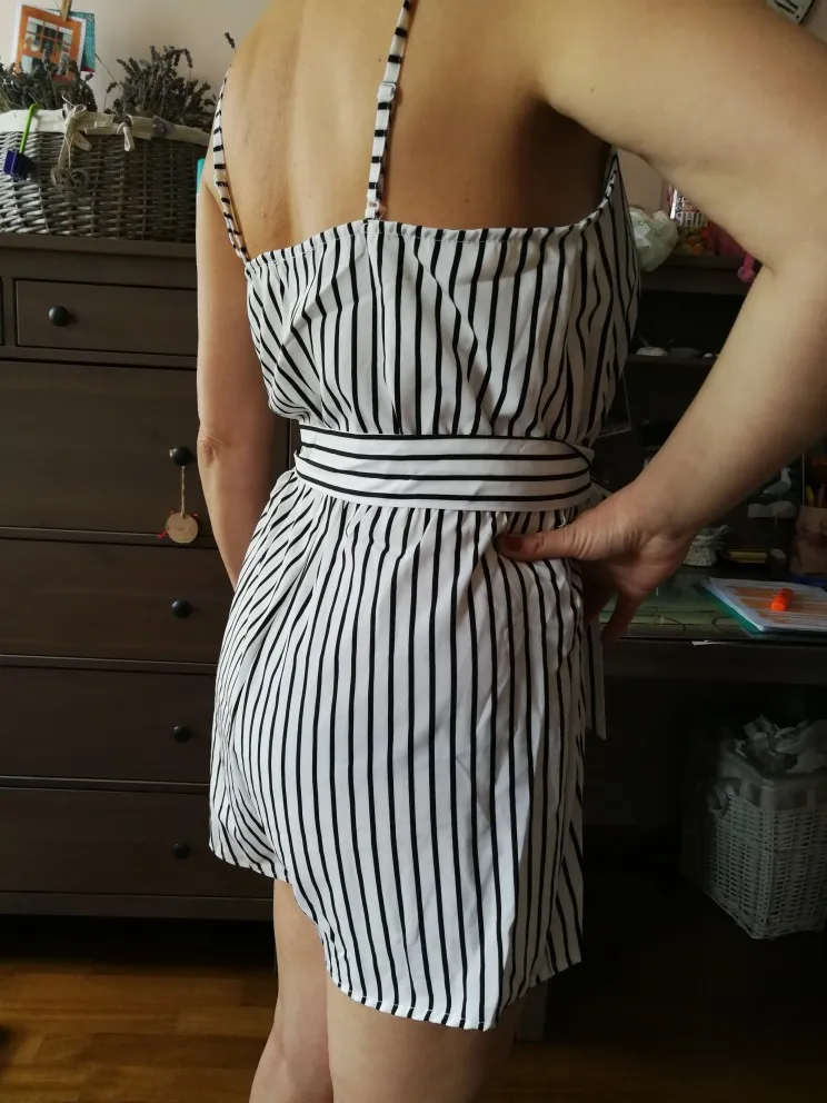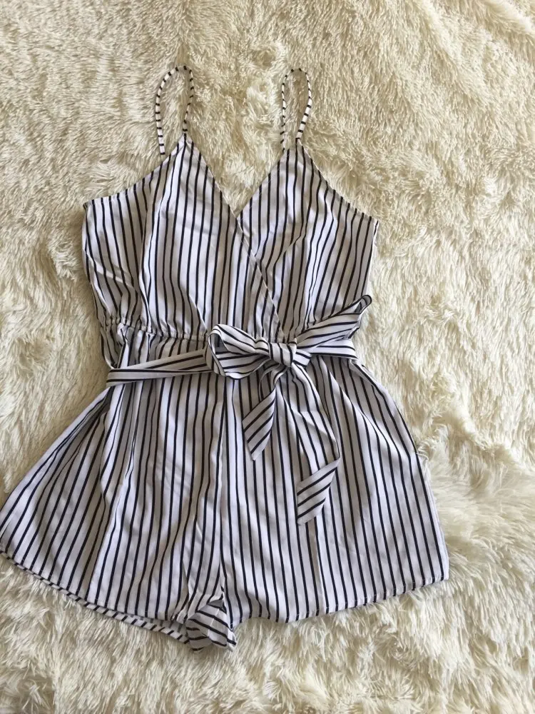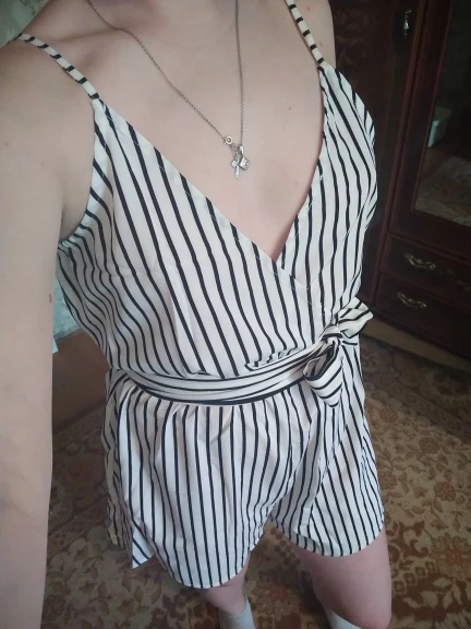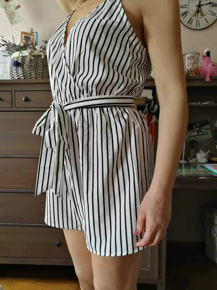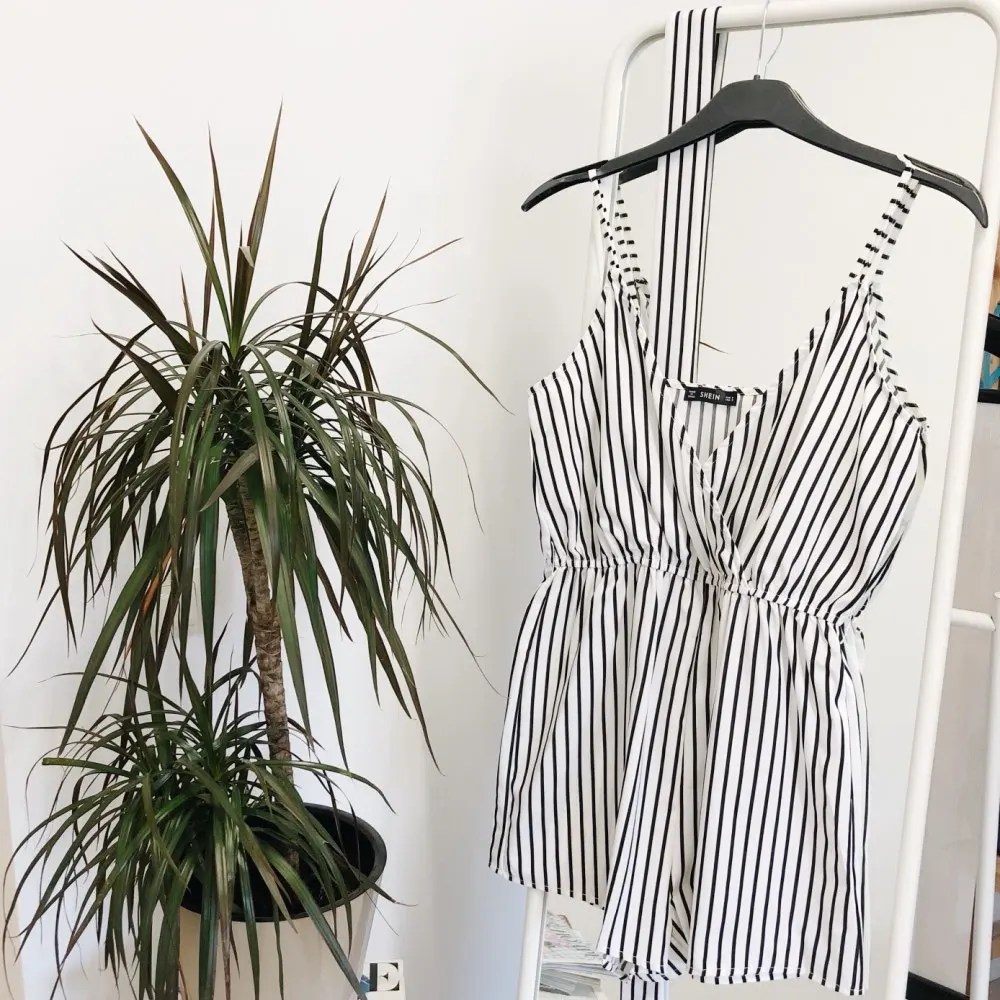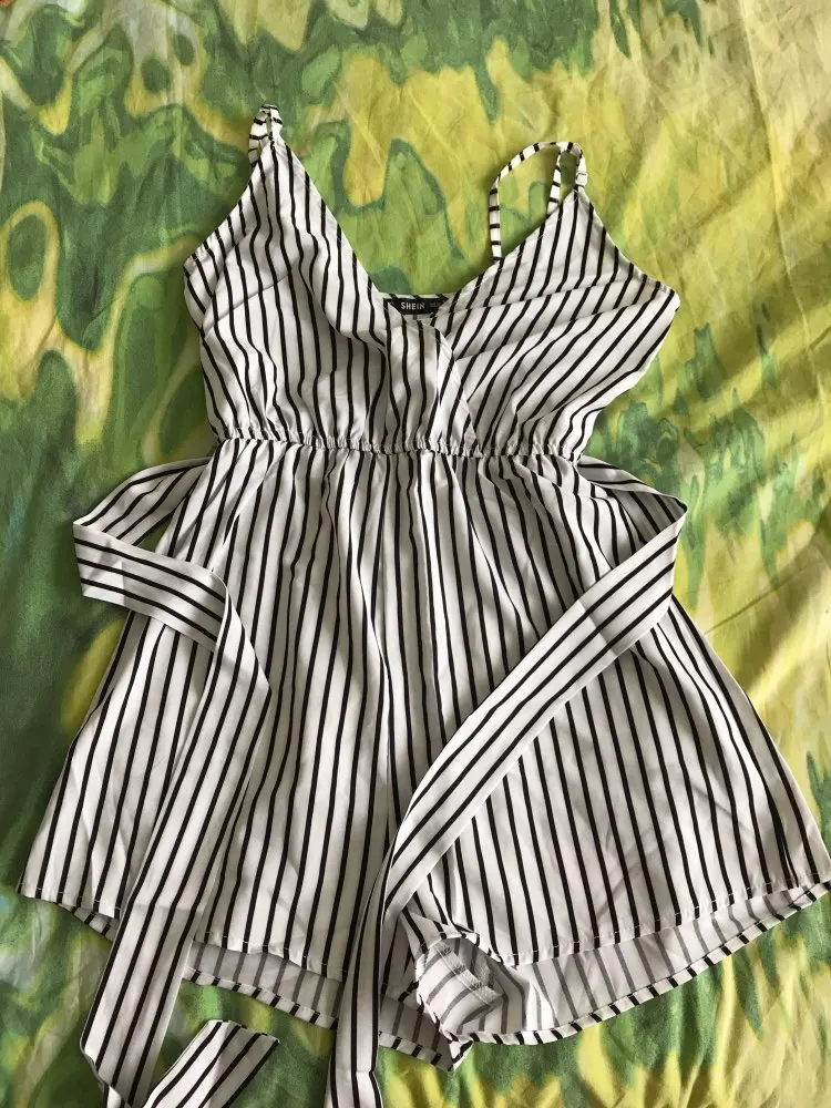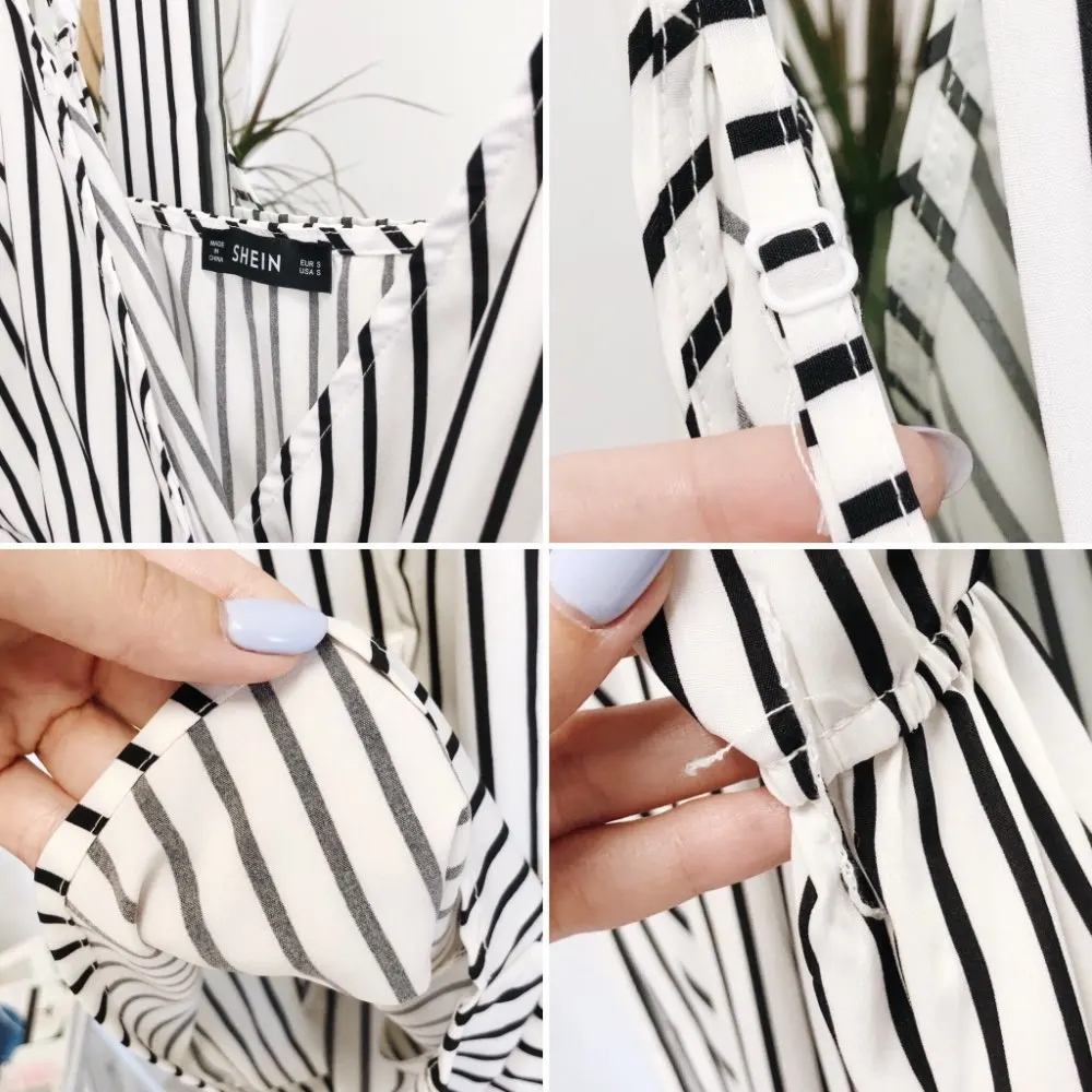 Onesie polyester and spantex white black striped, cross on the front and equipped with a long tuck into thin belt loops. Comfortable fabric and comfortable suitable to summer. The length of shorts is perfect: nor too short nor too long. I wear a size m and are high 162 cm and size M is perfect. Adattissimo for going to the beach, I find it also perfect for a hot day in the city and, wishing, for a casual evening. . What to say to this shop? Shein is a store really outstanding! Customer service is courteous and helpful, the quality of its goods is very good, it has great care in packing in individual envelopes with company logo equipped with zipper, the latest shipments arrived free with courier in one week! VE I highly recommend it. I definitely ricomprerò.