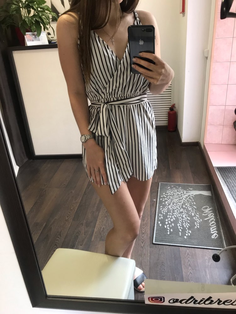 Onesie polyester and spantex white black striped, cross on the front and equipped with a long tuck into thin belt loops. Comfortable fabric and comfortable suitable to summer. The length of shorts is perfect: nor too short nor too long. I wear a size m and are high 162 cm and size M is perfect. Adattissimo for going to the beach, I find it also perfect for a hot day in the city and, wishing, for a casual evening. . What to say to this shop? Shein is a store really outstanding! Customer service is courteous and helpful, the quality of its goods is very good, it has great care in packing in individual envelopes with company logo equipped with zipper, the latest shipments arrived free with courier in one week! VE I highly recommend it. I definitely ricomprerò.