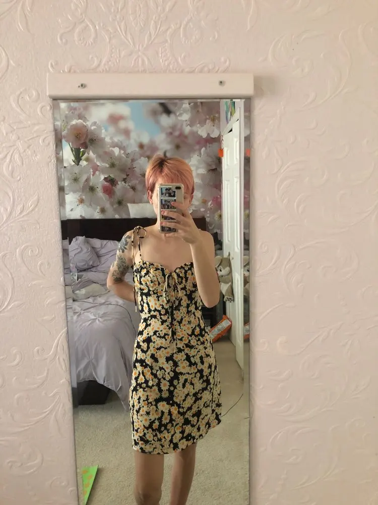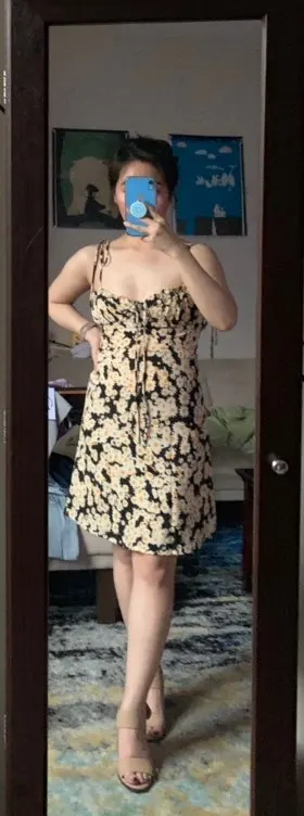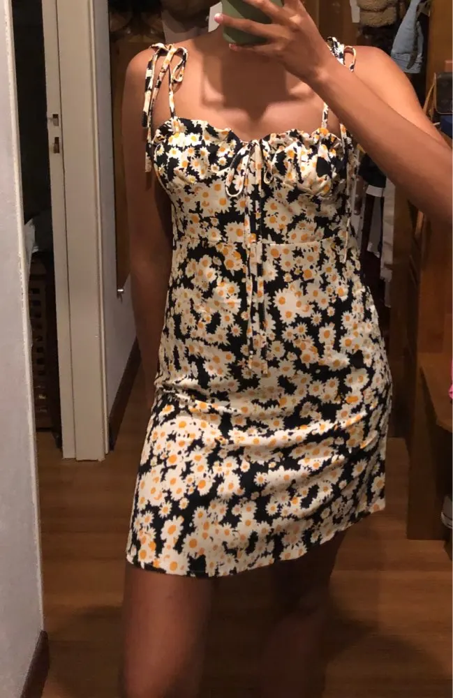 I love this dress!! I gave it 5 stars cause it matches the description and it came within the time it said it would. However, it is a little small on me :( I am in between a small/medium and I got a small because I have a small chest and I was worried the boob part might be too big in a medium but it’s actually a little tight/too short. That’s my fault though, just size up if you’re worried! It’s super cute so I’ll definitely still wear it just not as covering as I would like.
