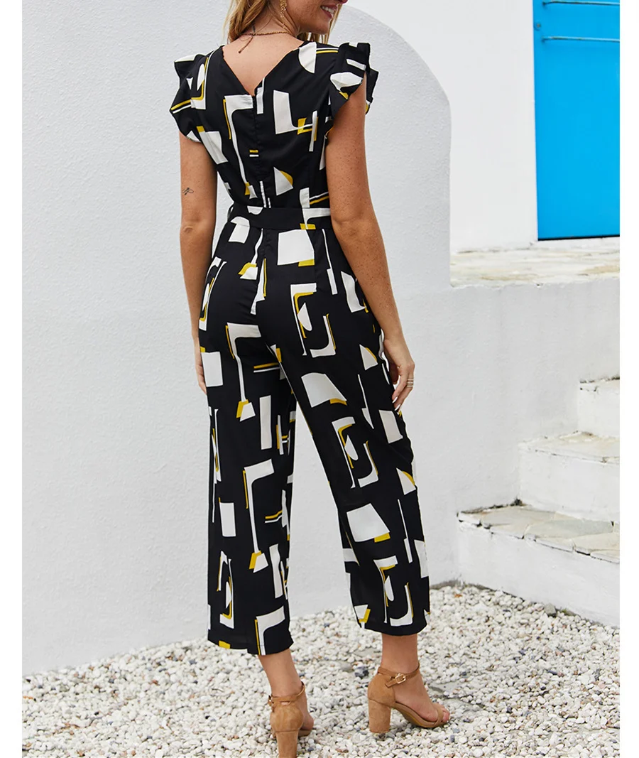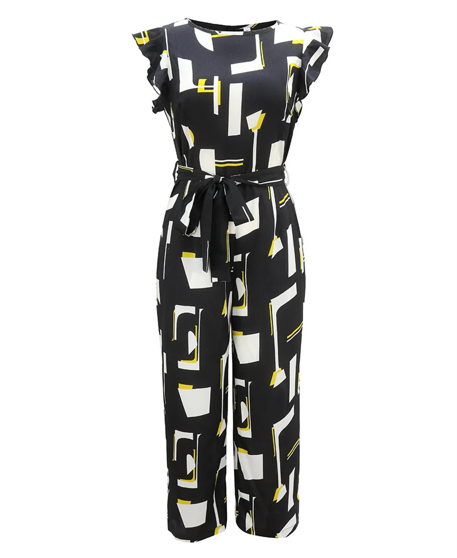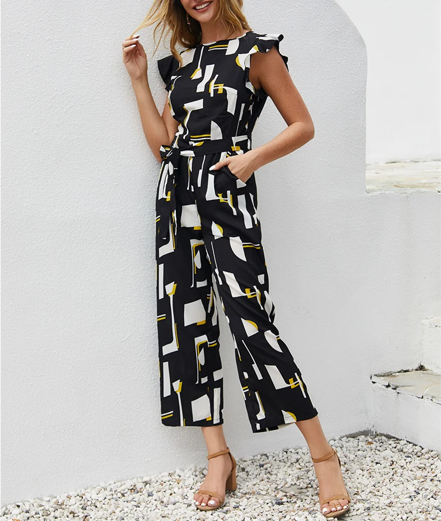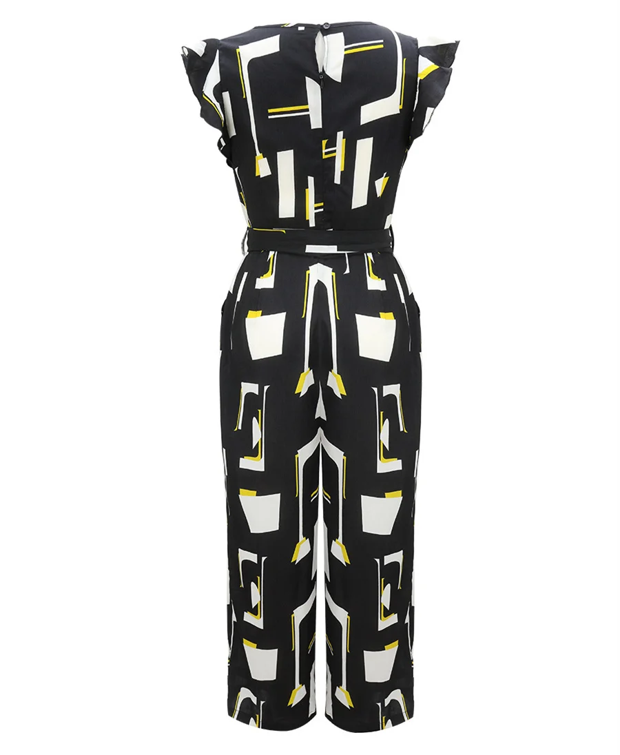FREE SHIPPING Summer Black Print Jumpsuit Women Streetwear O-Neck Ruffles Sleeve Pocket Casual Rompers Women Sashes Overall Jumpsuit JKP2432