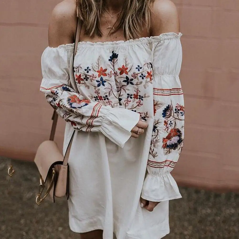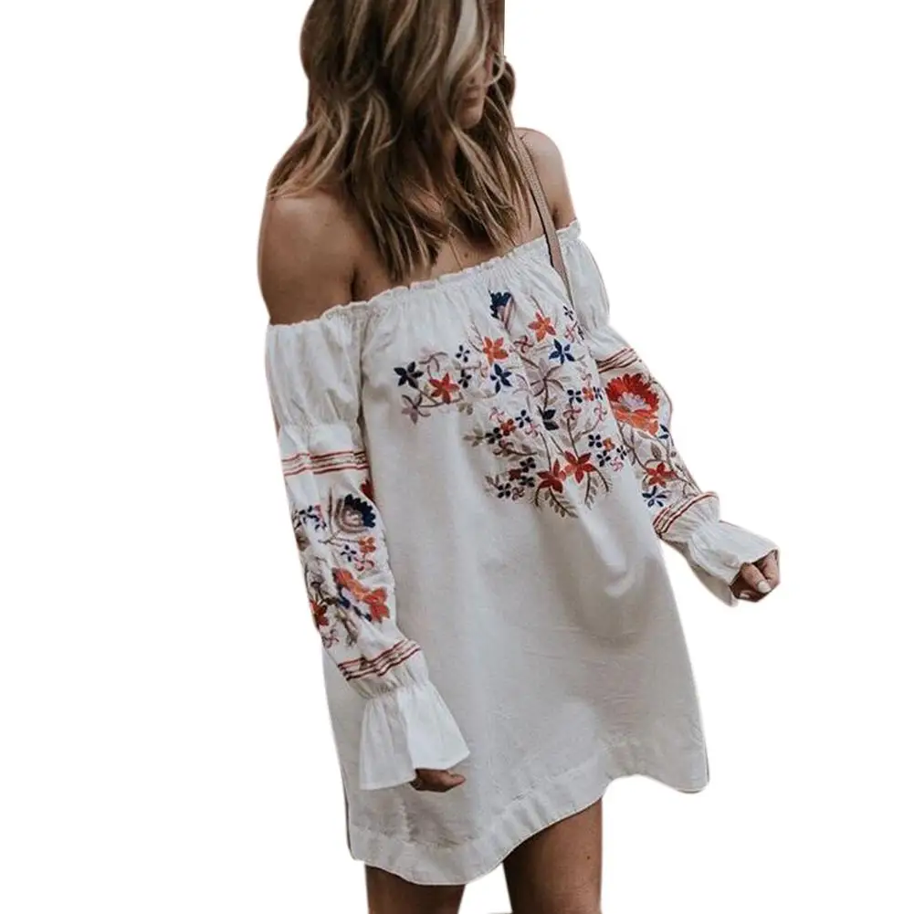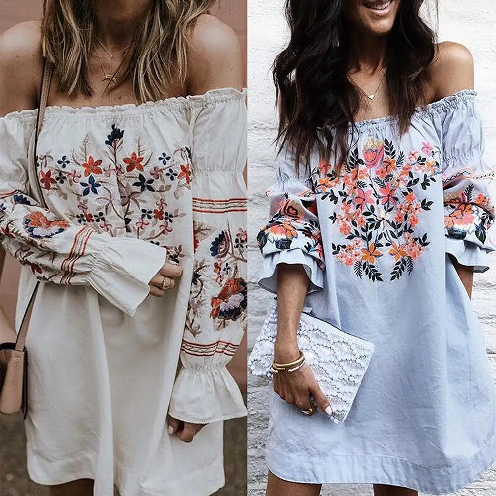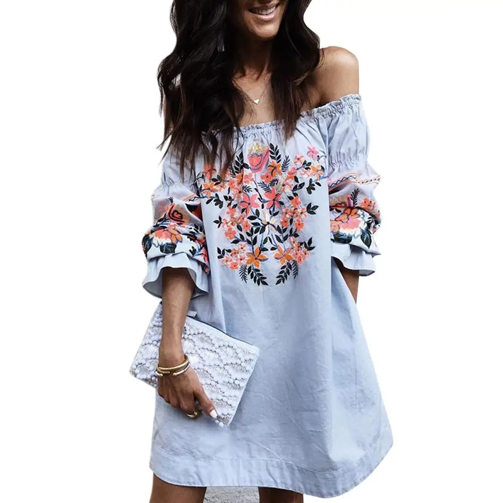 FREE SHIPPING Summer Fashion Womens Loose Casual Ladies Off The Shoulder Petal Sleeve Bardot Button Evening Mini Dress JKP2513