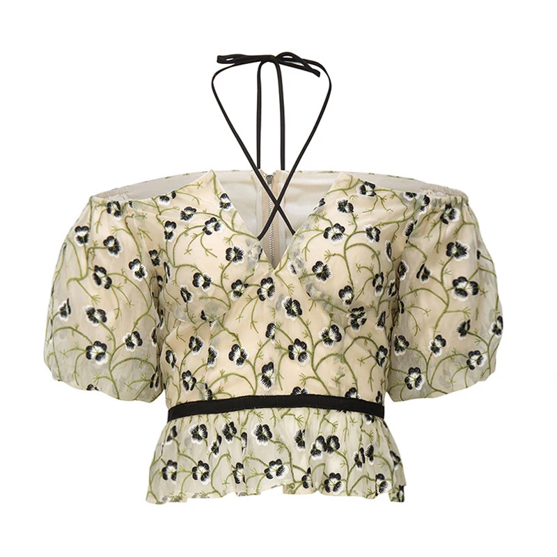 FREE SHIPPING Summer Flower Embroidery Women Shirt Slash Neck Off Shoulder Puff Sleeve Crop Top Blouse Top Female Fashion New JKP2124