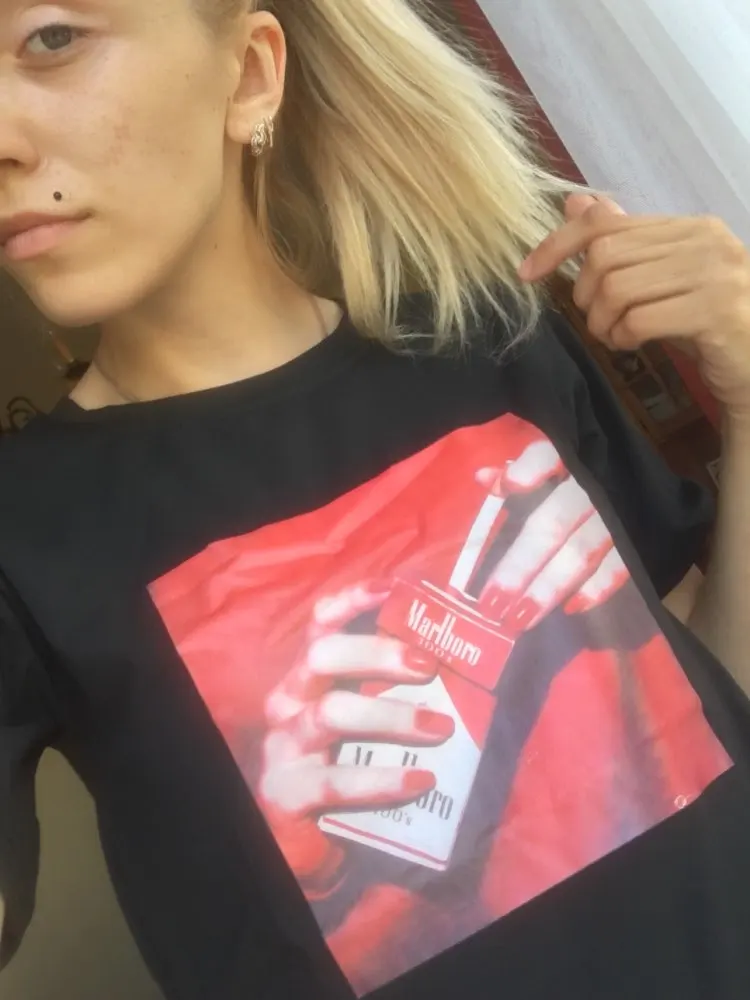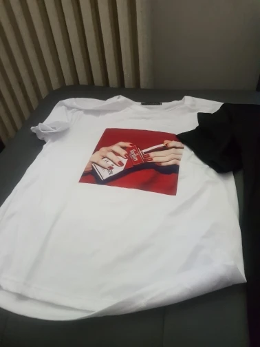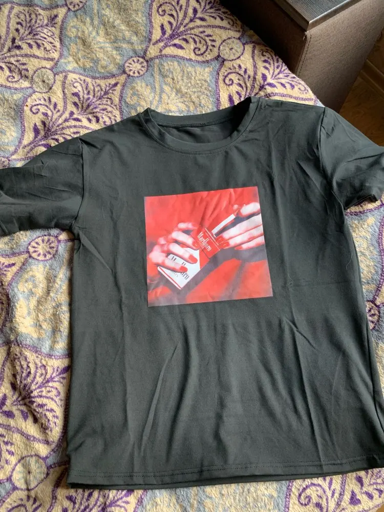T-shirt is cool. The seams are even, the sticker is cool, the size approached The problem is the quality of the material! Synthetics 100% is very hot.