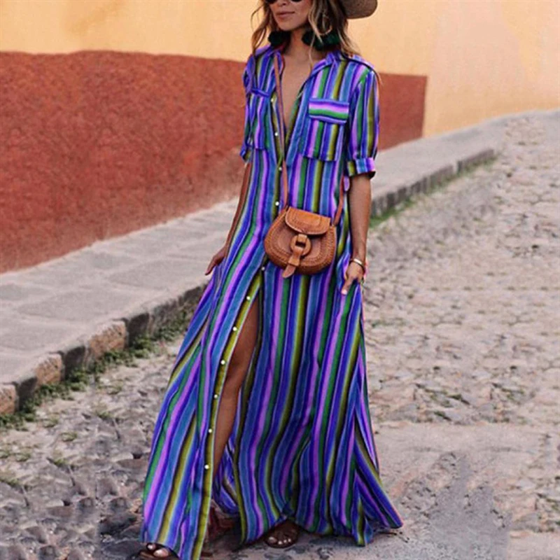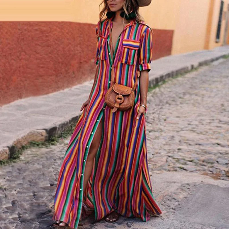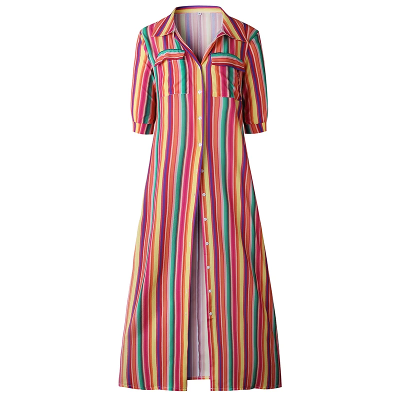 FREE SHIPPING Summer Rainbow Striped Dress Women Buttons Long Shirt Maxi Dres Bohemia Half Sleeve Beach Party Robe Plus Size 3XL JKP1521