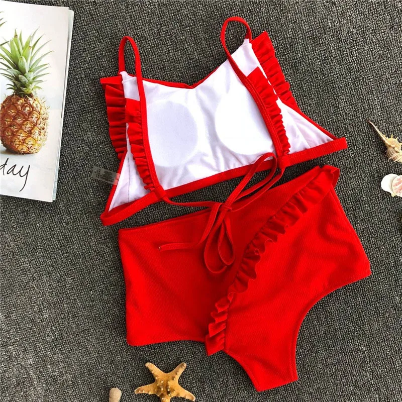 FREE SHIPPING Summer Ruffle High Waist Bikini Biquinis Wine RED Tank Push Up Swimsuit Beach Wear High Neck Swimwear Women Maillot De Bain JKP2779