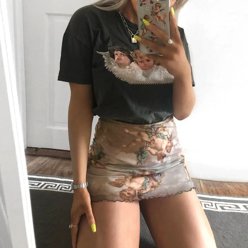 FREE SHIPPING Summer Skirt Angel Print Mesh Patchwork Double Layer Trend Hip Skirt JKP1469