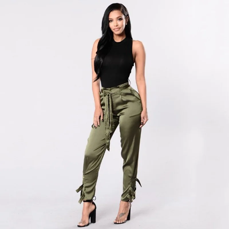 FREE SHIPPING Summer Women Pants New Solid Green Pants High Waist Trousers Women Elegant Satin Pants Women Clothing Laides Pants JKP1920