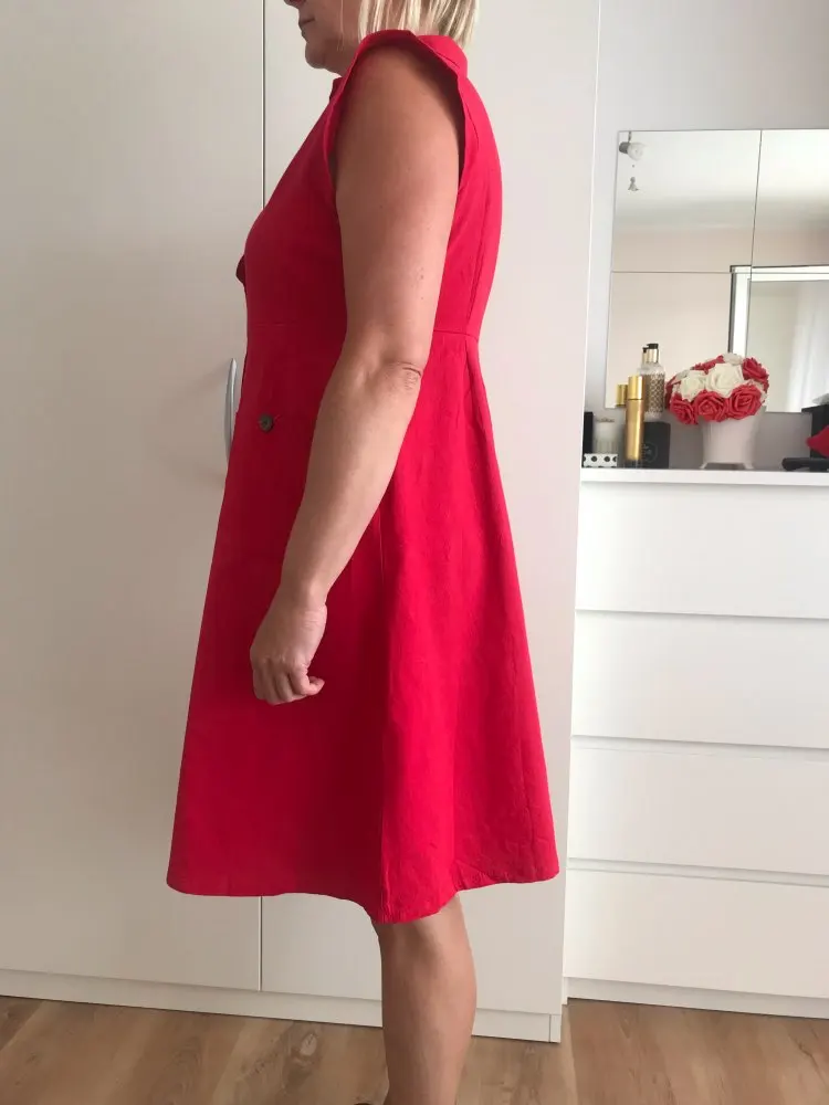 The dress was pleasant, the fabric is excellent, the size of 52-54 is a bit big but not critical.