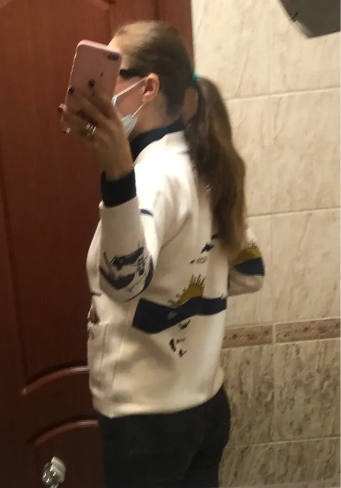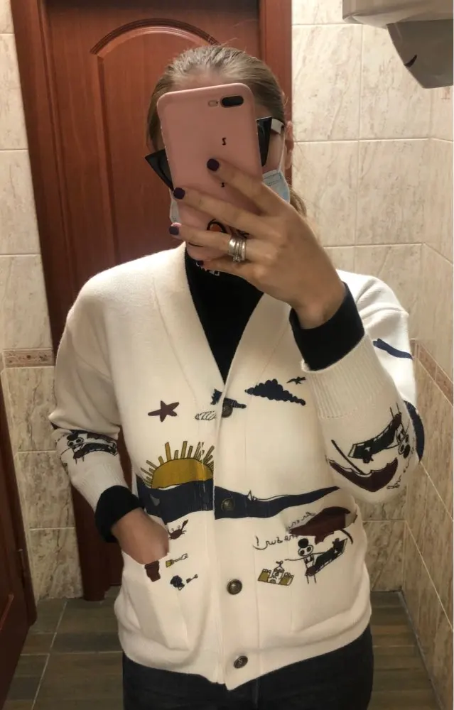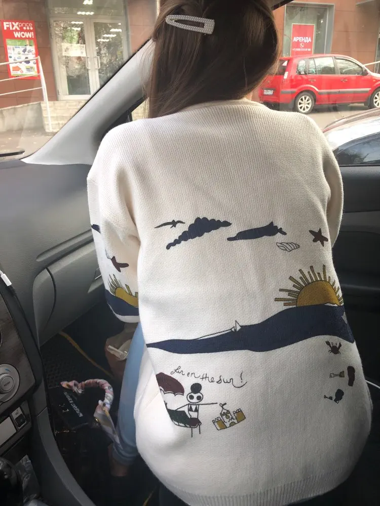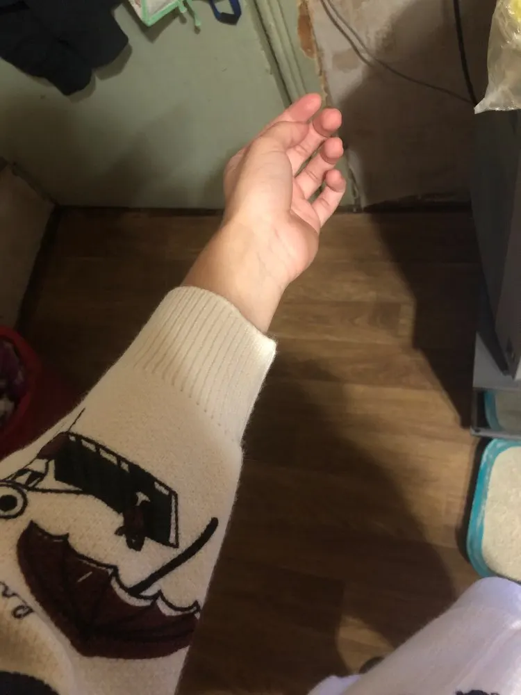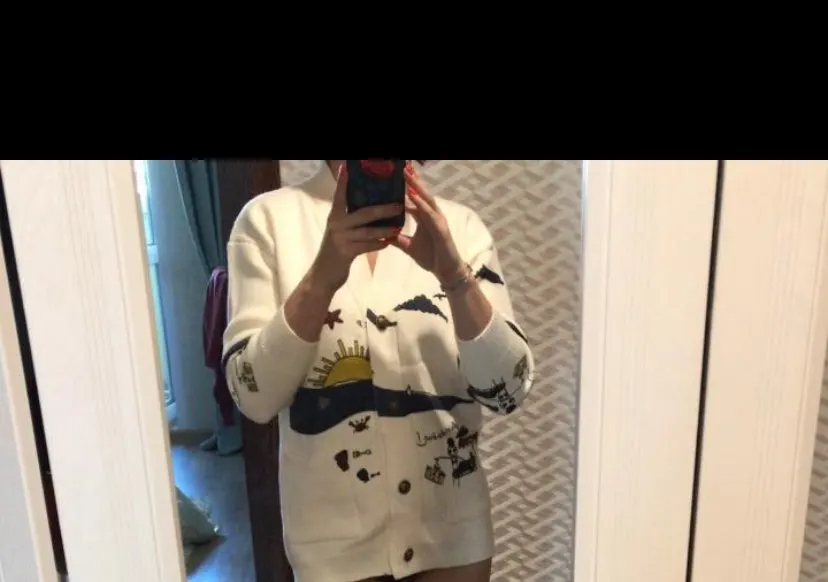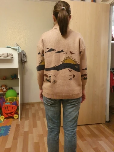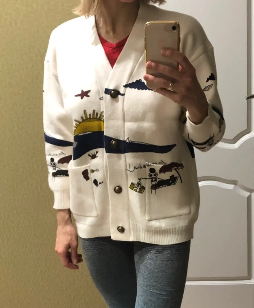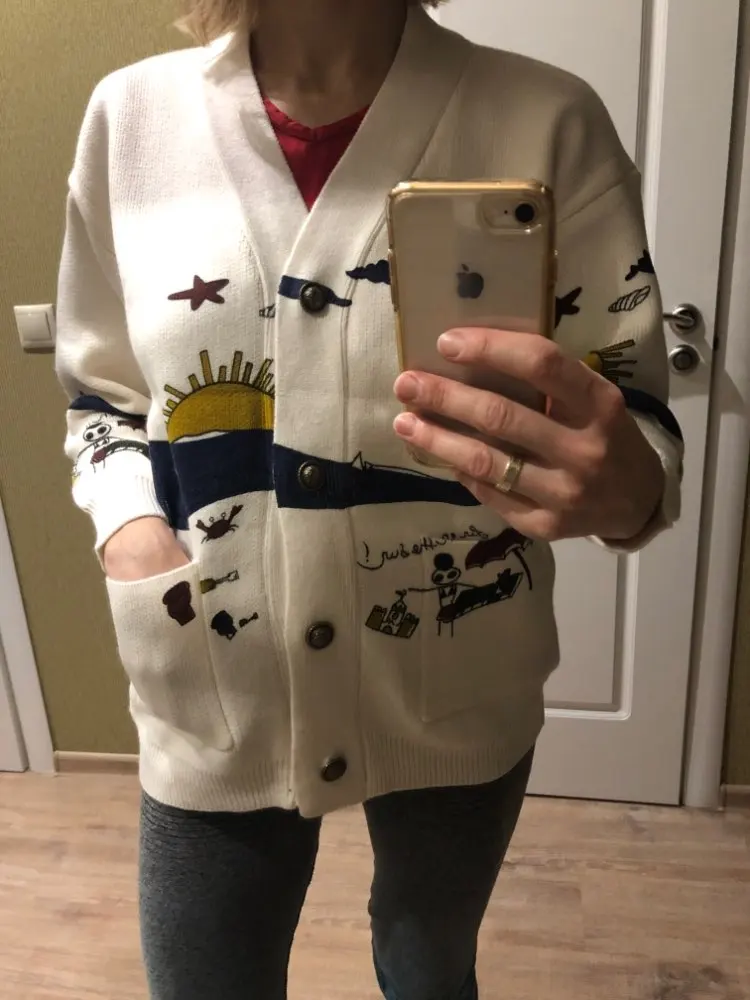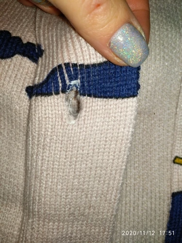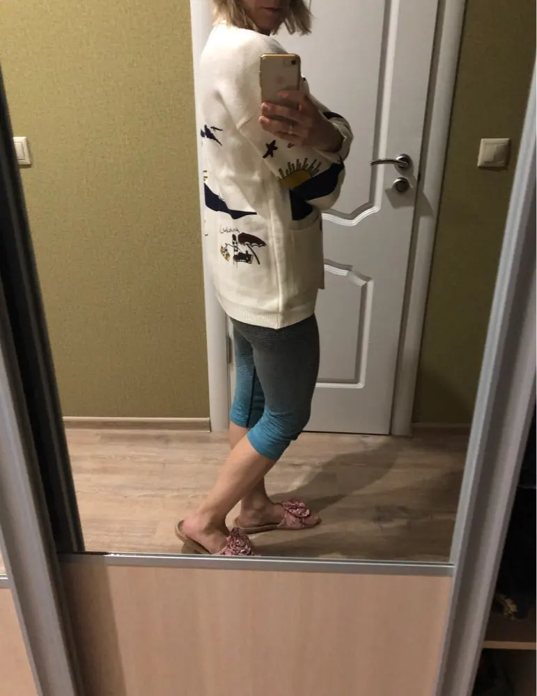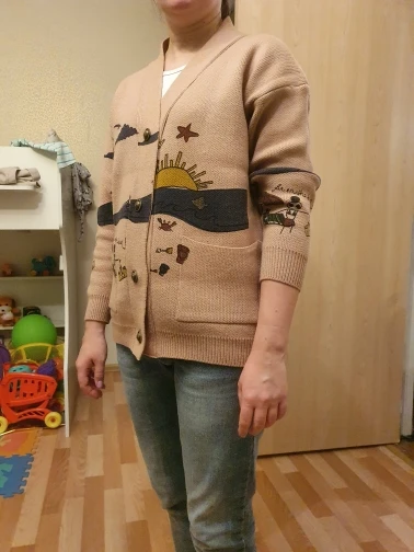 I really wanted this cardigan, so the shortcomings (in the photo) I was not confused-the drawing in one place because of the thread printed unclearly. The goods came within three weeks to Kazan. The material is very pleasant, dense, synthetics are not felt. On height 164, almost the full size of the sleeve. Now at 7 months of pregnancy on the pool is fastened. After pregnancy will be oversize. On the internet it is sold 3 times more expensive, so I was ready to wait. Thanks for the gift-rubber for hair.