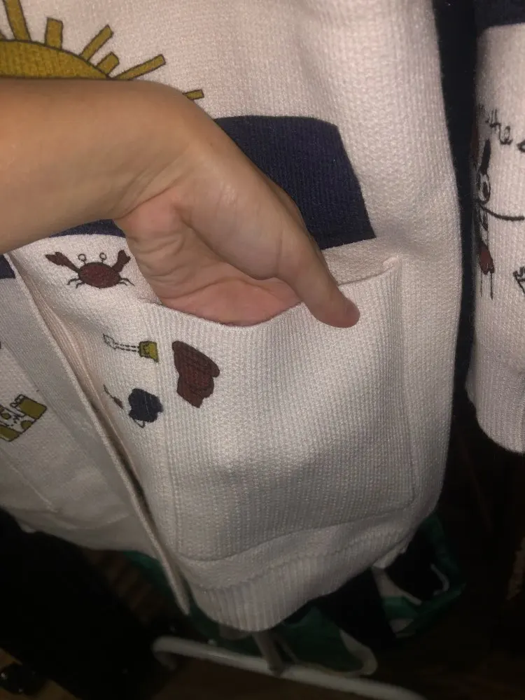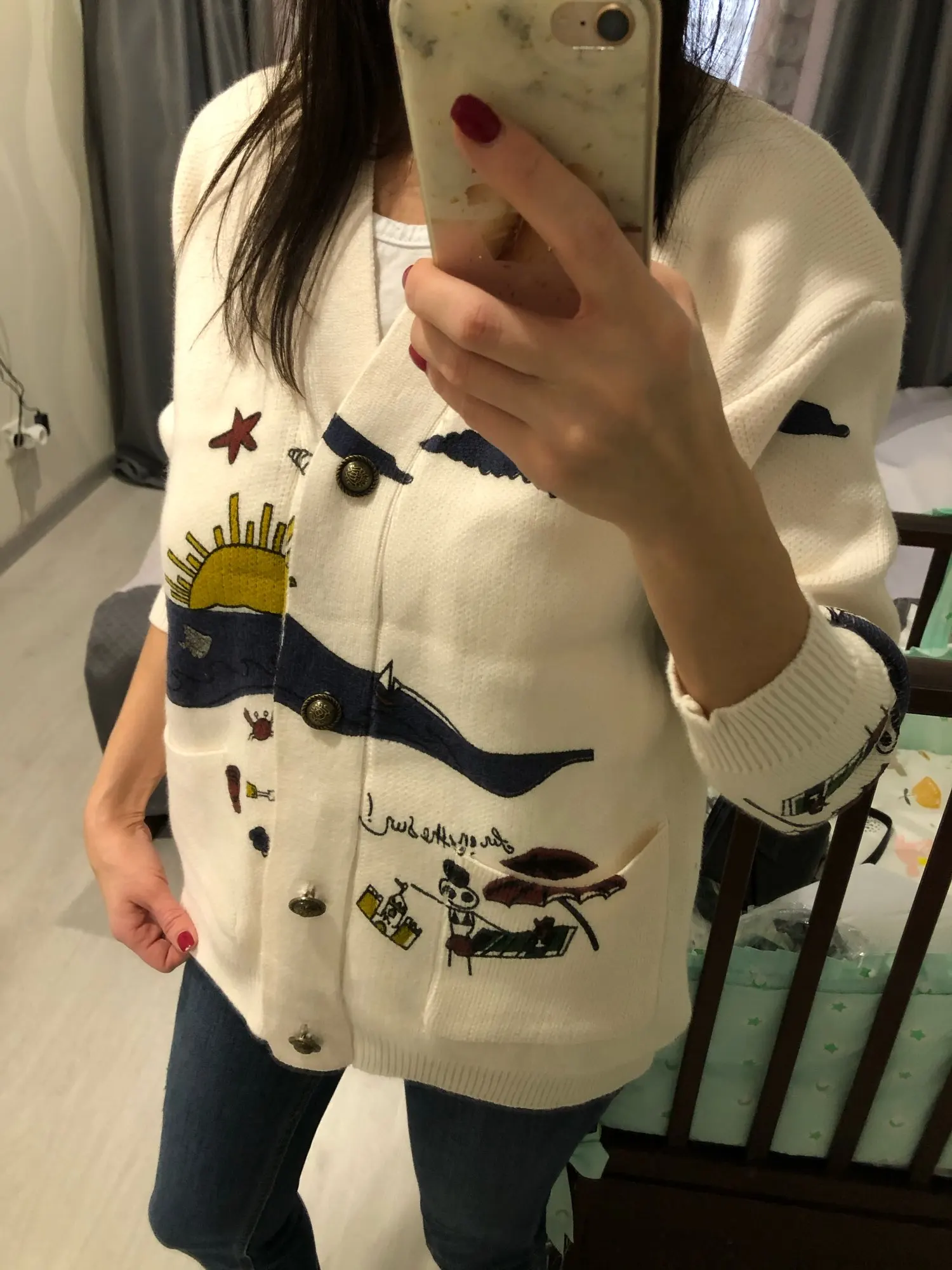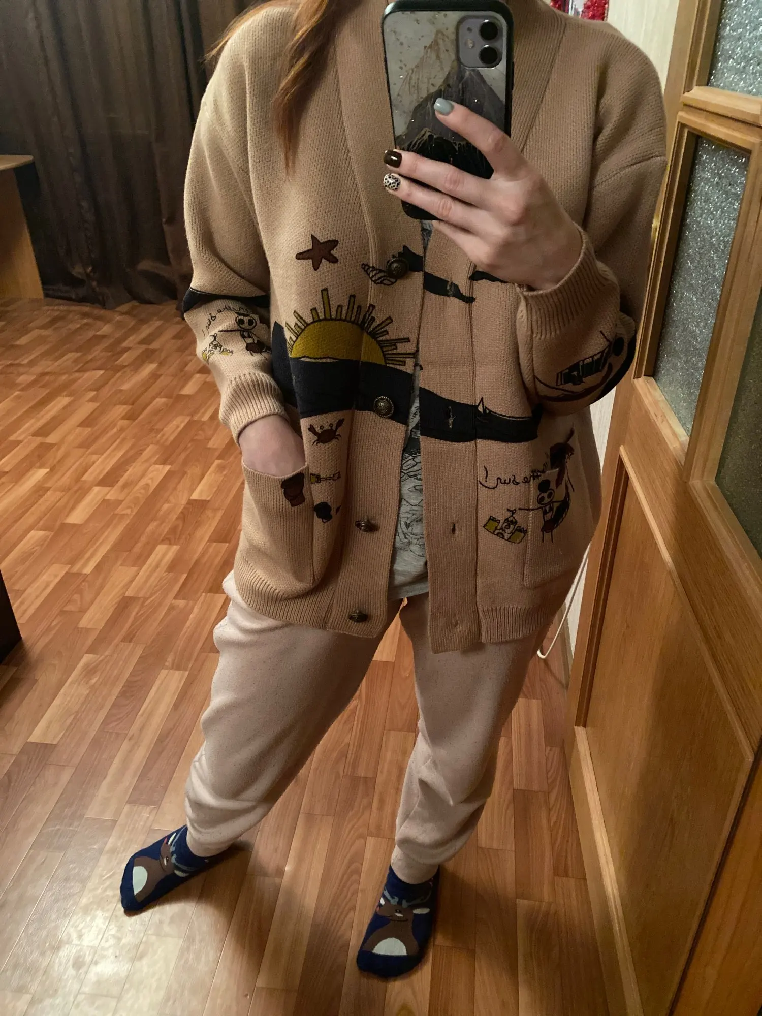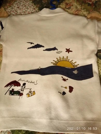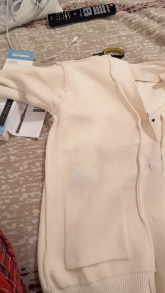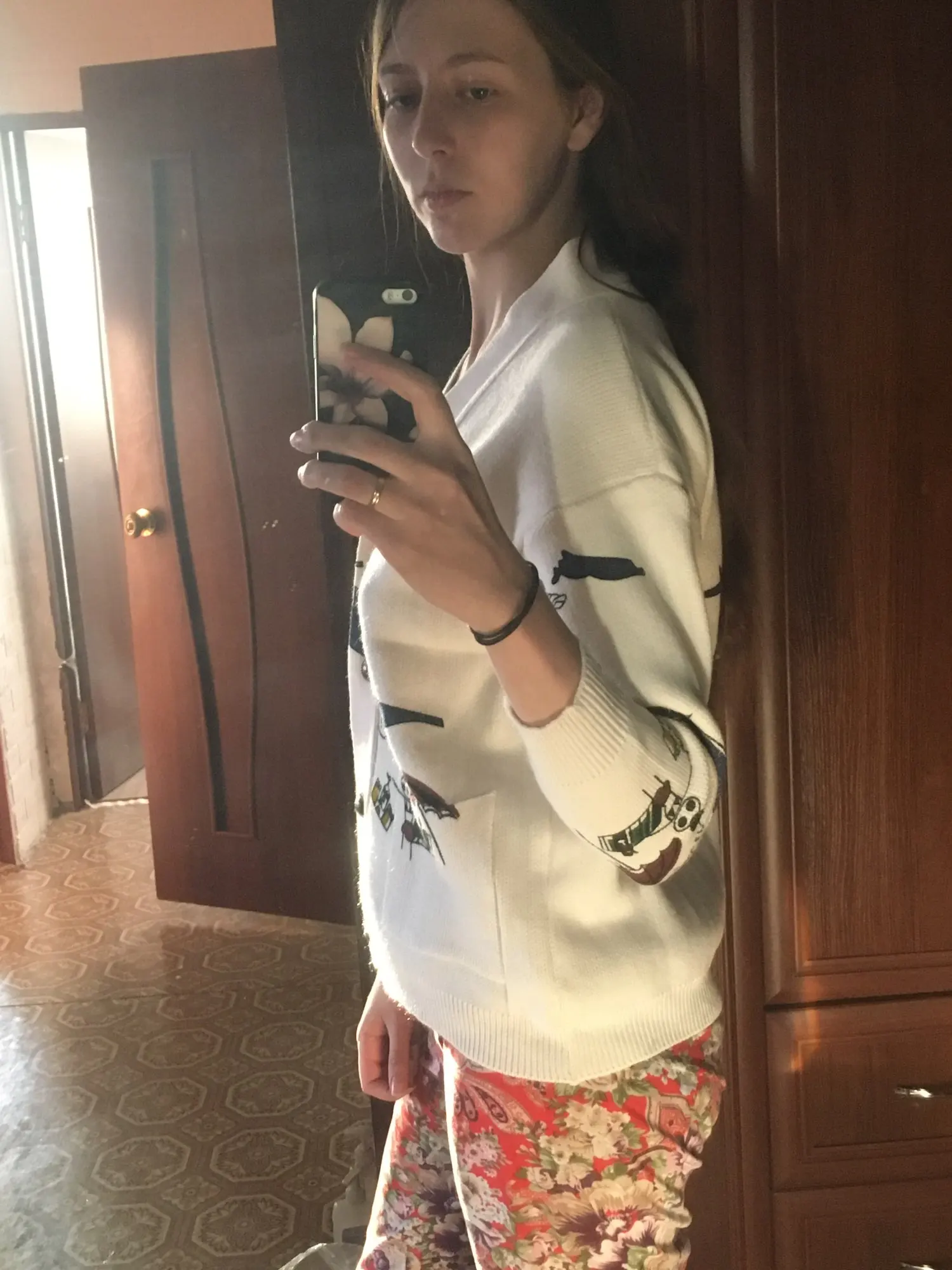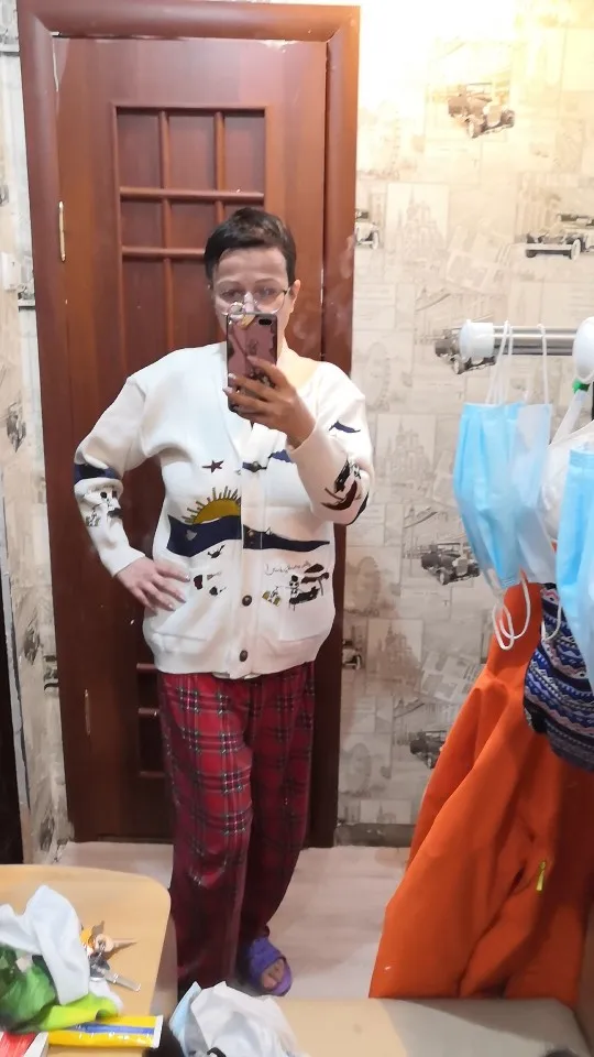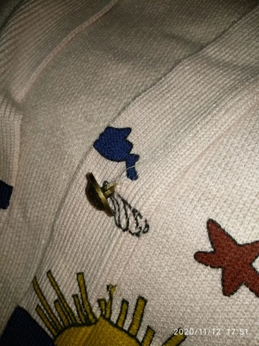 I really wanted this cardigan, so the shortcomings (in the photo) I was not confused-the drawing in one place because of the thread printed unclearly. The goods came within three weeks to Kazan. The material is very pleasant, dense, synthetics are not felt. On height 164, almost the full size of the sleeve. Now at 7 months of pregnancy on the pool is fastened. After pregnancy will be oversize. On the internet it is sold 3 times more expensive, so I was ready to wait. Thanks for the gift-rubber for hair.