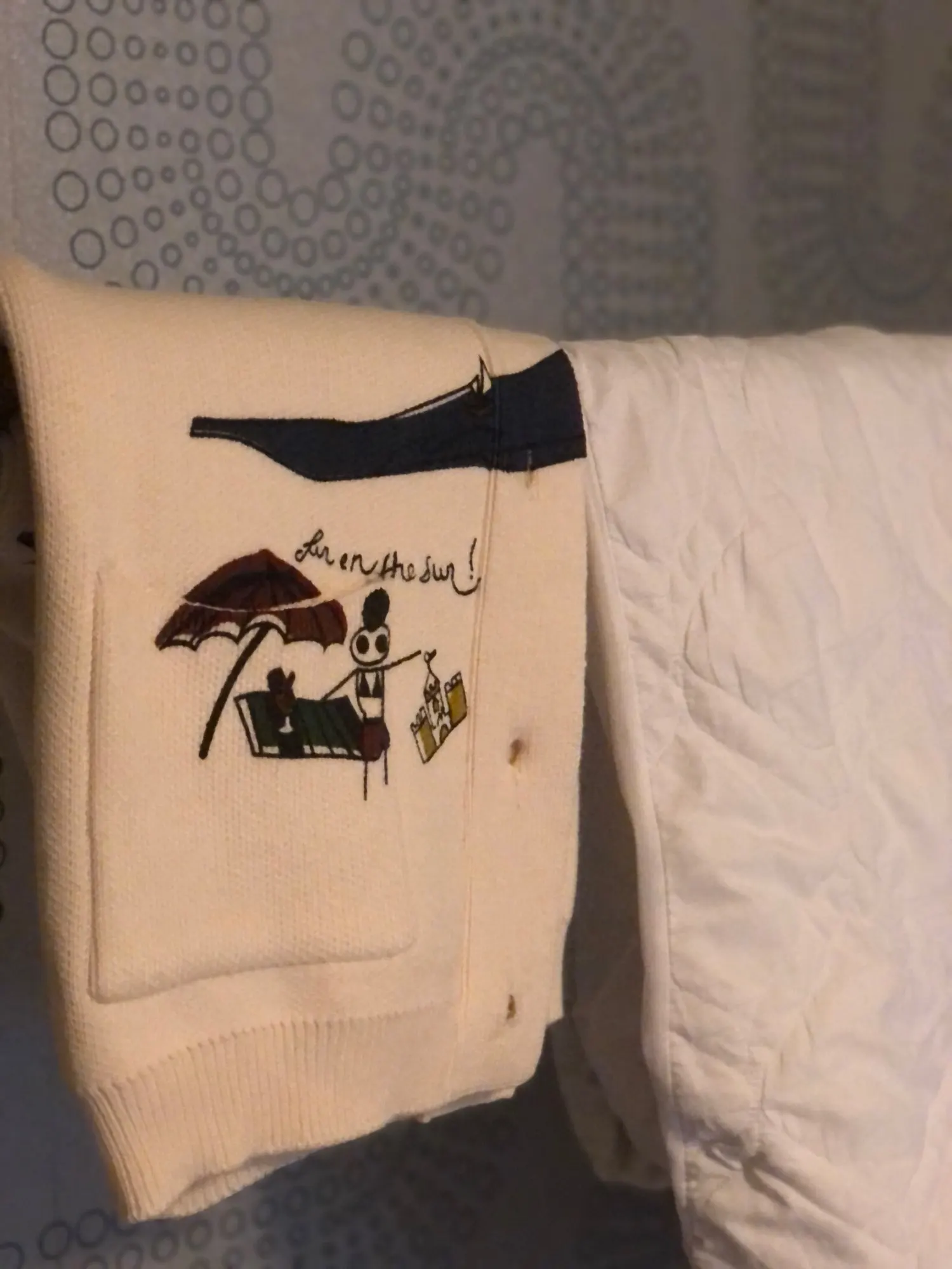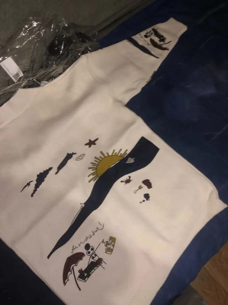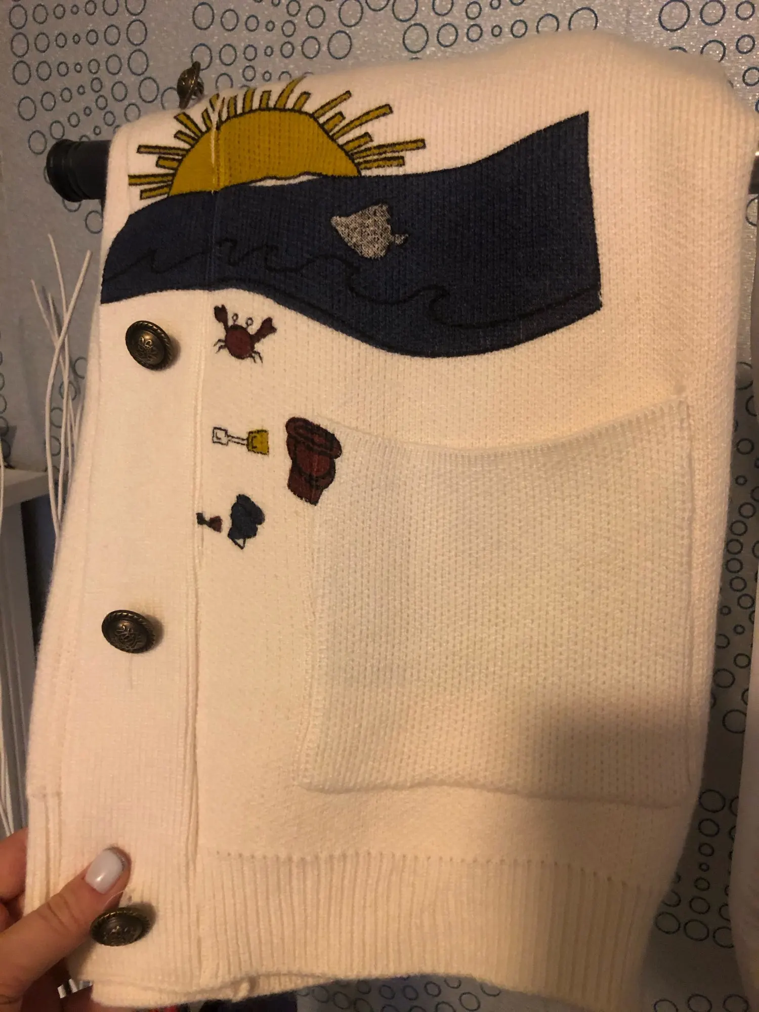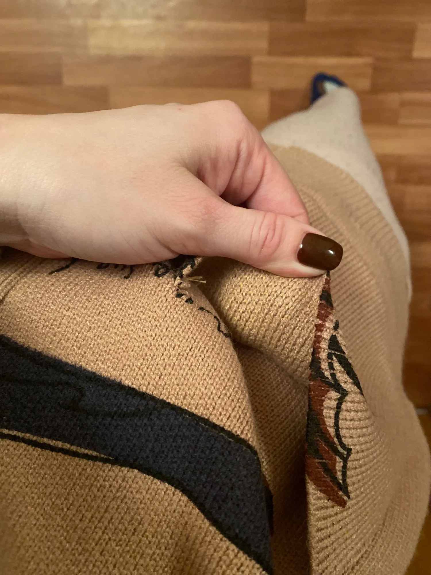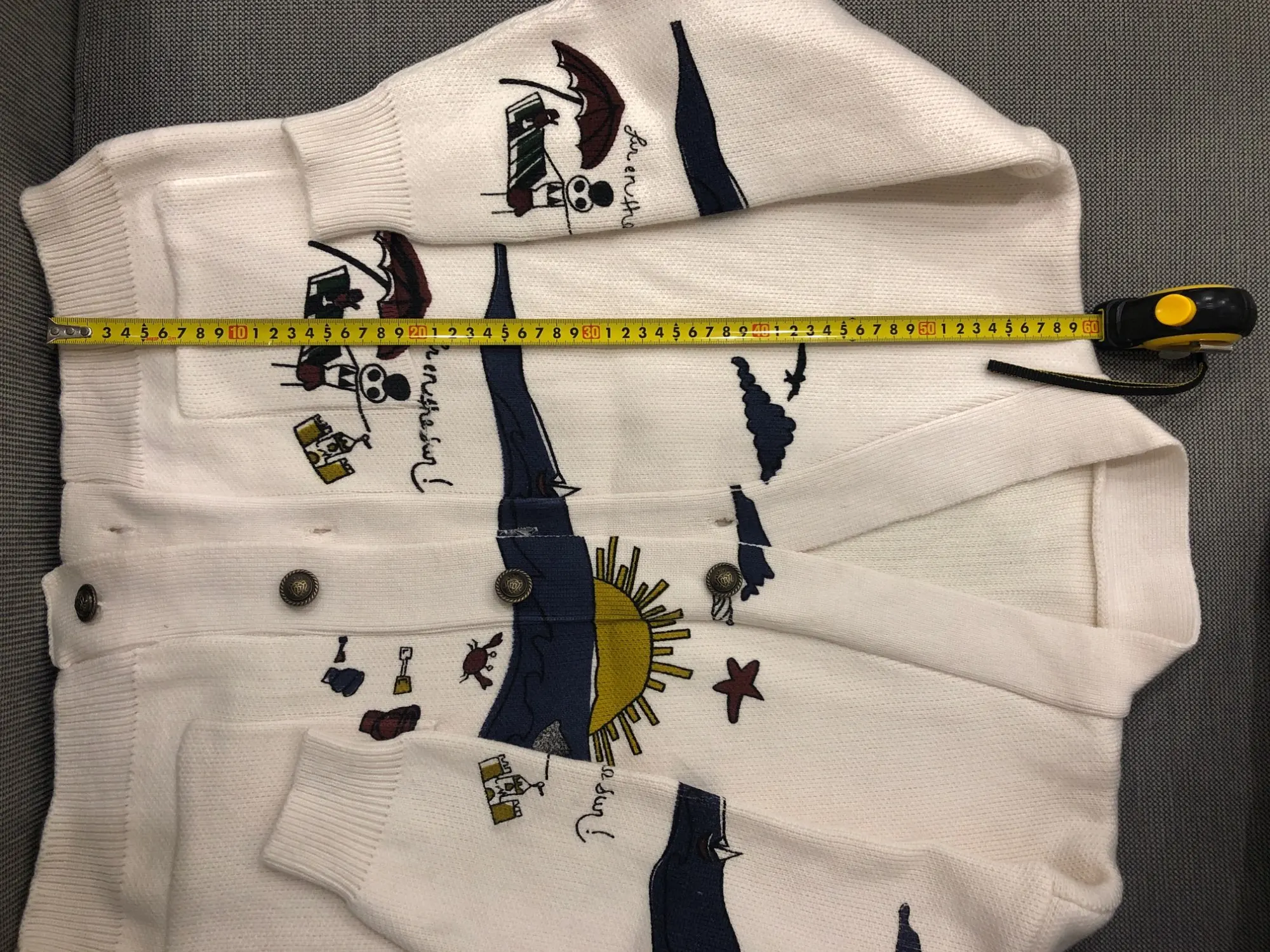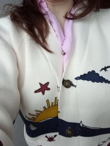 I really wanted this cardigan, so the shortcomings (in the photo) I was not confused-the drawing in one place because of the thread printed unclearly. The goods came within three weeks to Kazan. The material is very pleasant, dense, synthetics are not felt. On height 164, almost the full size of the sleeve. Now at 7 months of pregnancy on the pool is fastened. After pregnancy will be oversize. On the internet it is sold 3 times more expensive, so I was ready to wait. Thanks for the gift-rubber for hair.