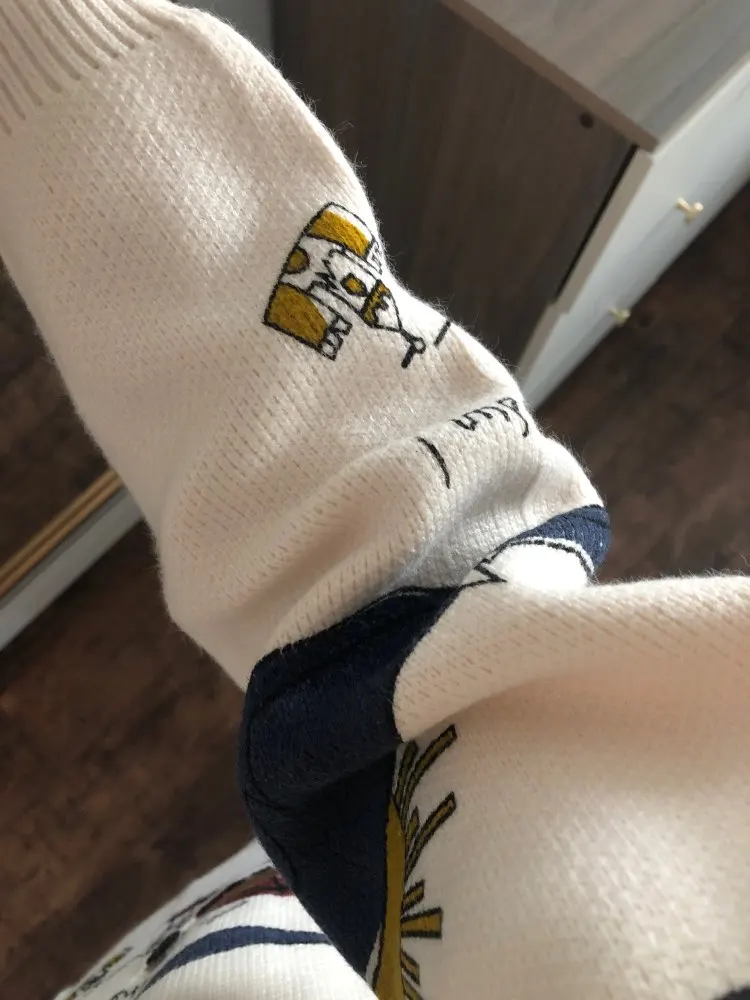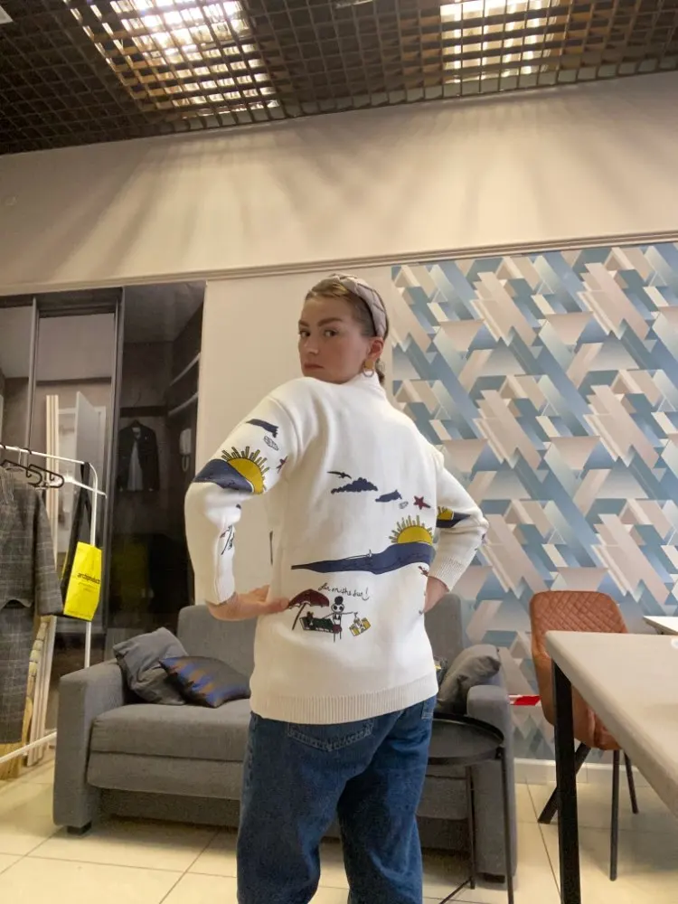 Nice sweater! Dense, but pleasant to the body, not thick, warm. Sleeves 7/8, I'm very comfortable. Recommend. The coloring is awesome, the drawing is clear, bright, did not wash yet, I hope so and will remain.