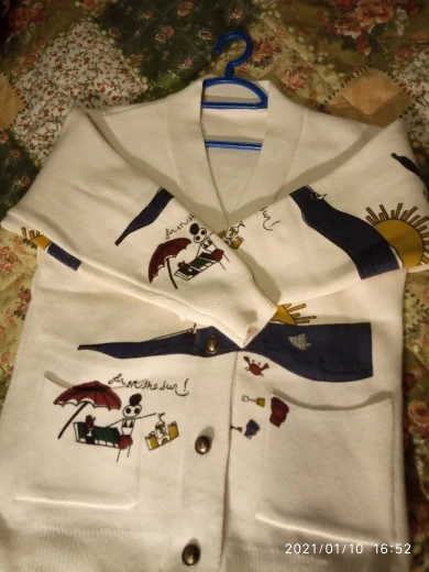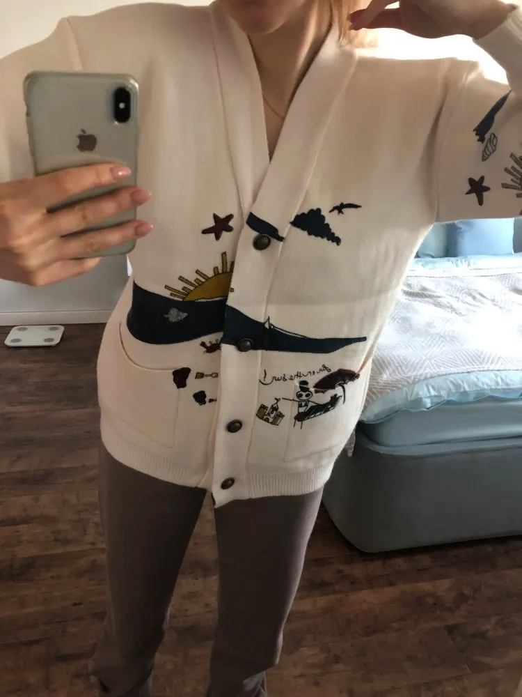 Nice cardigan. Very dense, you can easily wear in cool weather both in summer and autumn. Sewing is also good. There is no thread anywhere, smell too. At 46 the size perfectly approached.