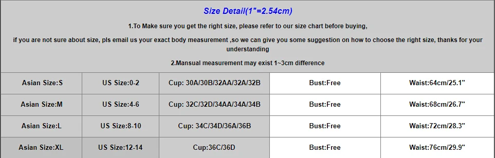 Size Detail(1″=2.54cm) 1.To Make sure you get the right size, please refer to our size chart before buying, if you are not sure about size, pls email us your exact body measurement ,so we can give you some suggestion on how to choose the right size, thanks for your understanding 2.Mansual measurement may exist 1~3cm difference |