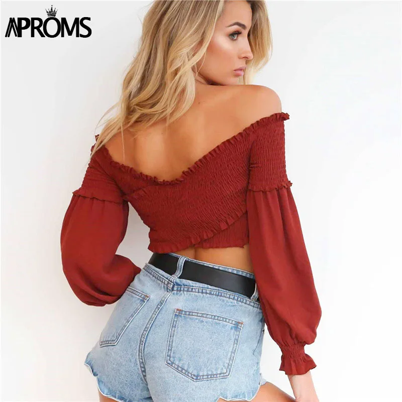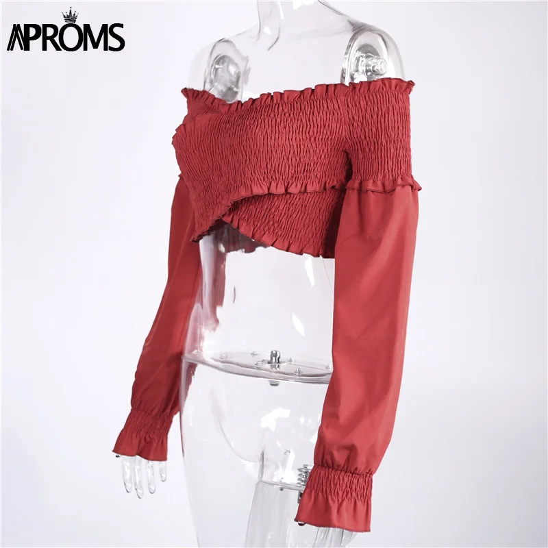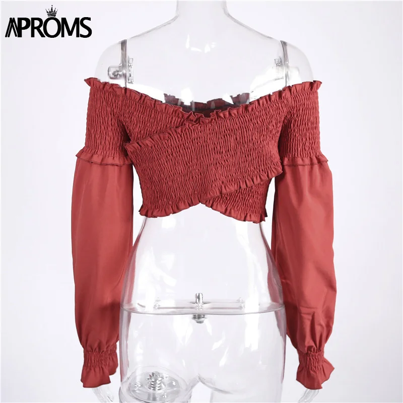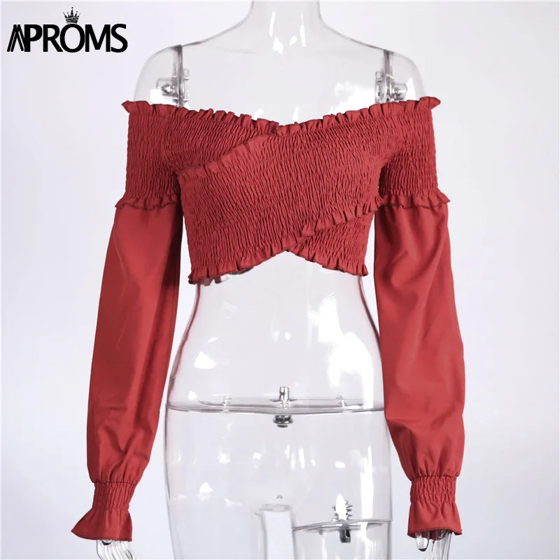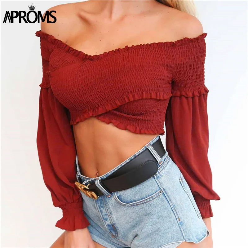 FREE SHIPPING T Shirt Ruched Slash Neck Cropped Off Shoulder Long Sleeve JKP512