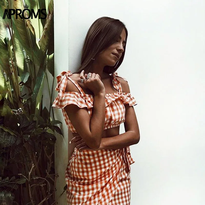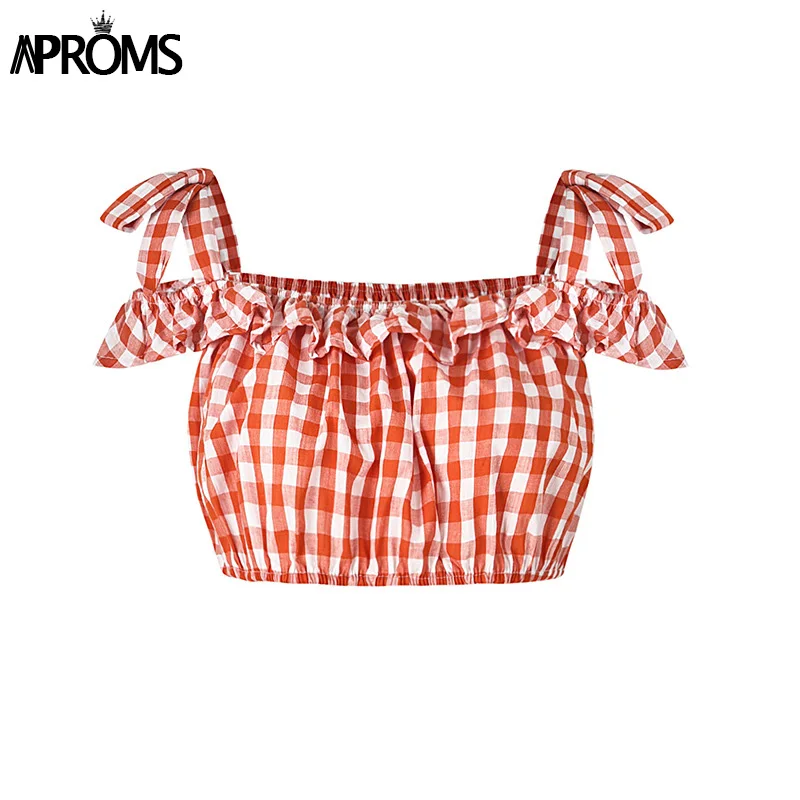 FREE SHIPPING Tie Up Shoulder Plaid Cropped JKP1137