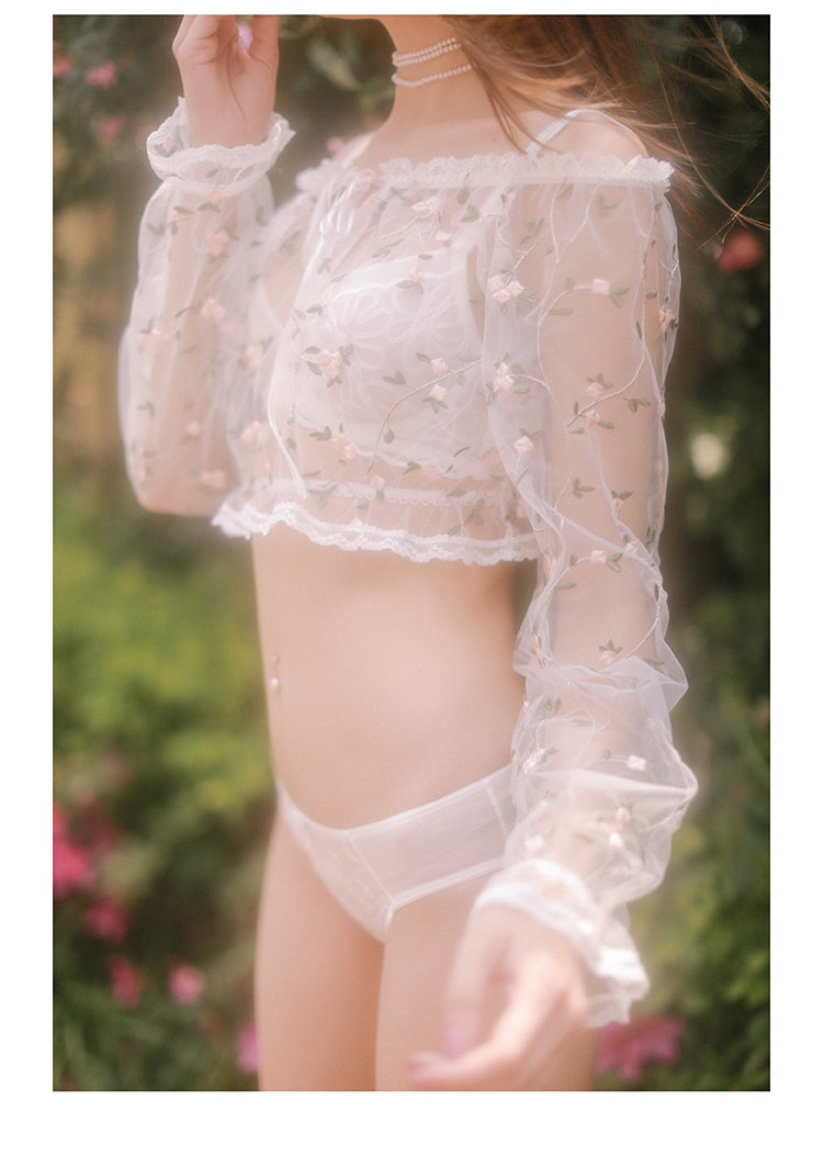 FREE SHIPPING Transparent Lace Edge Underwear Flower Embroidery Slash Neck Long Sleeve Blouse JKP3593