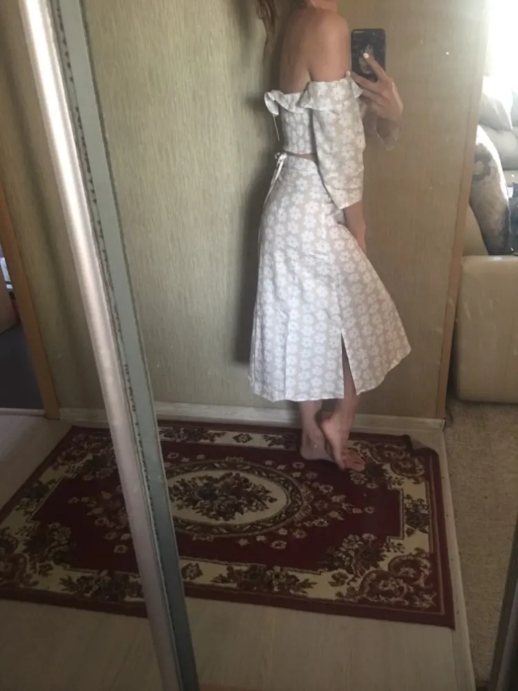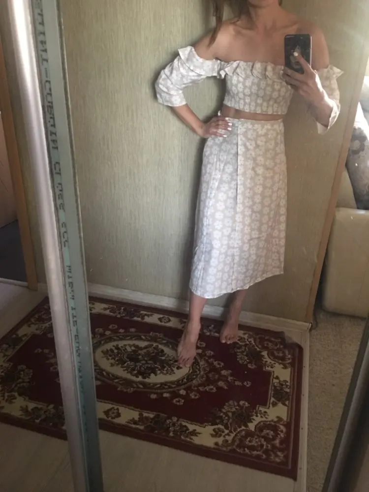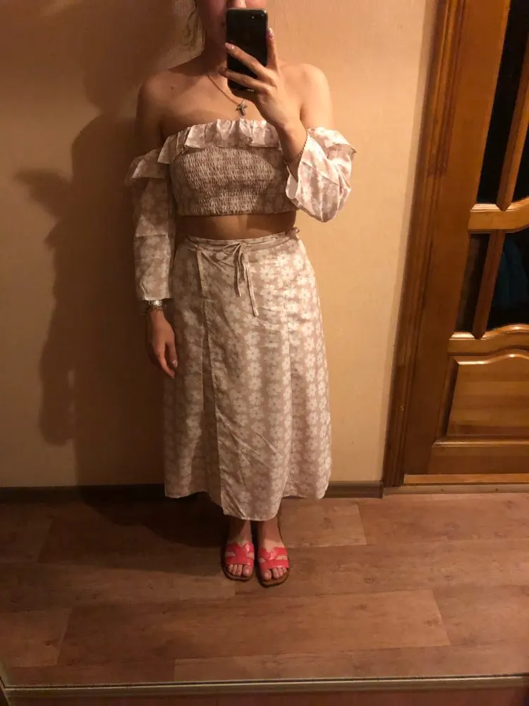 Synthetic fabric, but pleasant. On my parameters (84*63*93) i think it was better to order s, although m is normal. Just sits not as on the model. At a height of 160 there is almost no distance between the skirt and the top. It would be convenient if the sleeves somehow unfastened, but they are sewn. What i really liked is the slings on the skirt for the strings, so that they do not slip. The composition on the product is nowhere specified, the size is indicated on the skirt and on the top, on the top there was still a label.