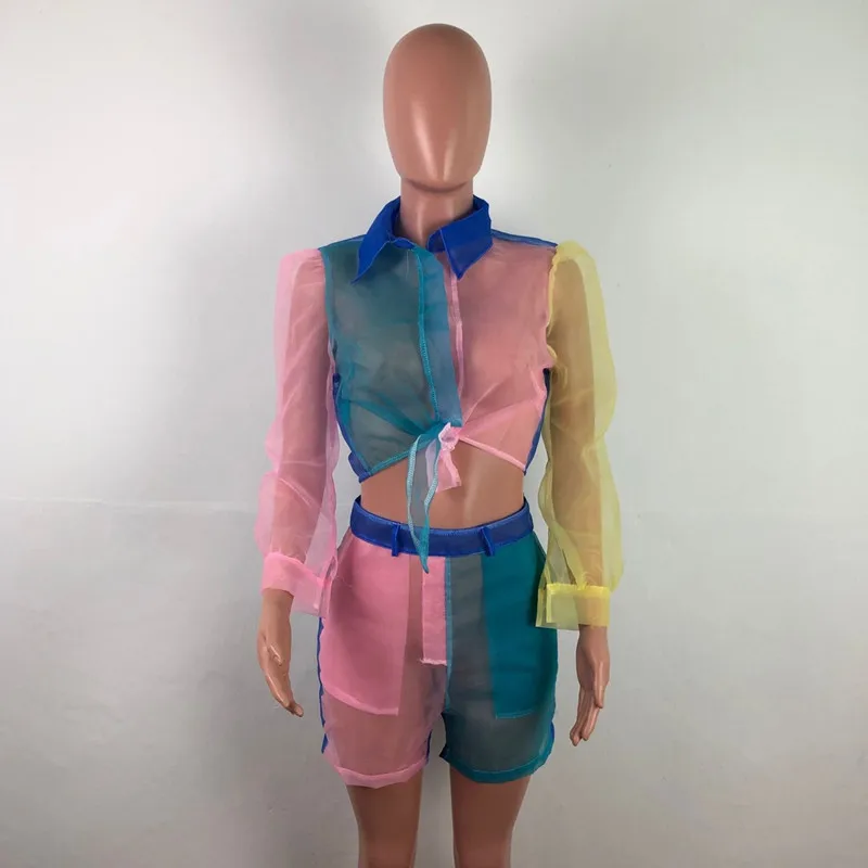 FREE SHIPPING Two Piece Set Women Sexy Clothes Fall 2019 Color Block Mesh Blouse and Short Pants Cute 2 Piece Outfits JKP2059