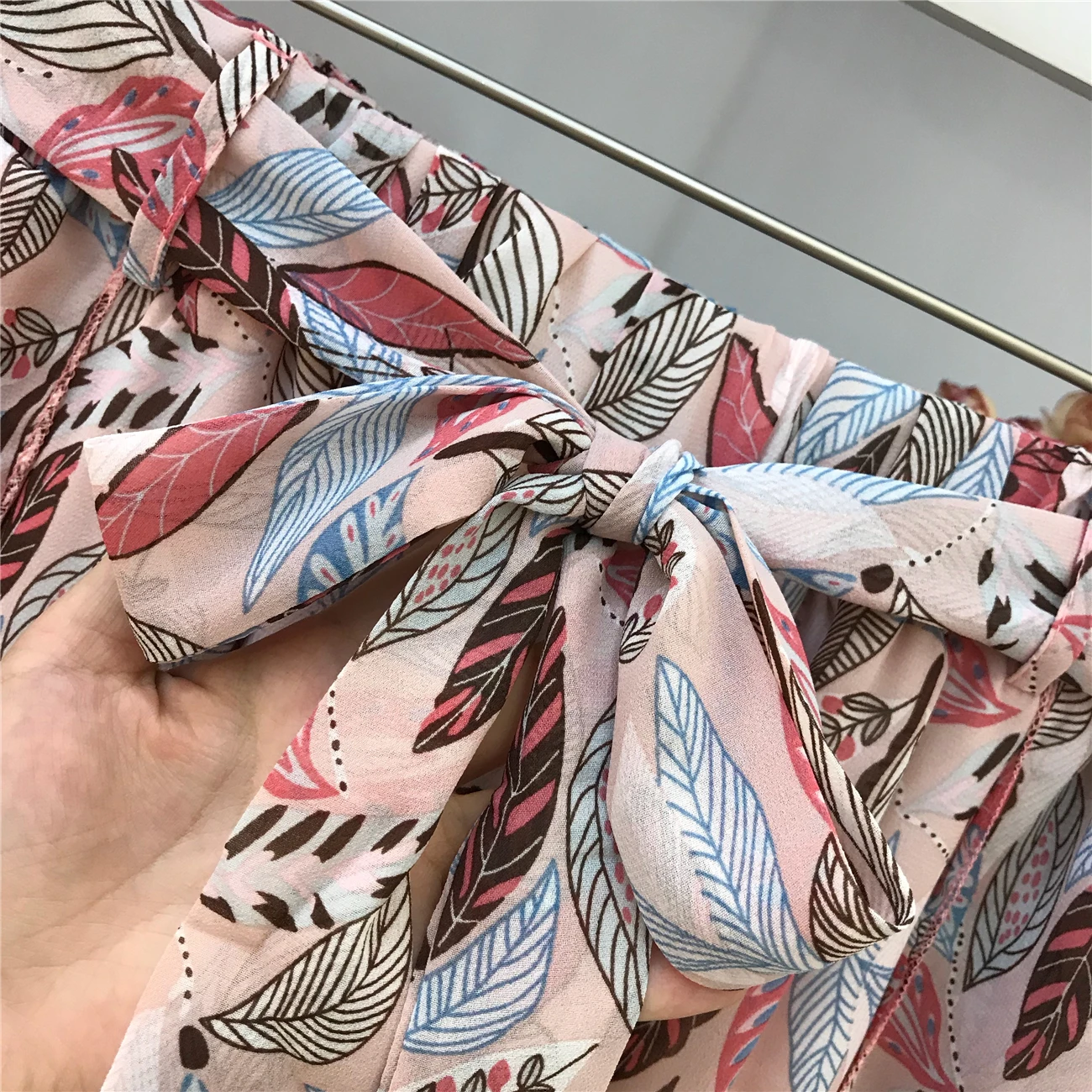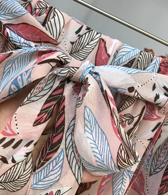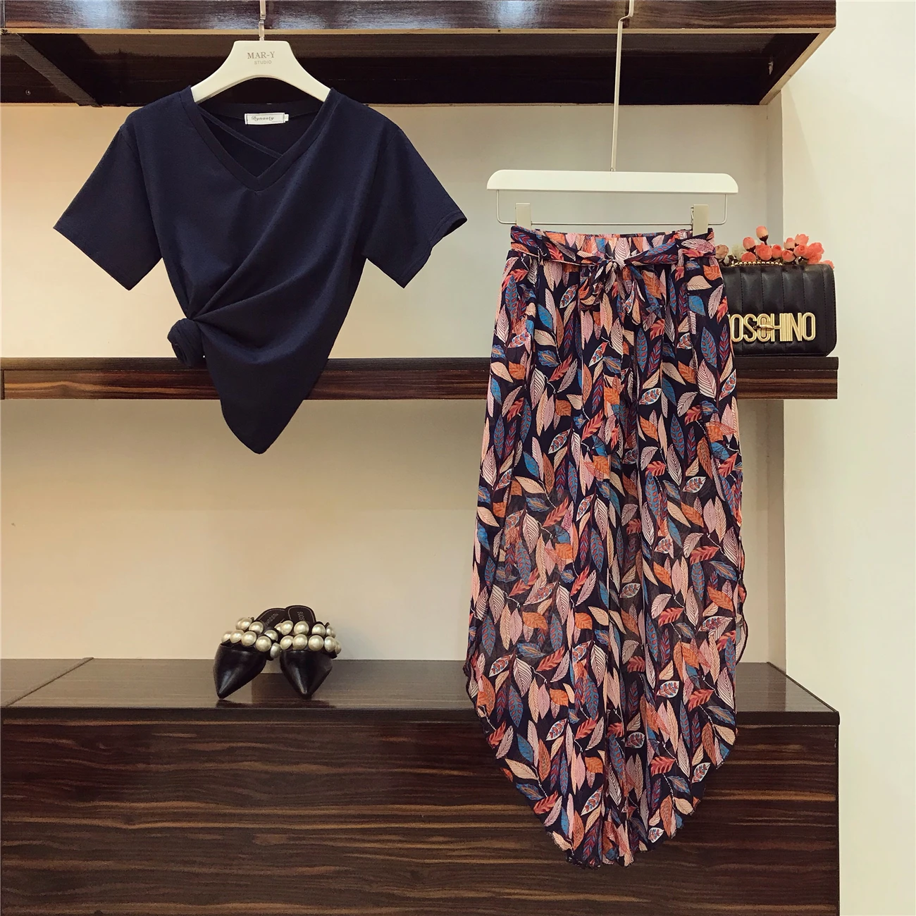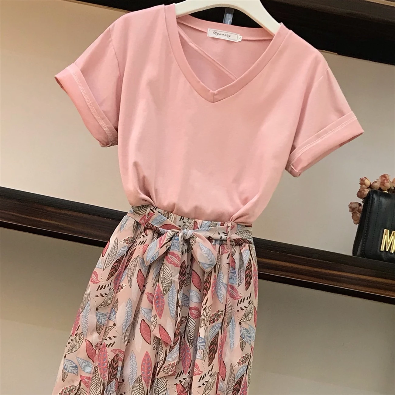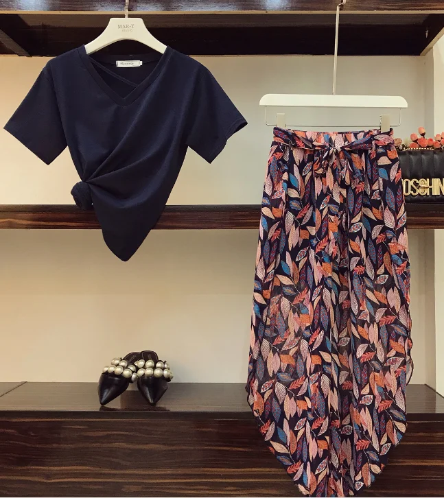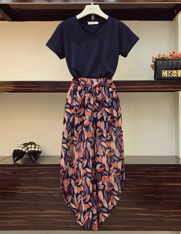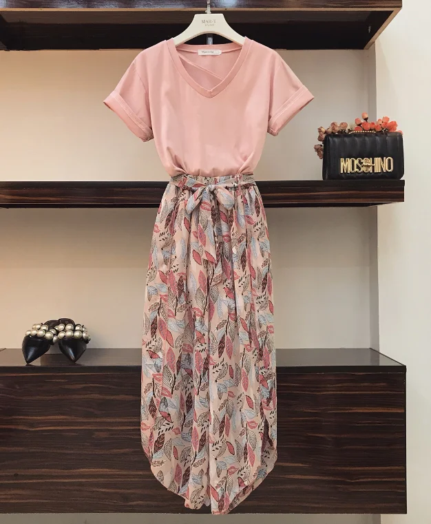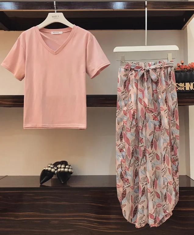 FREE SHIPPING V-Neck Age-reducing T-shirt + Holiday Style Printed Chiffon Pants JKP3411