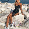 The dress came to London for only a week! The quality is good. Material is a bit see through but most of the dresses you buy on Boohoo, Missguided, PLT these days are of this quality as well. The split on the side is quite big which makes it a very sexy dress for evening wear. I am UK 6 and size S is perfect.