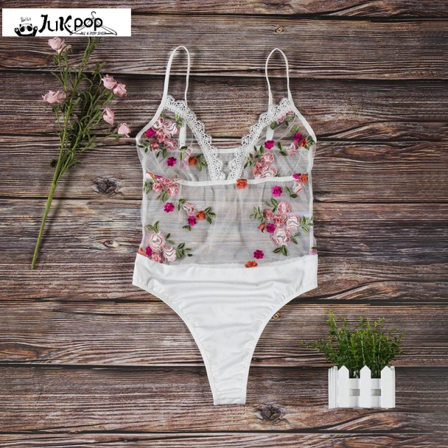 FREE SHIPPING V-neck See Though Floral Embroidery Lace Bodysuit JKP1118