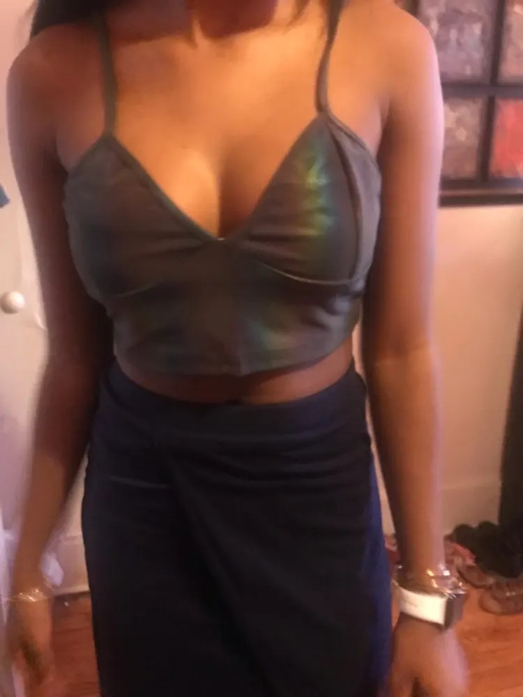 Took about 3 weeks to get to me but soooo worth the wait. The pics do this shirt no justice. It’s is so much more freaking gorgeous in person. One pic in in regular no flash and the other is with flash. Definitely worth the money. Wish the store sold a skirt or shorts to go with it.