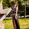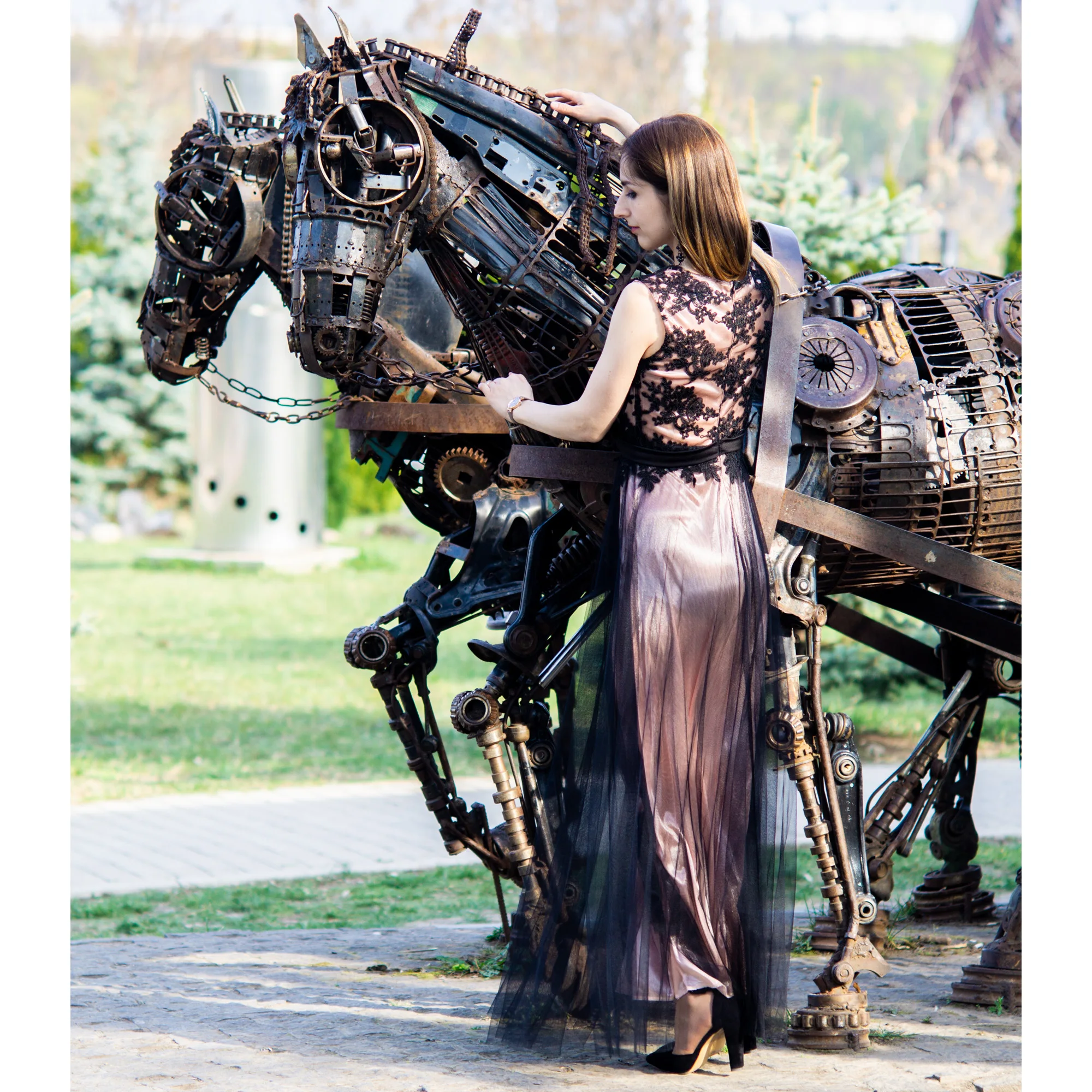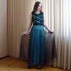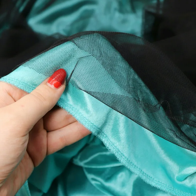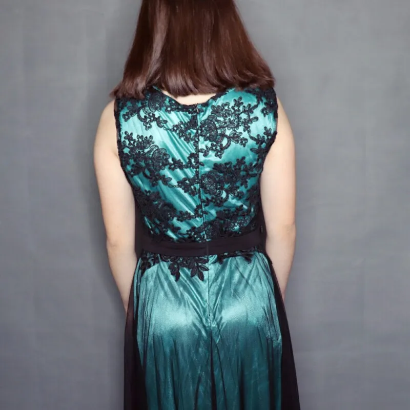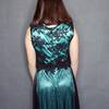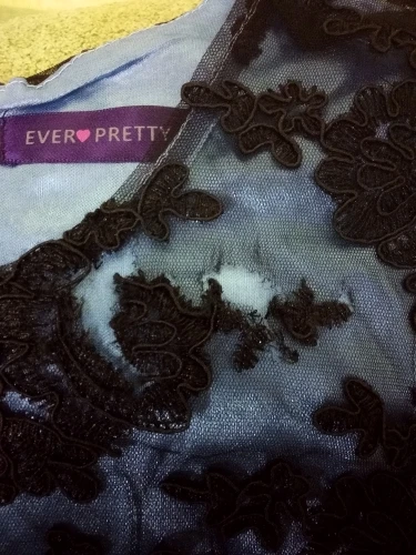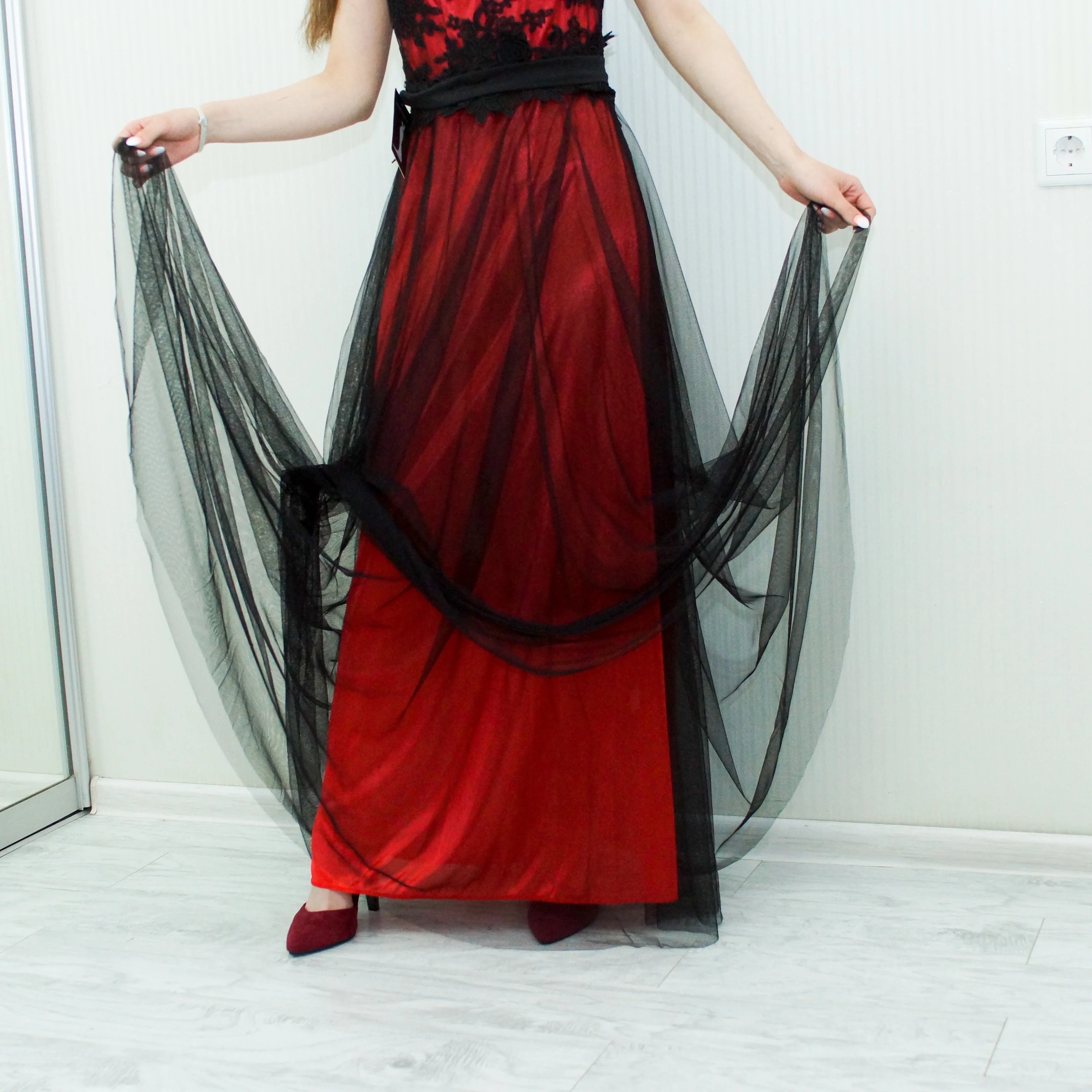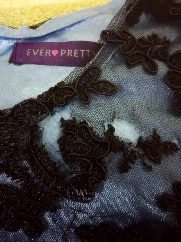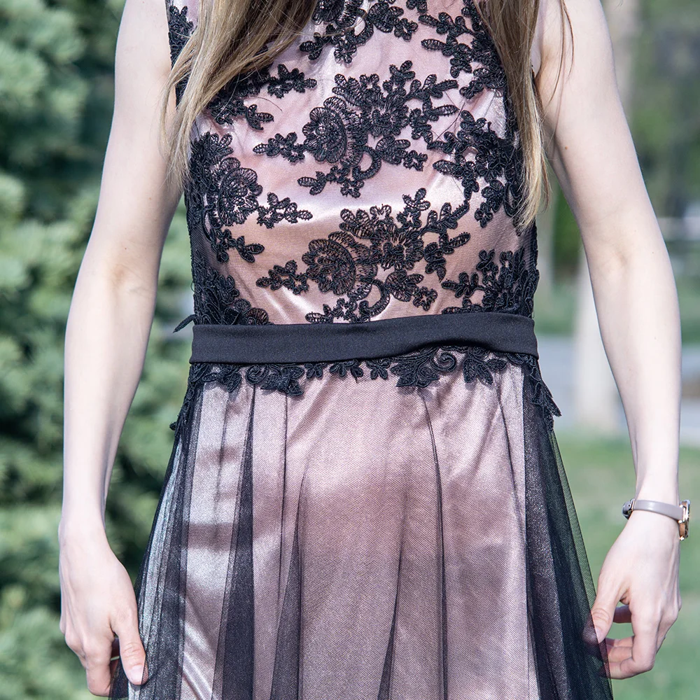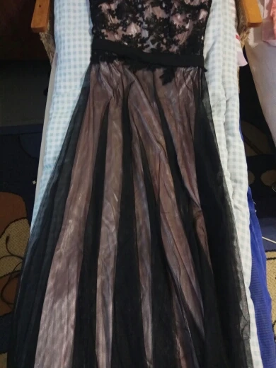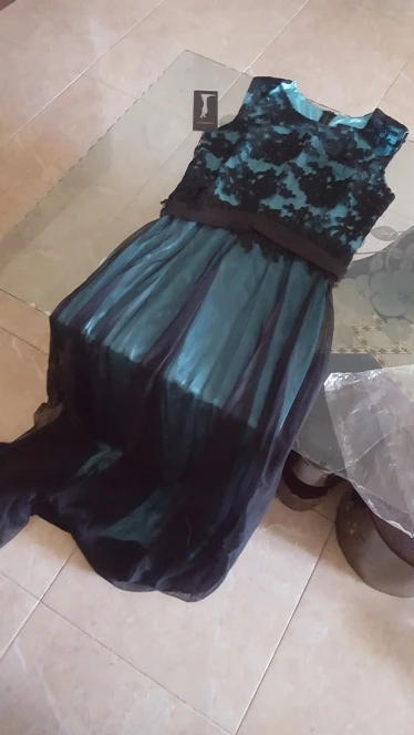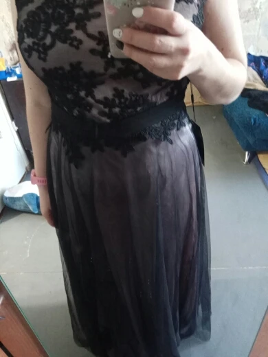 The dress is unmatched and very beautiful. The color of the dress is very beautiful. The fabric shines and the color plays in the light. But this shine is well muffled by the upper black mesh. It is fastened with a zipper. The bodice is embroidered with lace. the dress is layered. The main fabric from which the entire dress is sewn, slightly stretches. the bodice is additionally covered with a mesh with lace. And the skirt has two layers of mesh. Interestingly, the dress belt is made. Loose lace leaves look at the top and bottom of the knitted belt. The belt itself is sewn to the dress in front and behind, and on the sides it just lies on the surface of the product. This gives the waist line more elasticity than if it was sewn over the entire volume. I chose + 6. on my parameters 82-60-87 and height 164 cm dress village freely, it was necessary to take less. Freely. In the waist there is still a place, in the chest is also a little loose. The grid iron with steam fight is ironed perfectly, it is medium density and not prickly. The dress is beautiful, looks super, elegant, neat. Nothing superfluous. And the cost is very pleasing)