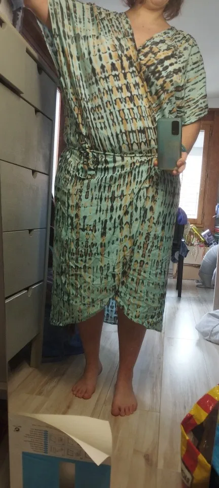 Very satisfied. Good material, comfortable, qualitative, not transparent. Belt provided but no passers-by. Small hole on the shoulder, easy sewing to resume