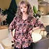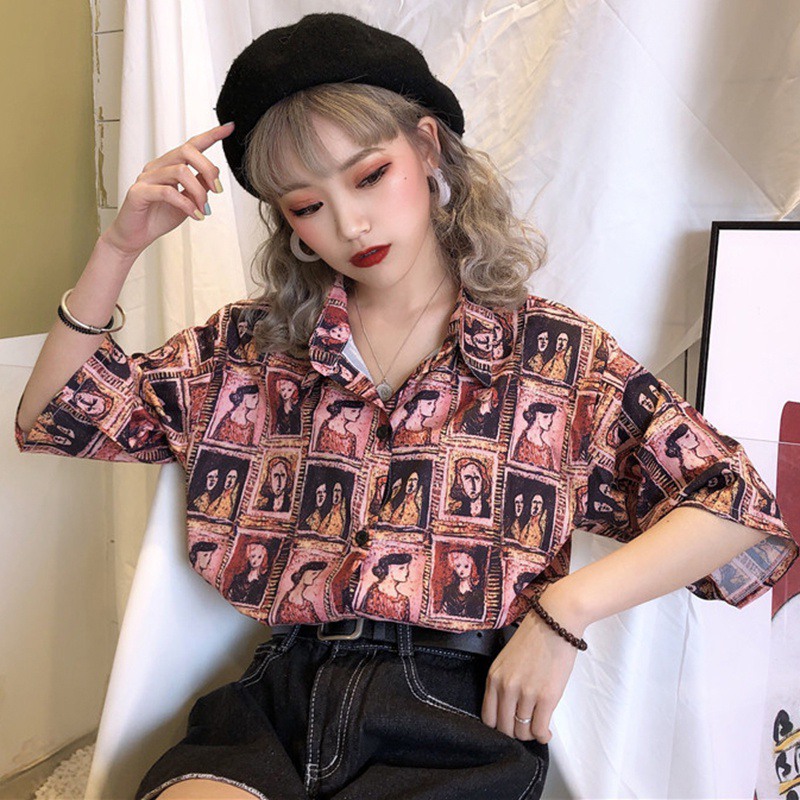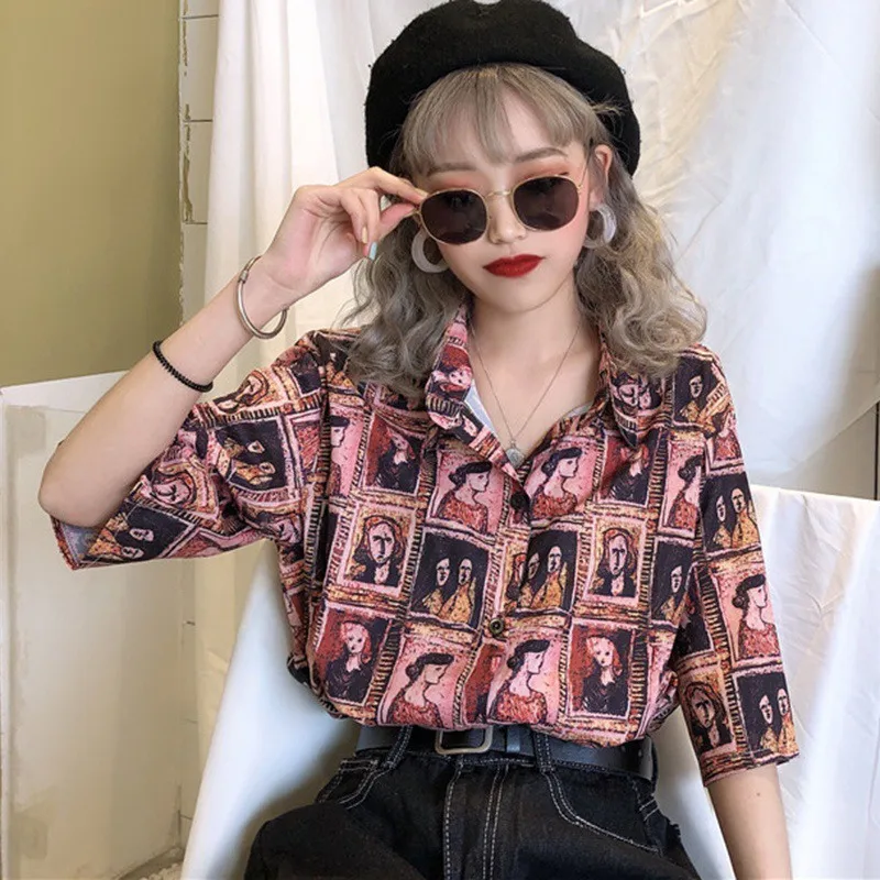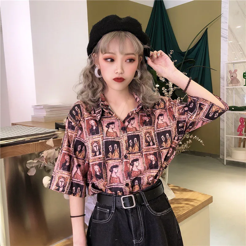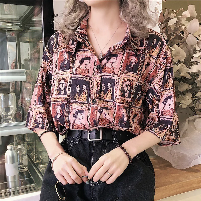 FREE SHIPPING Vintage Character Printed Blouse Streetwear Women Turn Down Collar Short Sleeve Shirt Women Fashion Blouses Loose Casual Tops JKP2791