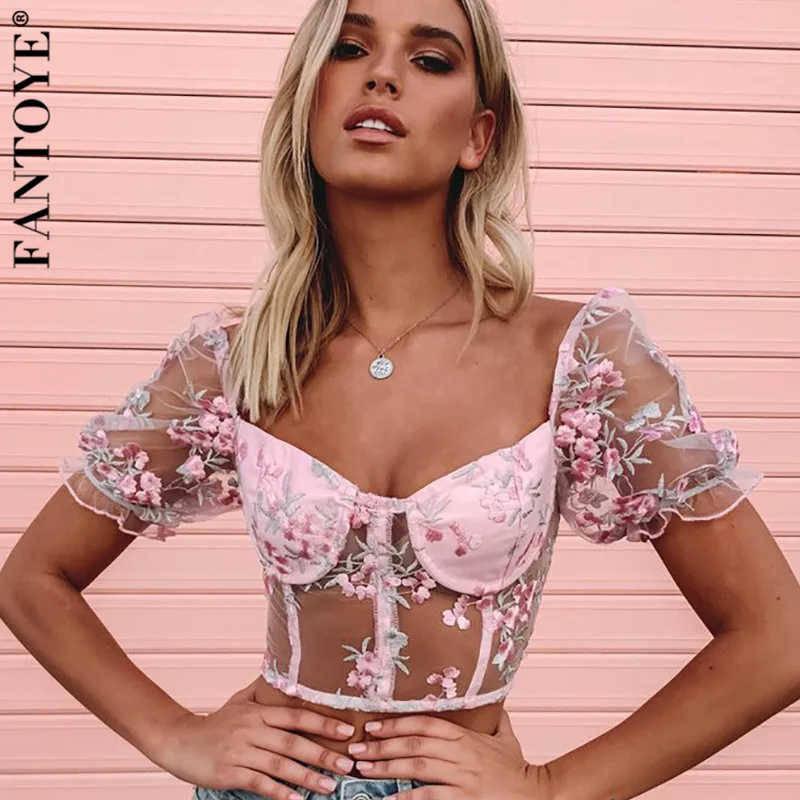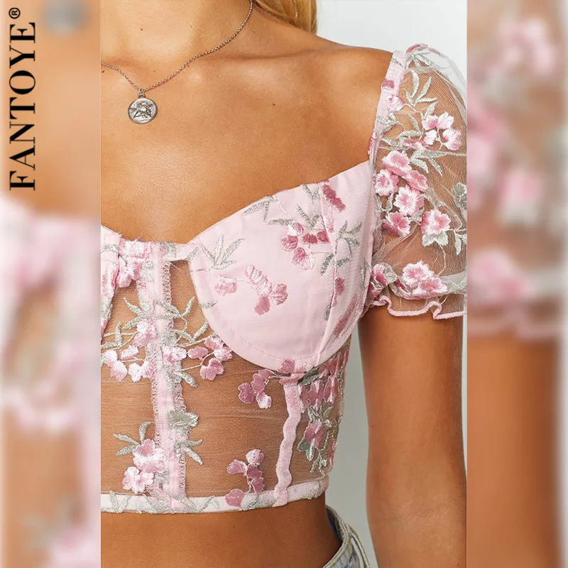 FREE SHIPPING Vintage Flower Mesh Crop Top Embroidery Puff Sleeve Strapless Tank Top