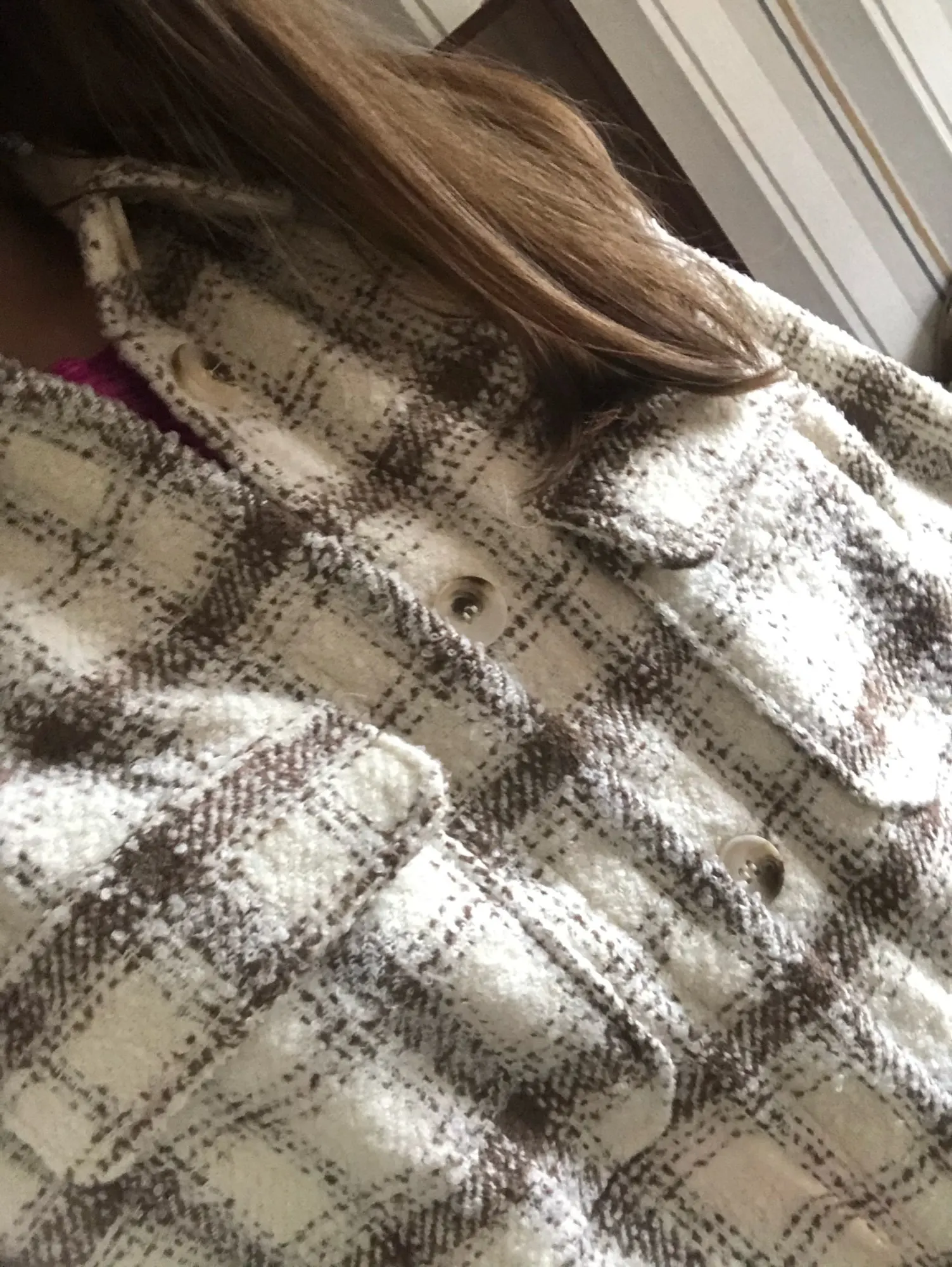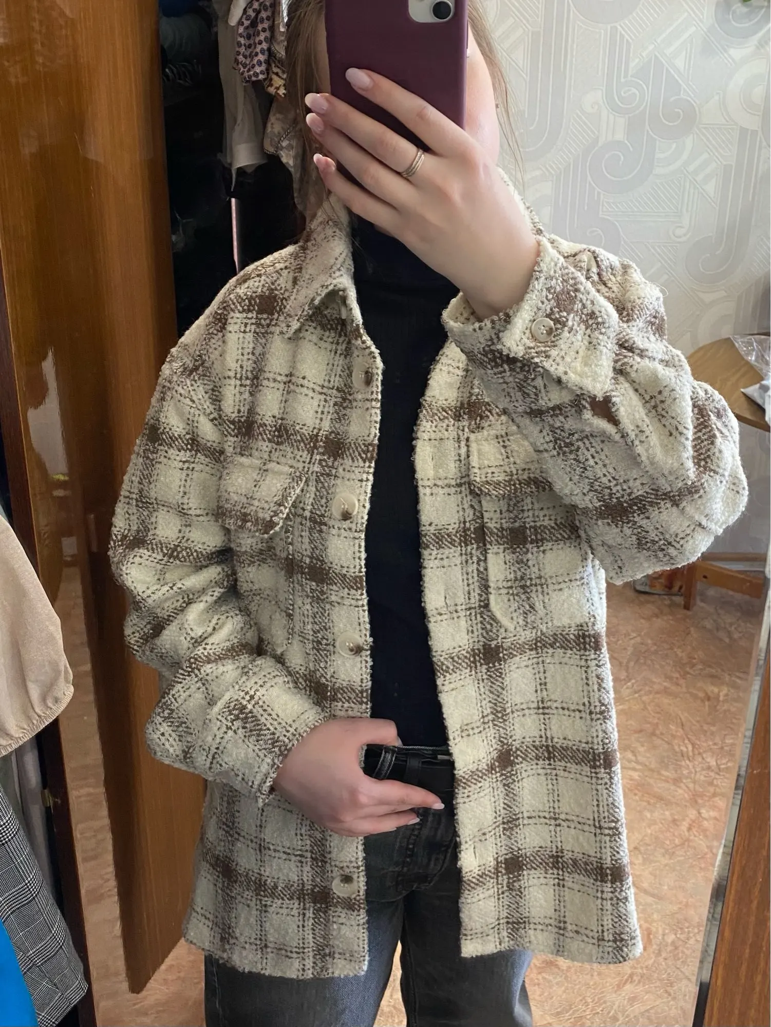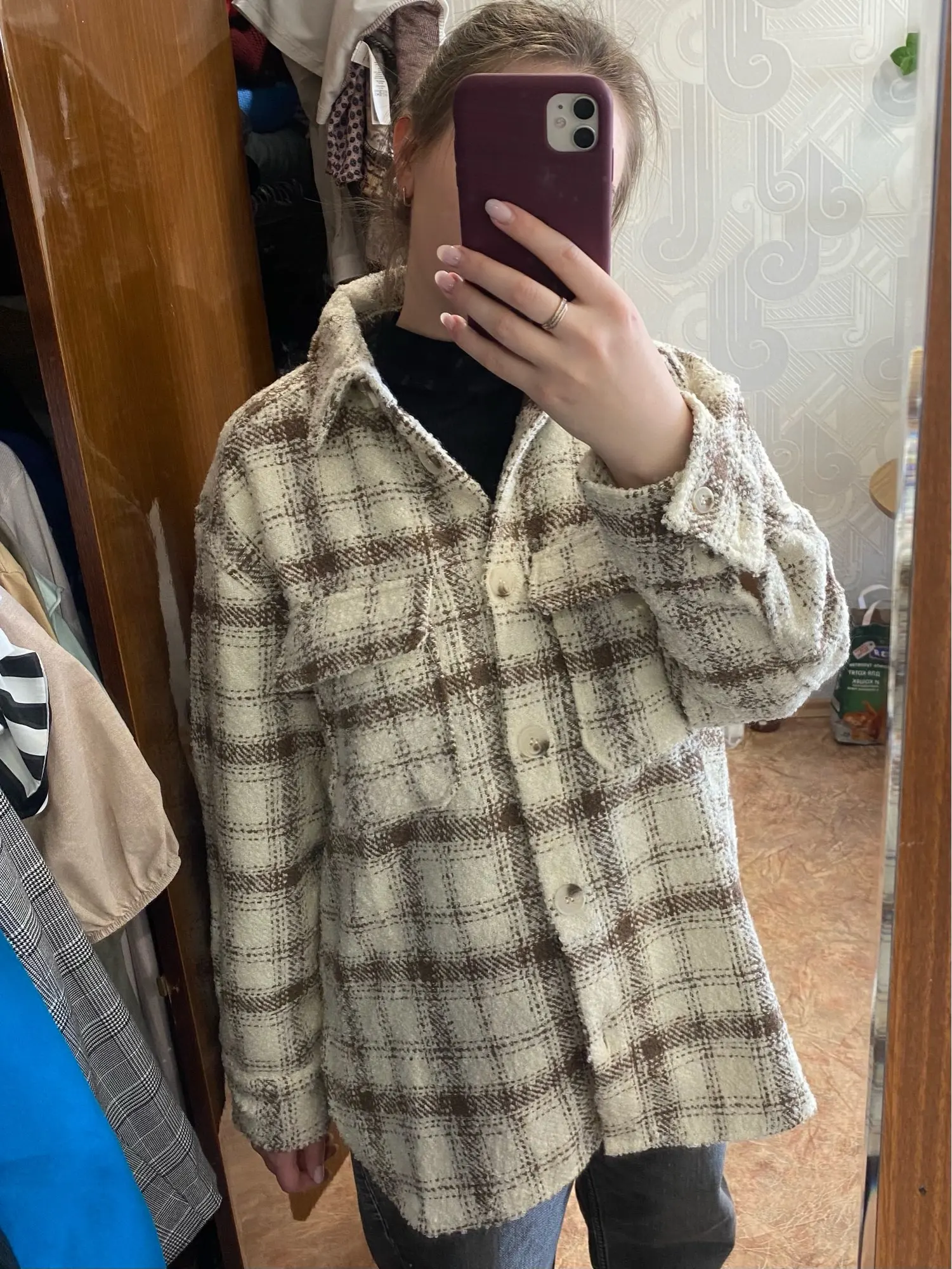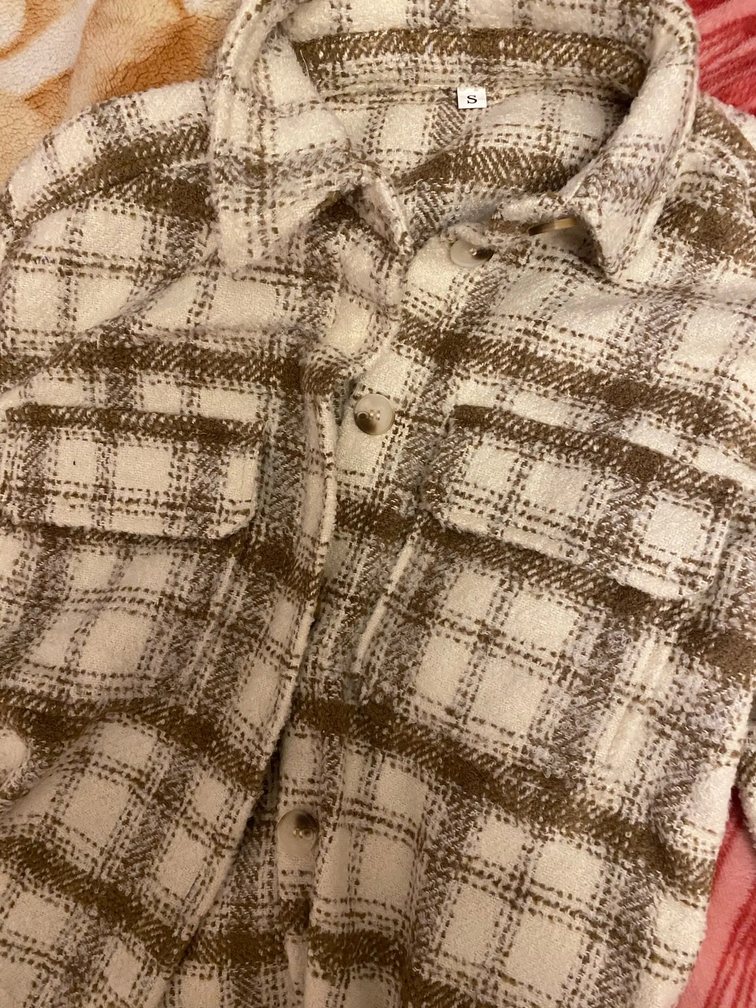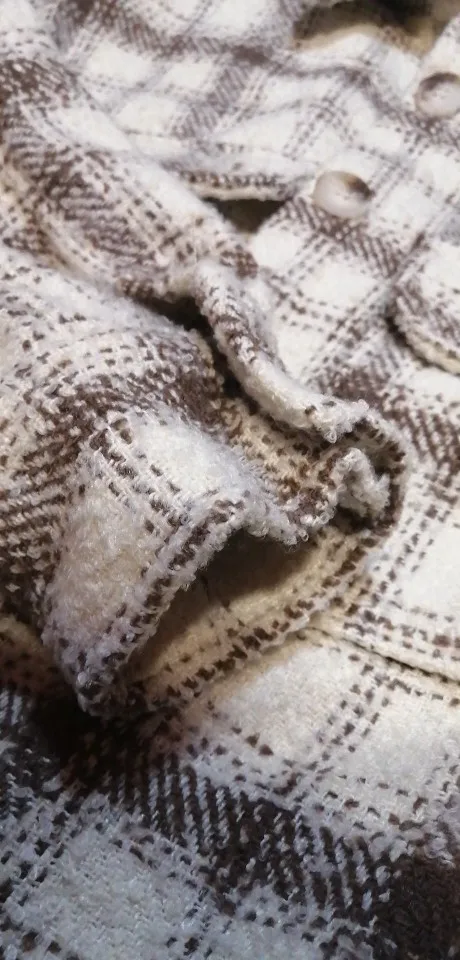 Cool, warm shirt. The size is the same, at 42-44 came S. The material is soft, like a bouclé, looks stylish. Delivery is very fast. Thank you very much.