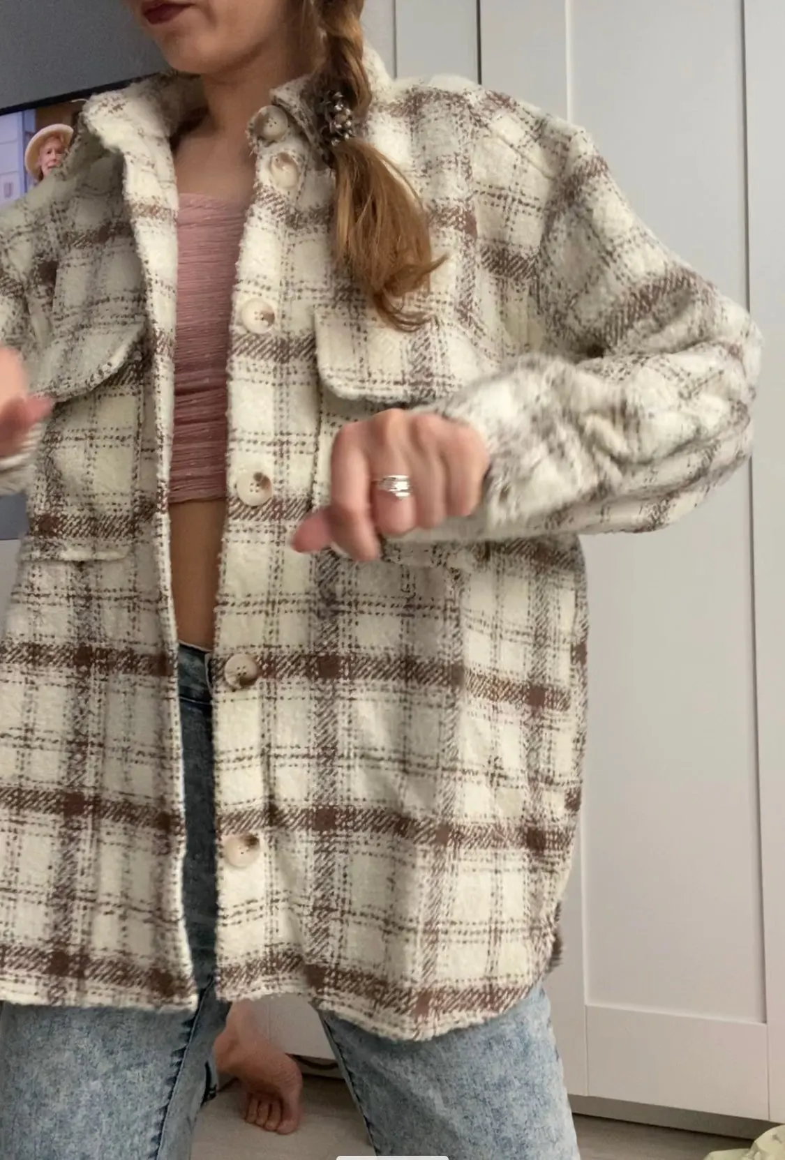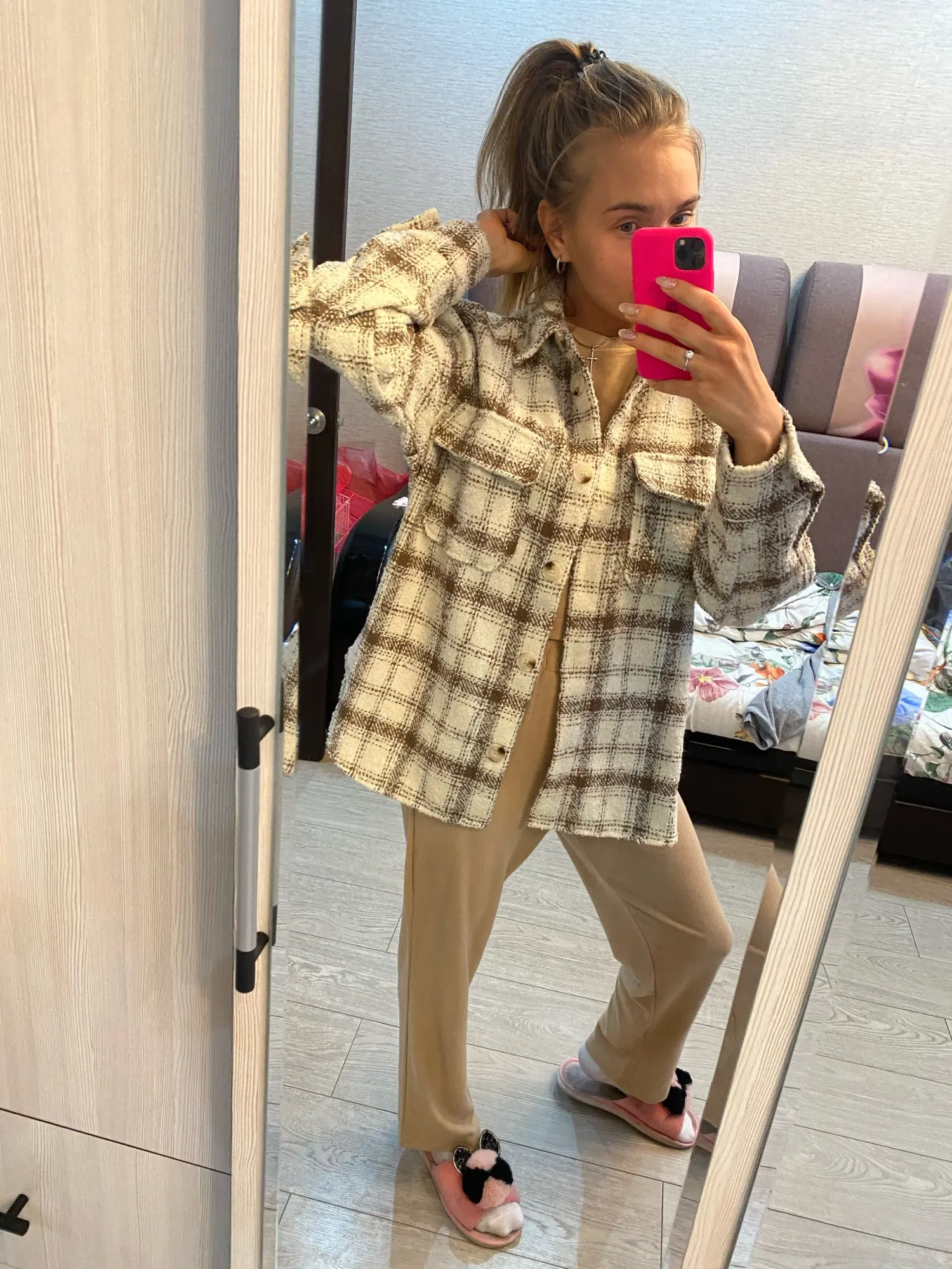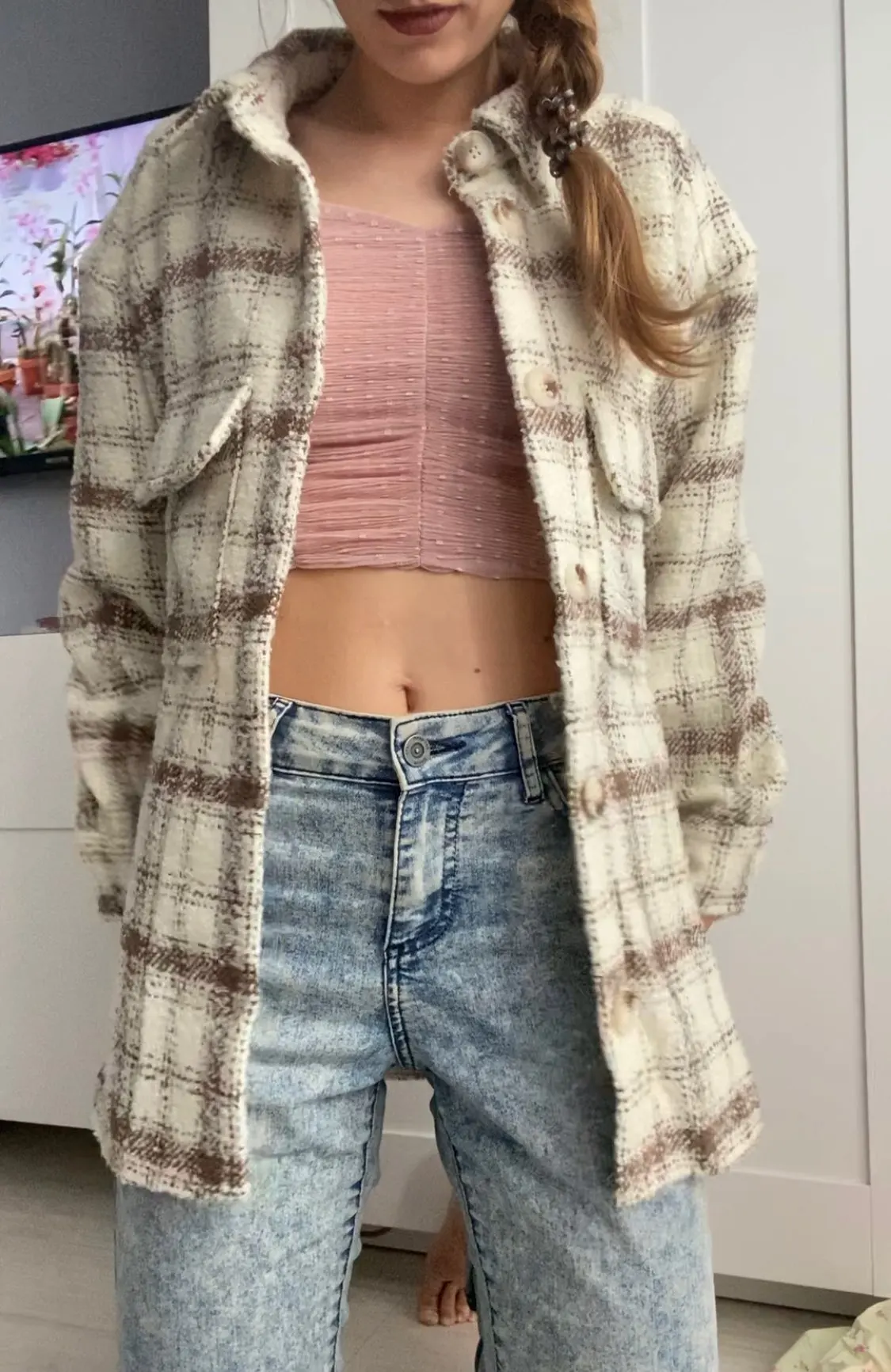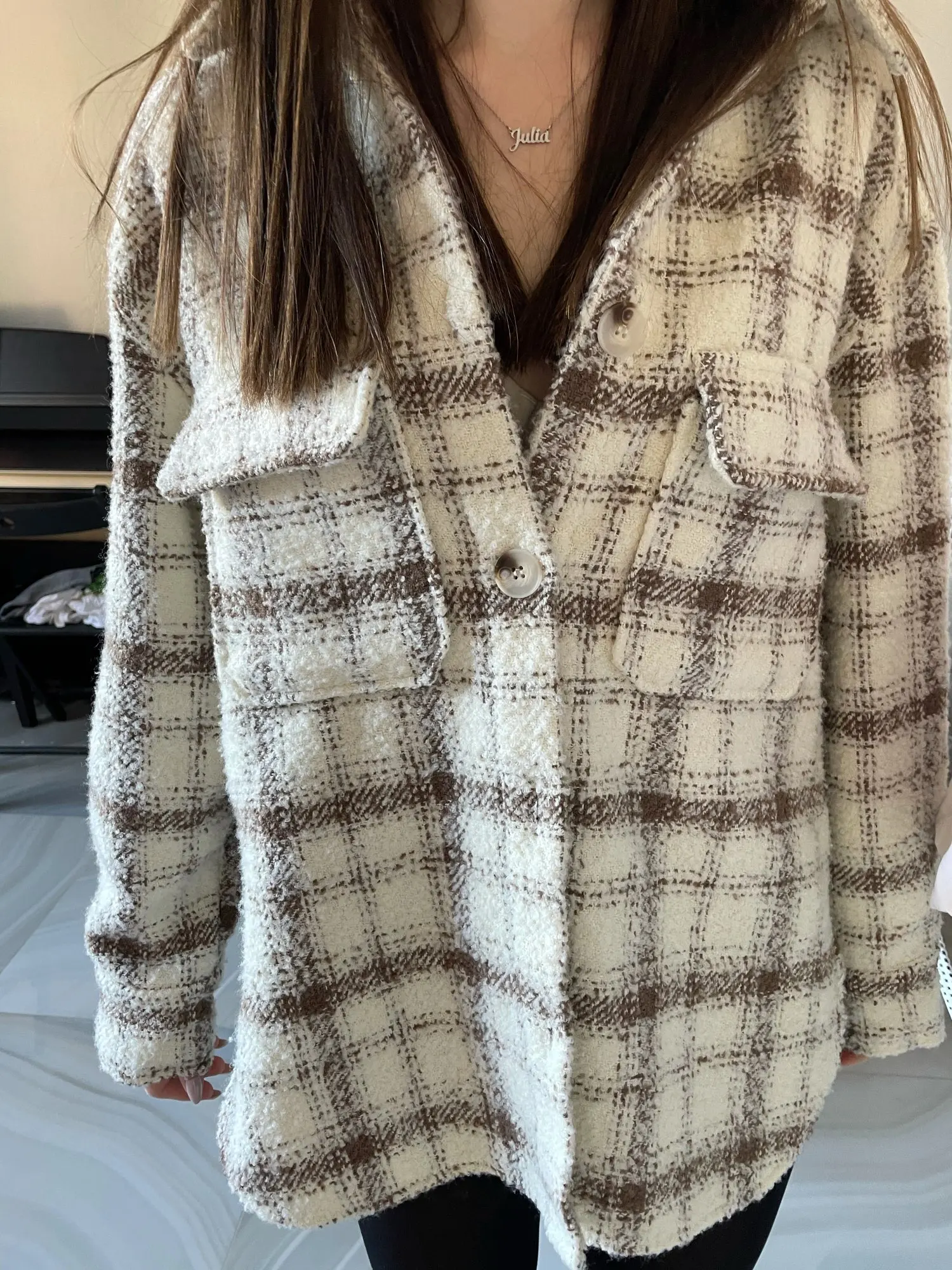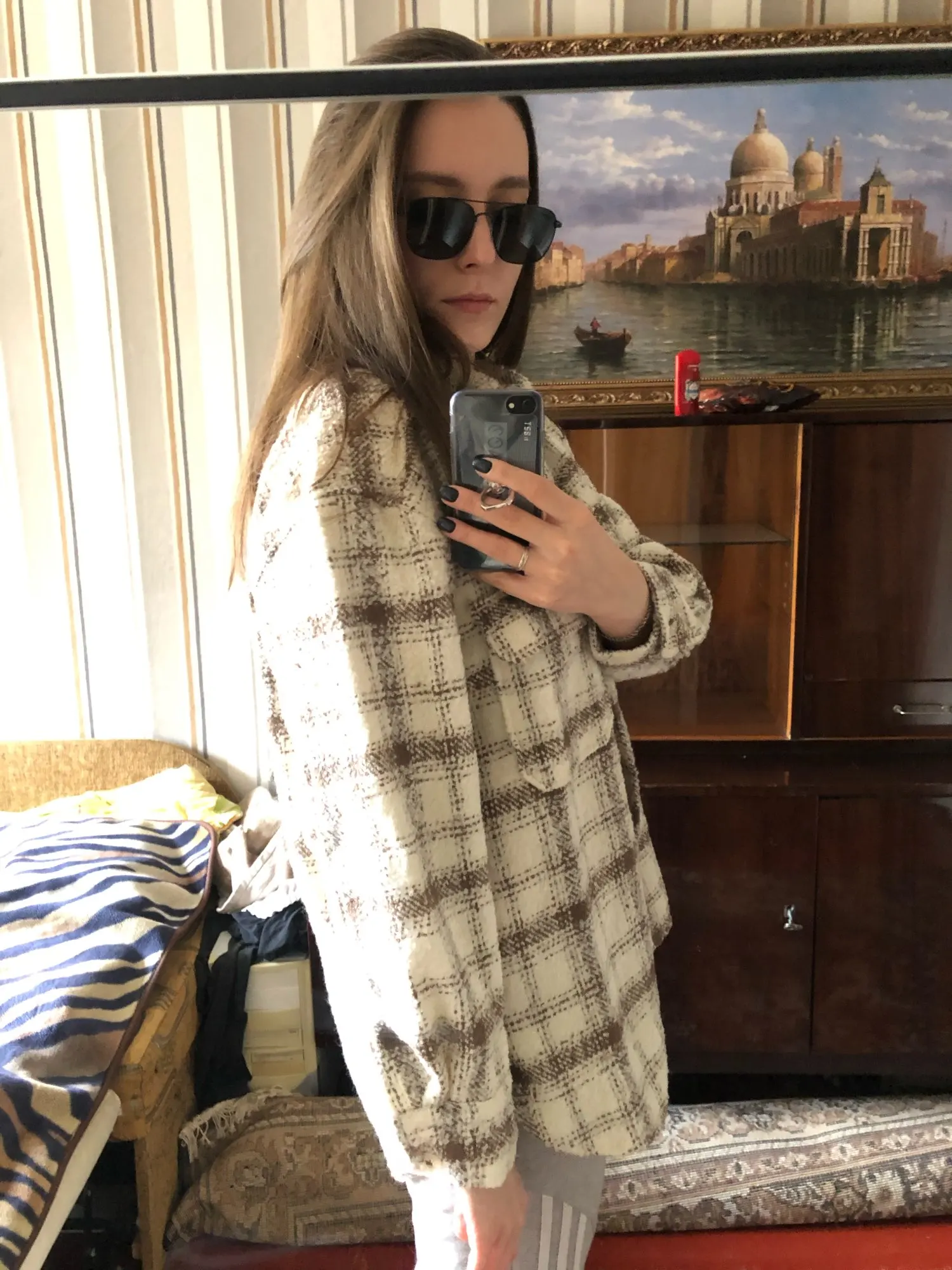 Cool, warm shirt. The size is the same, at 42-44 came S. The material is soft, like a bouclé, looks stylish. Delivery is very fast. Thank you very much.