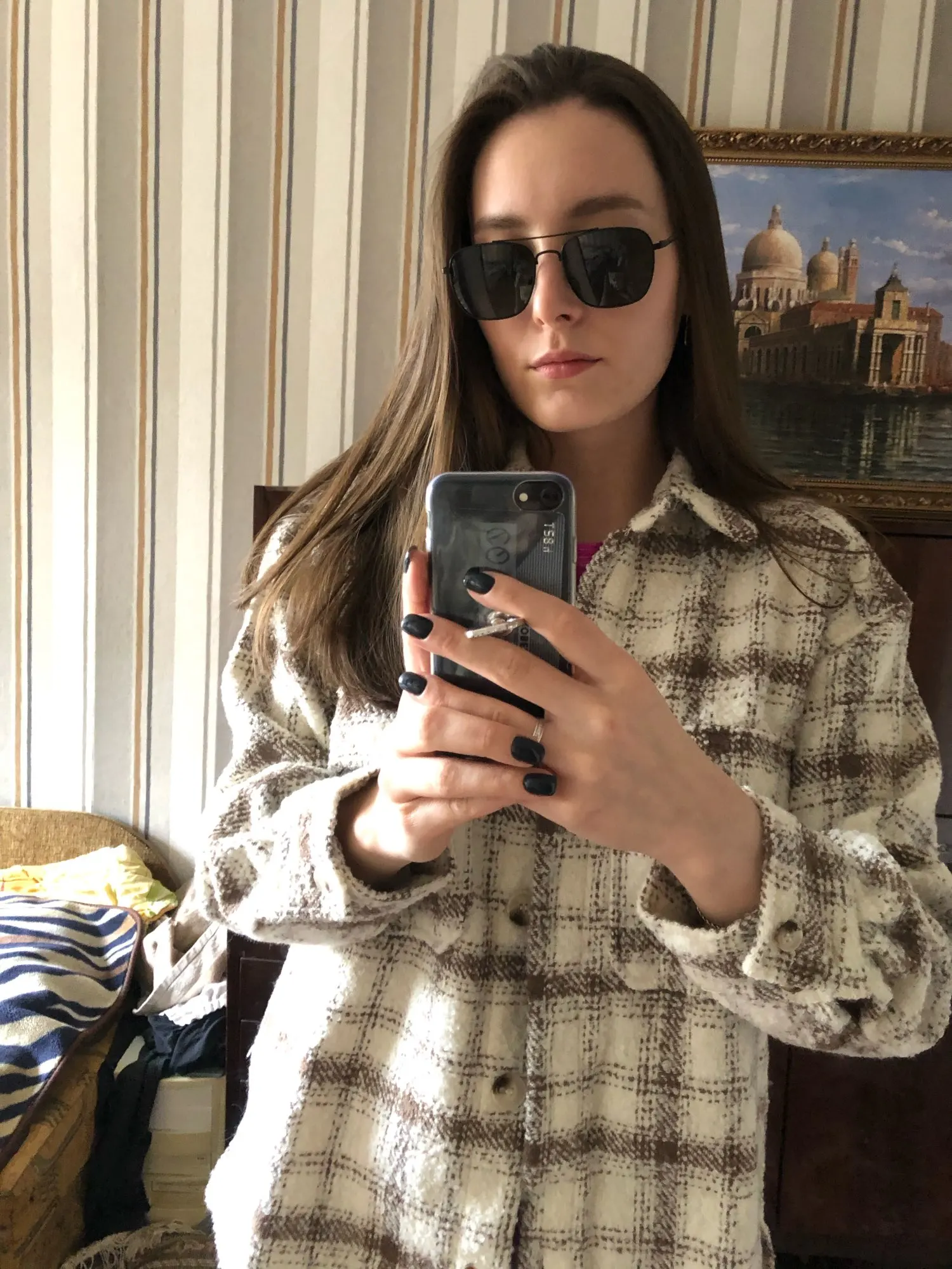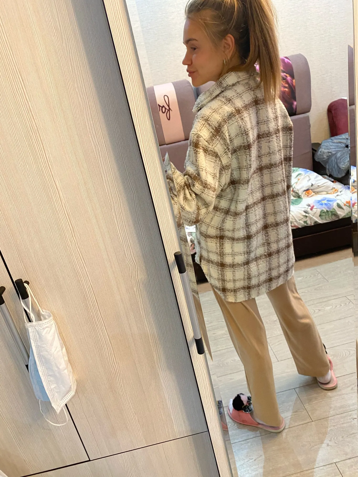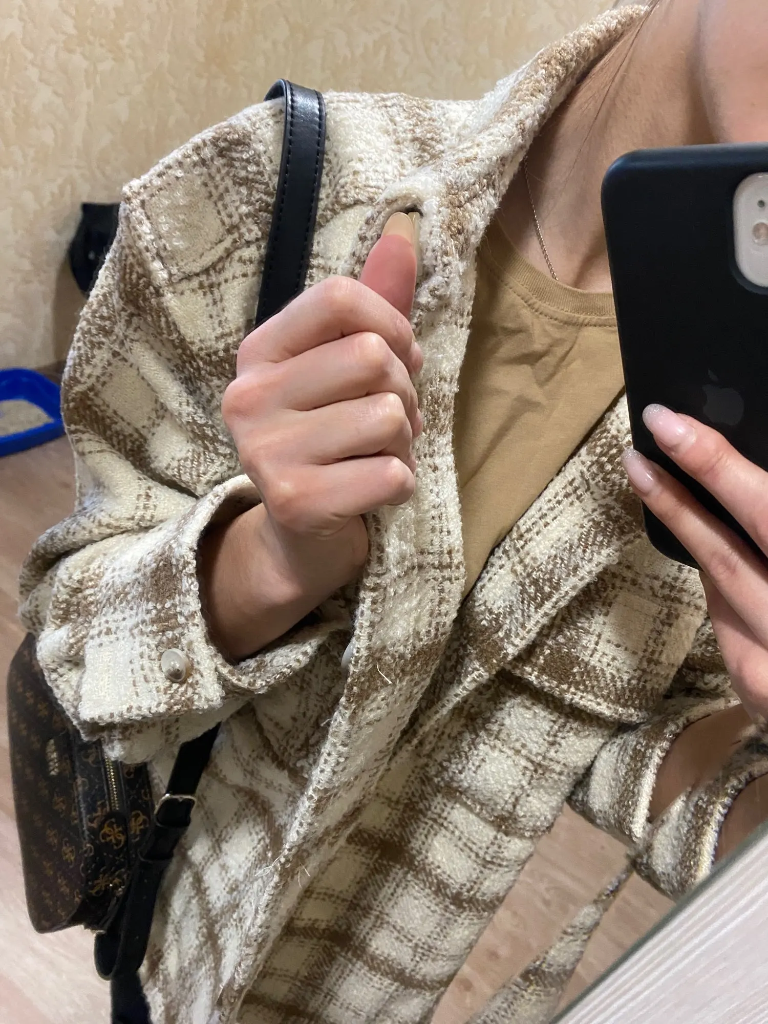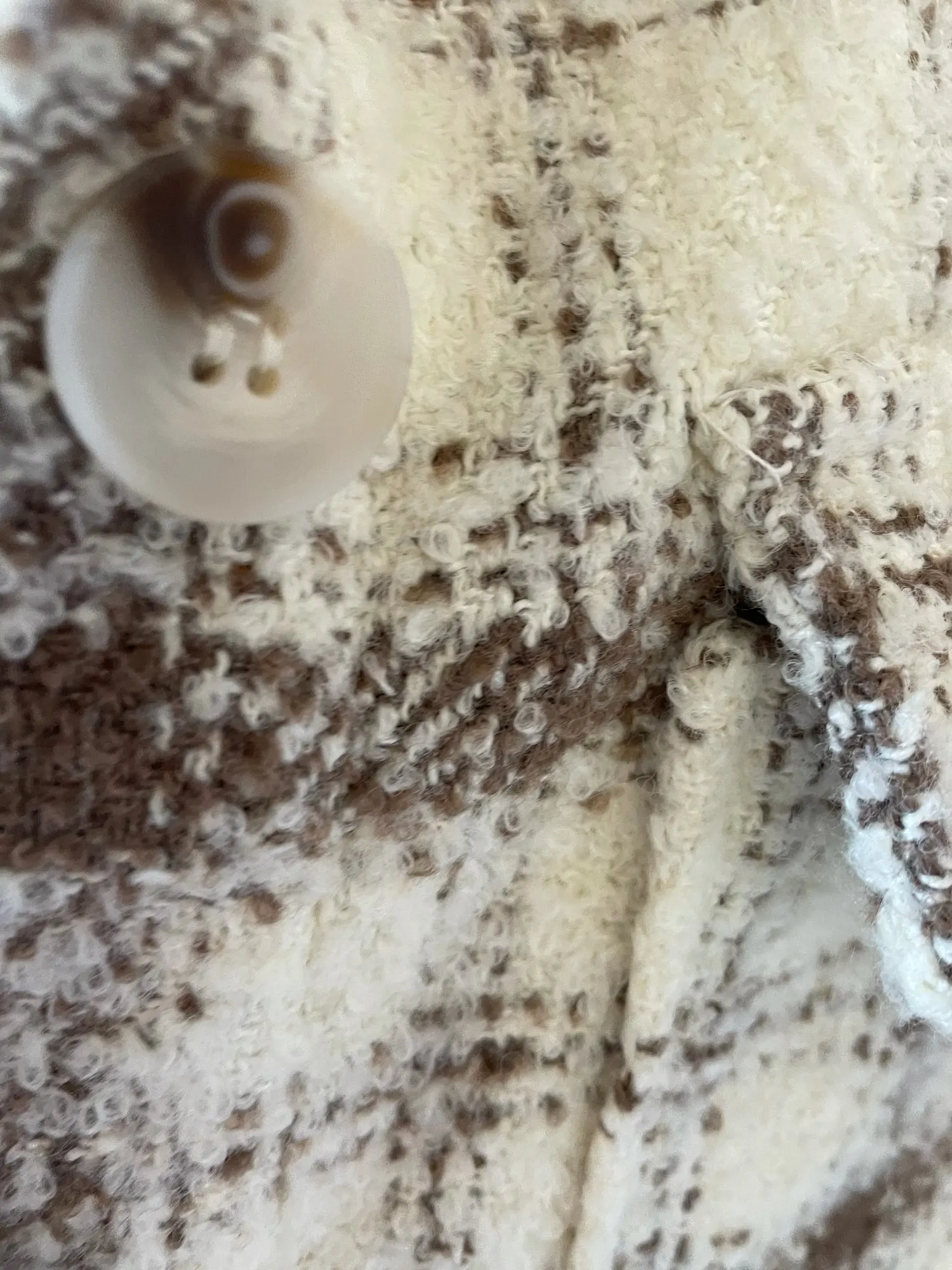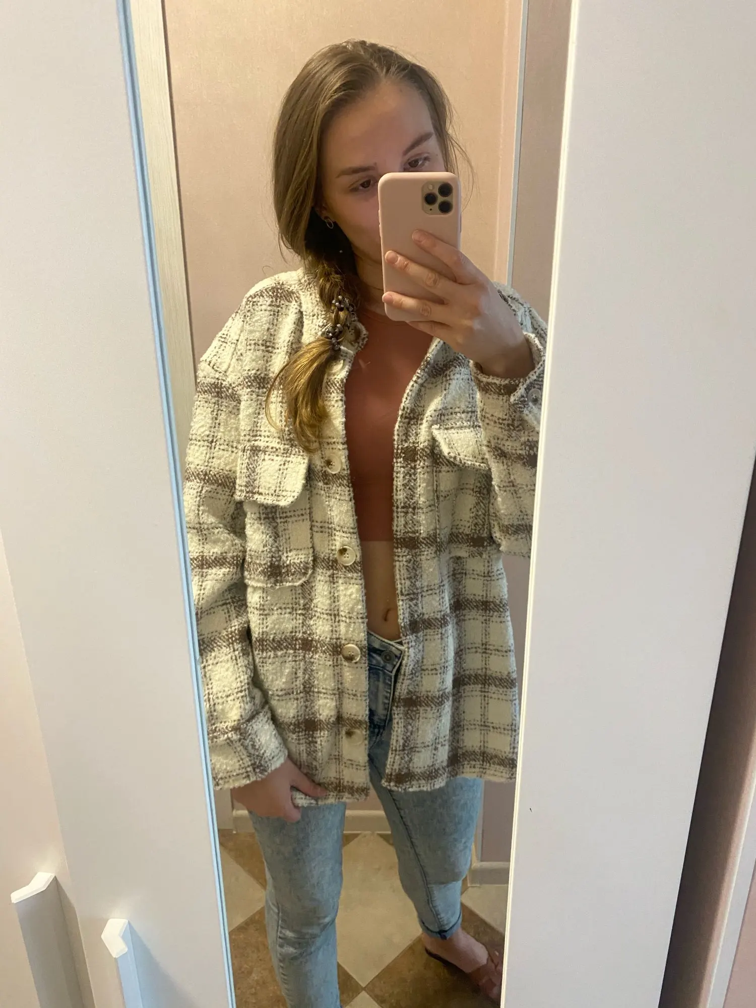Cool, warm shirt. The size is the same, at 42-44 came S. The material is soft, like a bouclé, looks stylish. Delivery is very fast. Thank you very much.
