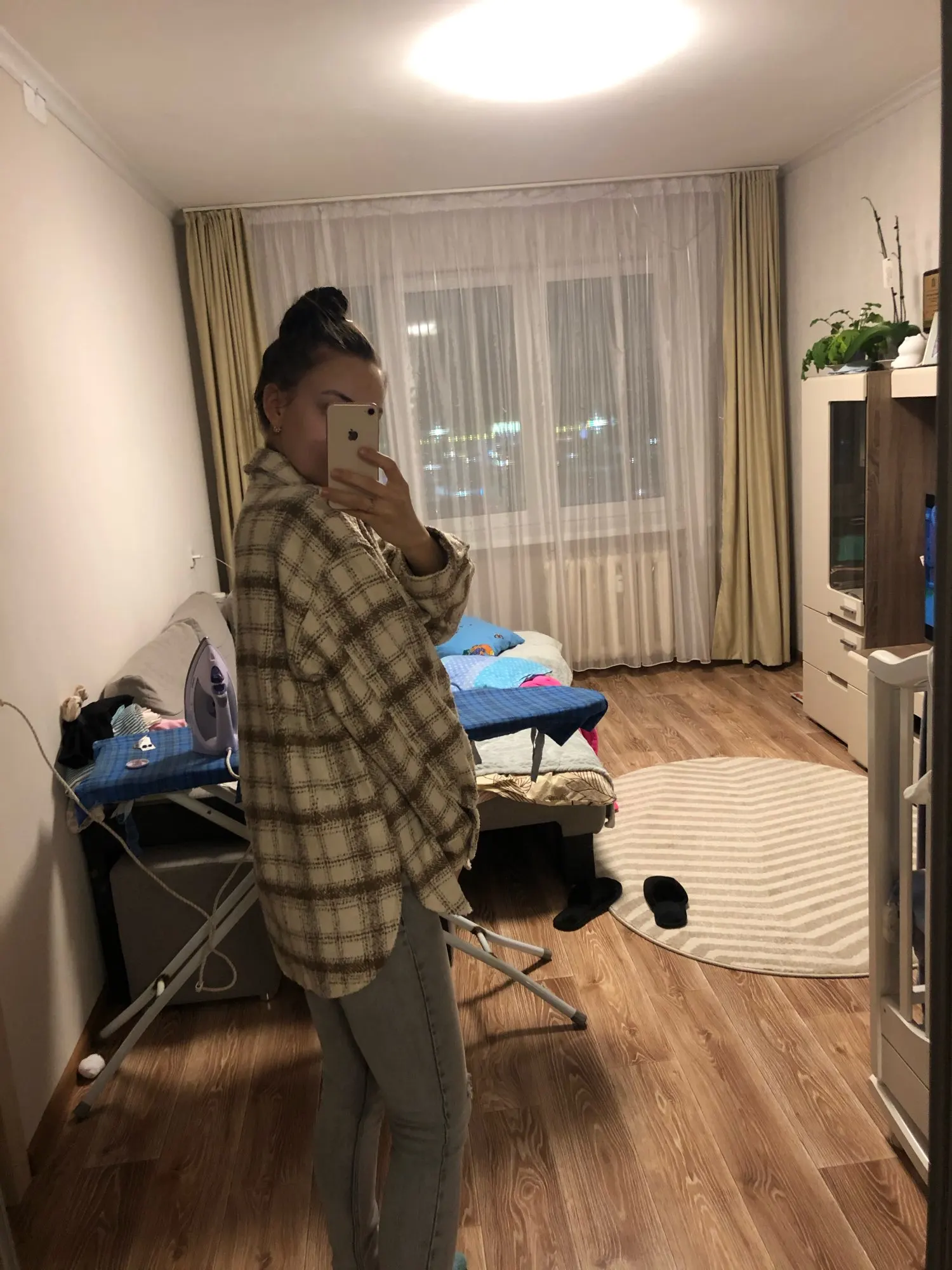 Shirt is a cool oversize. Straight As in the picture. The quality is super, the buttons are plastic, everything is well sewn. The seams are even neat. On its parameters, height 170 weight 68 chest Volume 86 hip Volume 105 sat L freely, sleeves are even a little long. Quite dense, so that instead of a light windbreaker can be worn