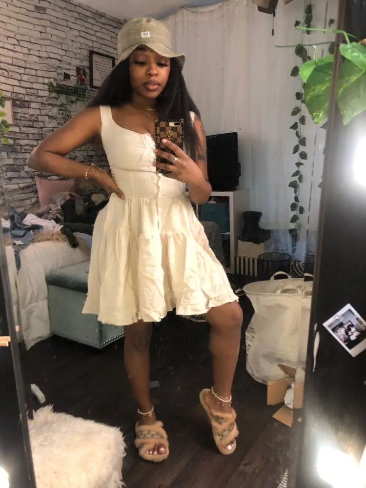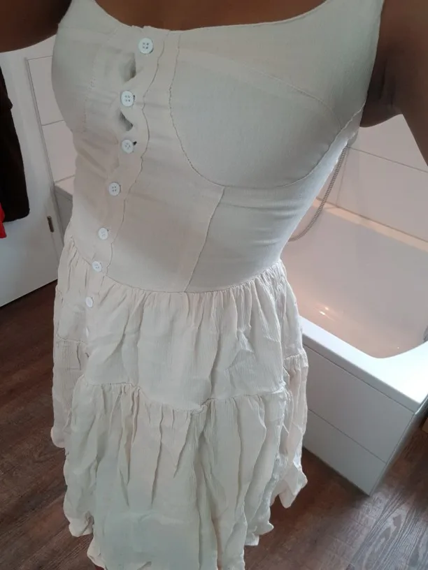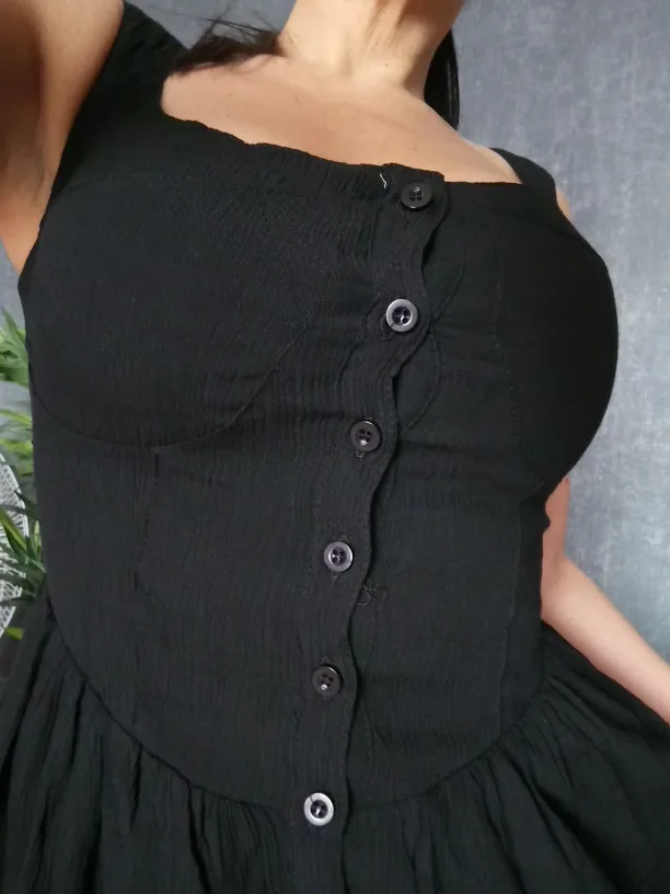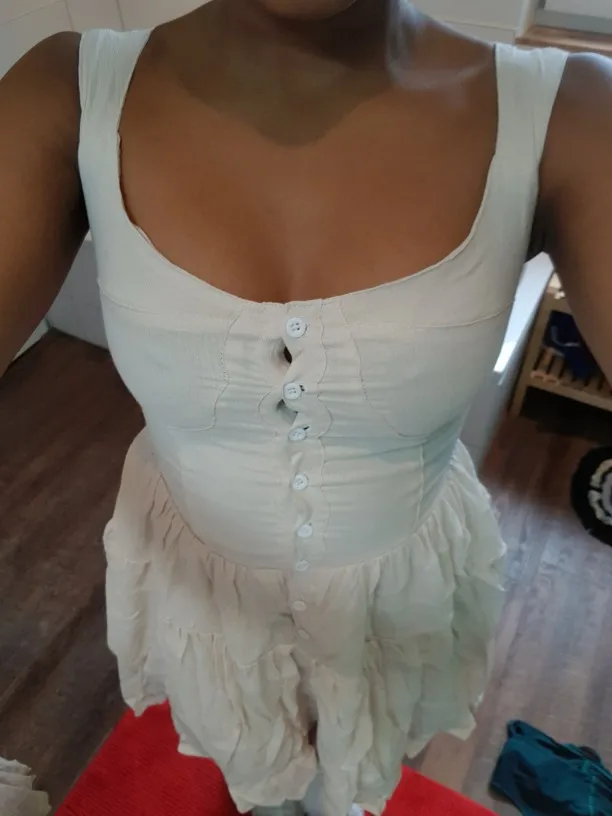 Love this dress. It’s so pretty. I have larger boobs. Cup C so the button will not close but i will wear a tank top. The waist fits perfect but I wish I bought a medium instead of Small. But it’s not bad.