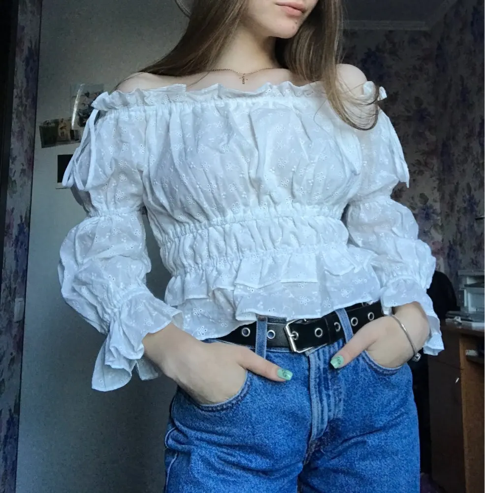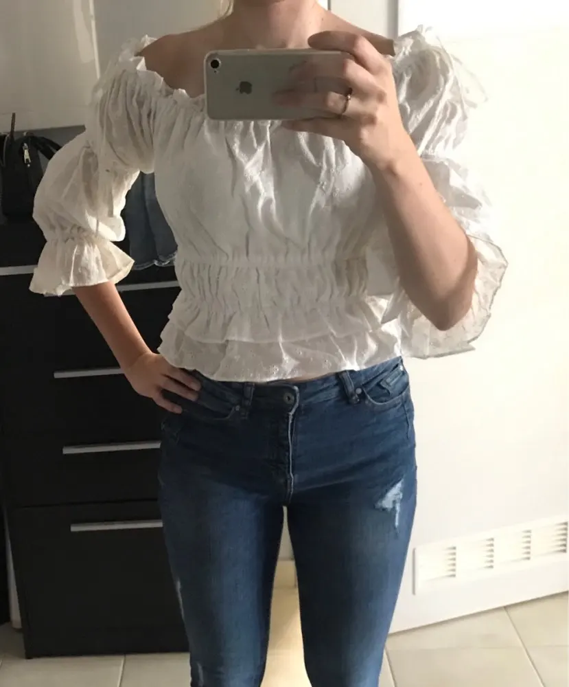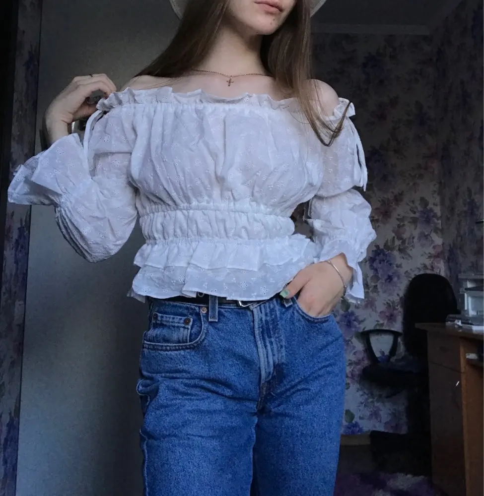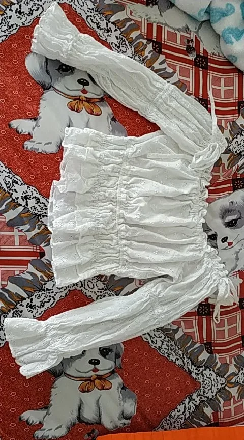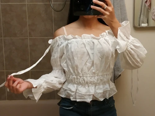 Top is very cute! Material cotton, breathable, perfect for summer. After washing should not tumble dry. I wear US size S, took size M. Shoulder area does not press, but the elastic band around the waist pressed a little, especially if you have a belly or if you are full lol. Sizing runs small so consider taking 2 sizes up. I think I can pull off size L without any problem. I recommend the blouse, it is very pretty.
