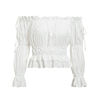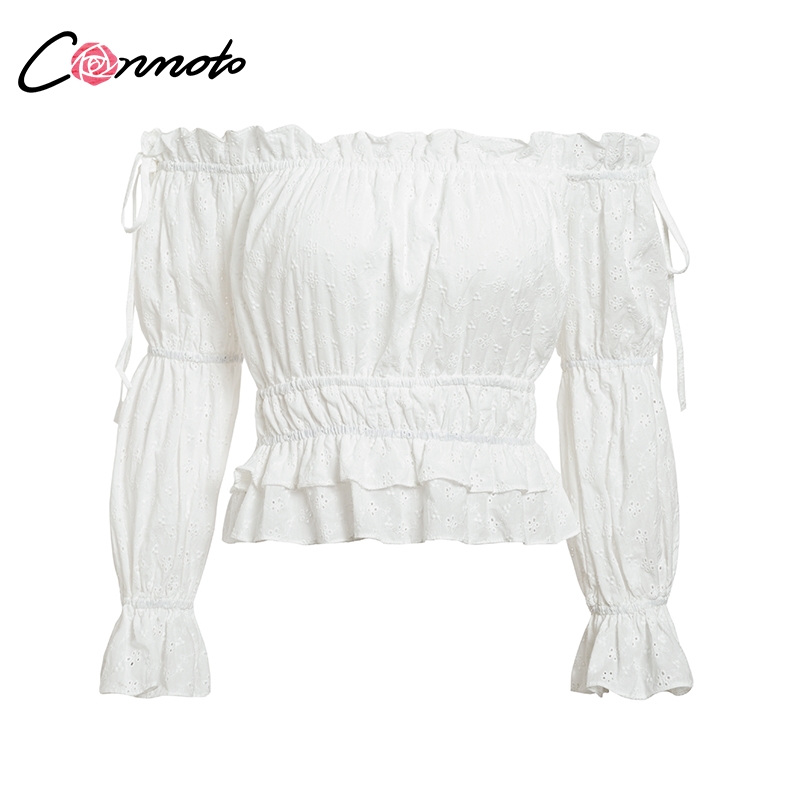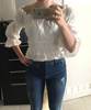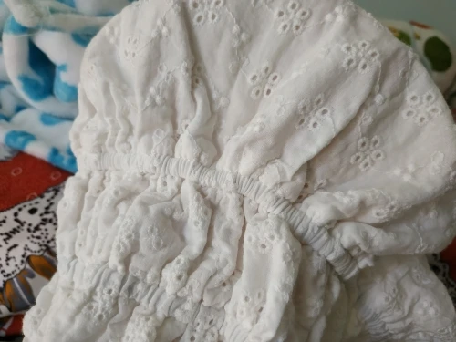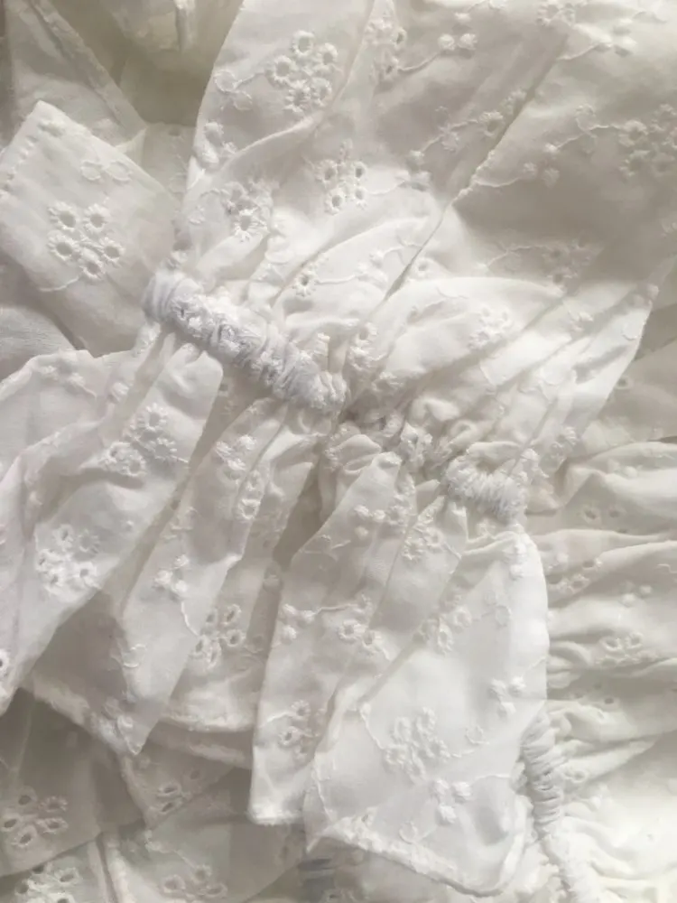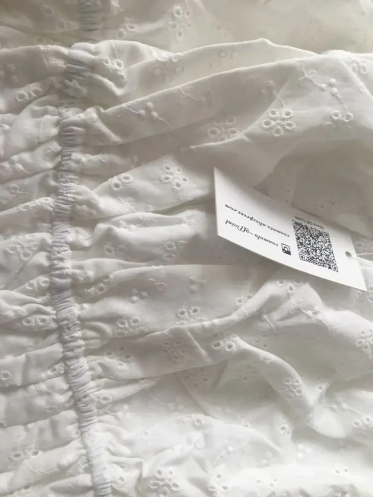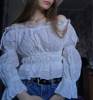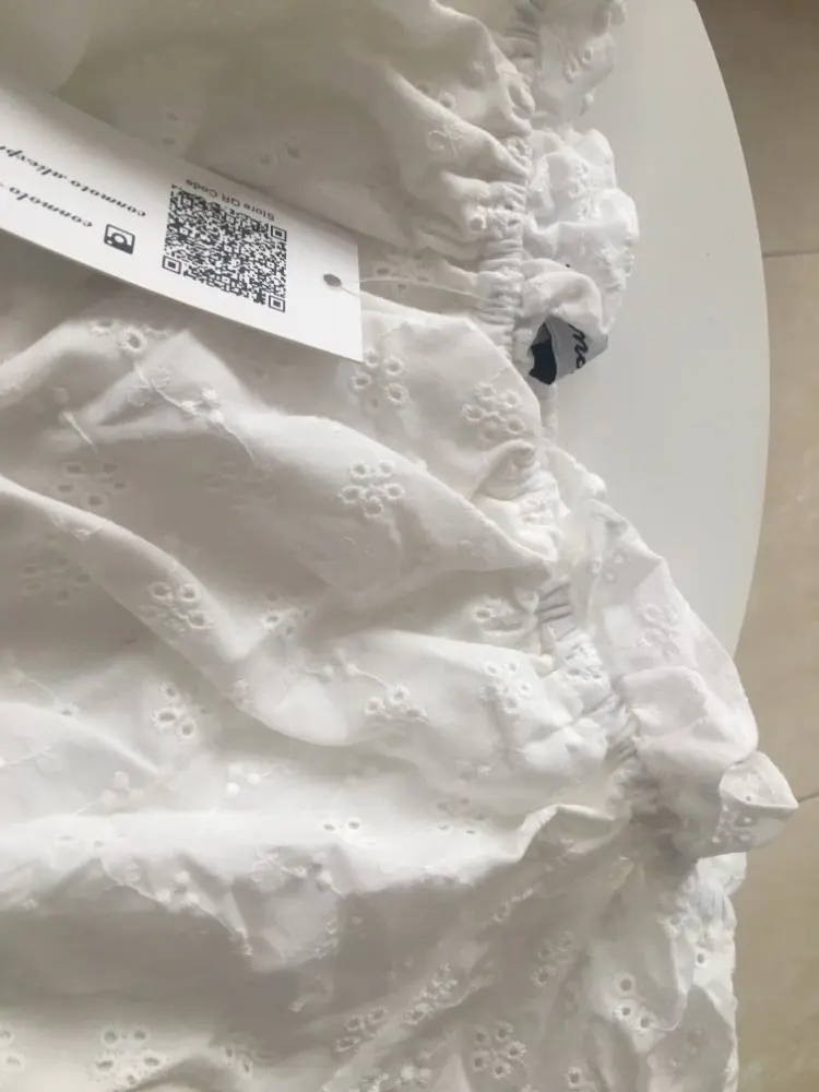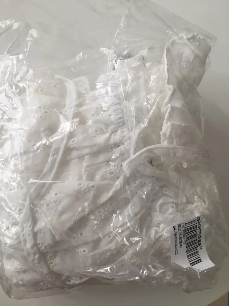 Top is very cute! Material cotton, breathable, perfect for summer. After washing should not tumble dry. I wear US size S, took size M. Shoulder area does not press, but the elastic band around the waist pressed a little, especially if you have a belly or if you are full lol. Sizing runs small so consider taking 2 sizes up. I think I can pull off size L without any problem. I recommend the blouse, it is very pretty.