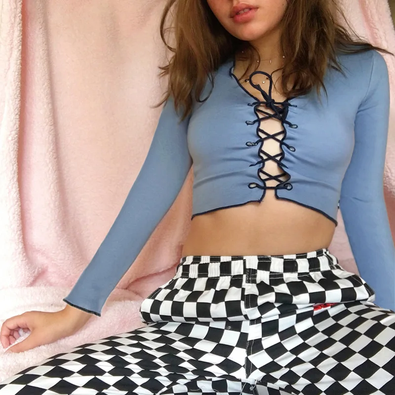 FREE SHIPPING Vintage Women Harajuku Long Sleeve Solid Lace up Tops Sexy Light Blue Front Cropped T-shirt JKP1998