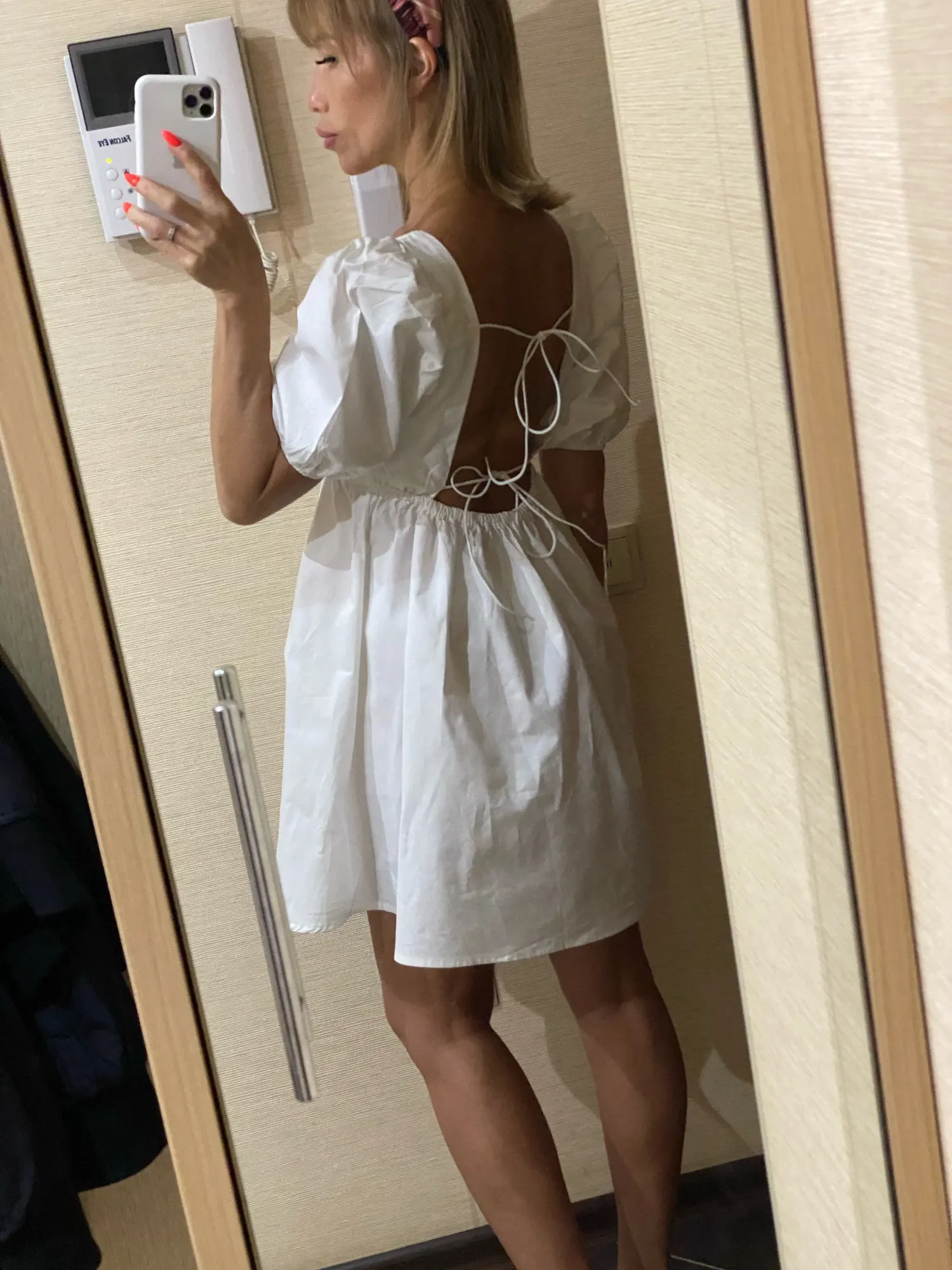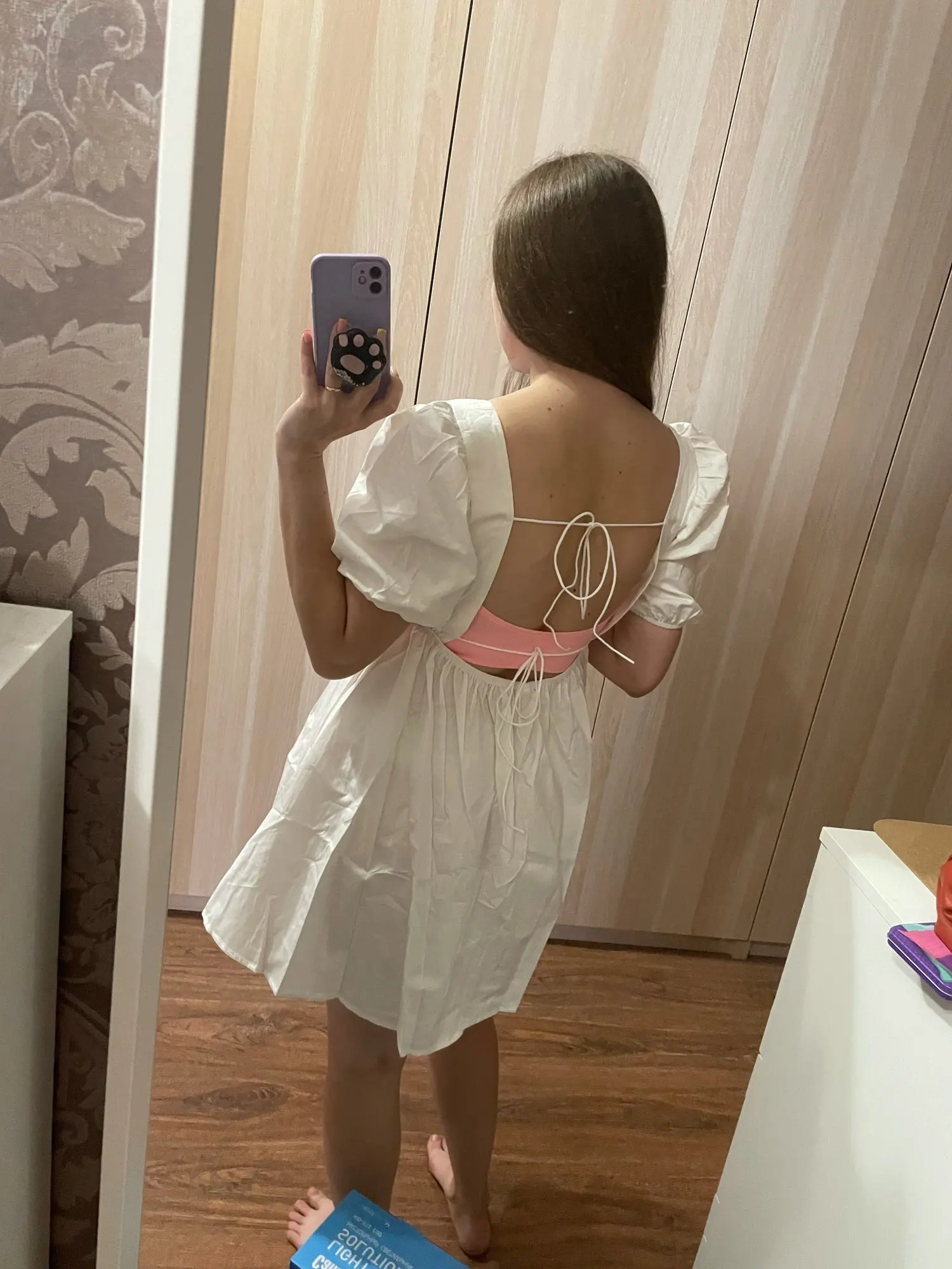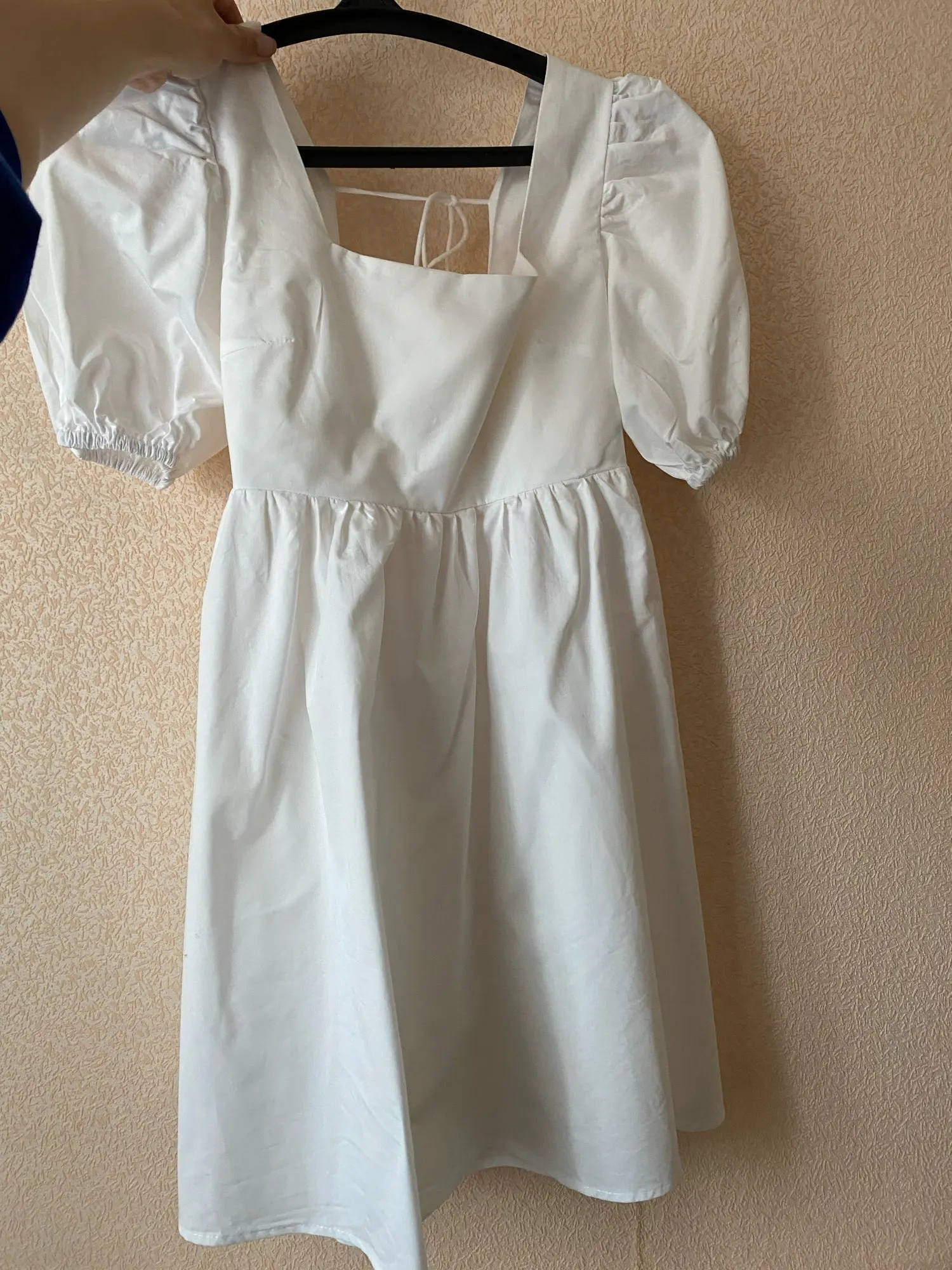 Супер платье! Плотная качественная ткань, не светит. Веревочки на стене - это резинки.