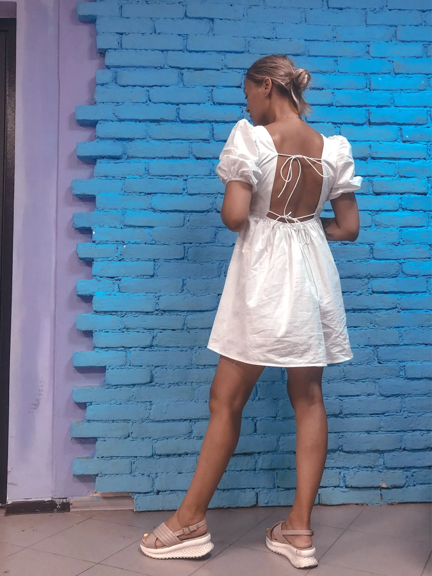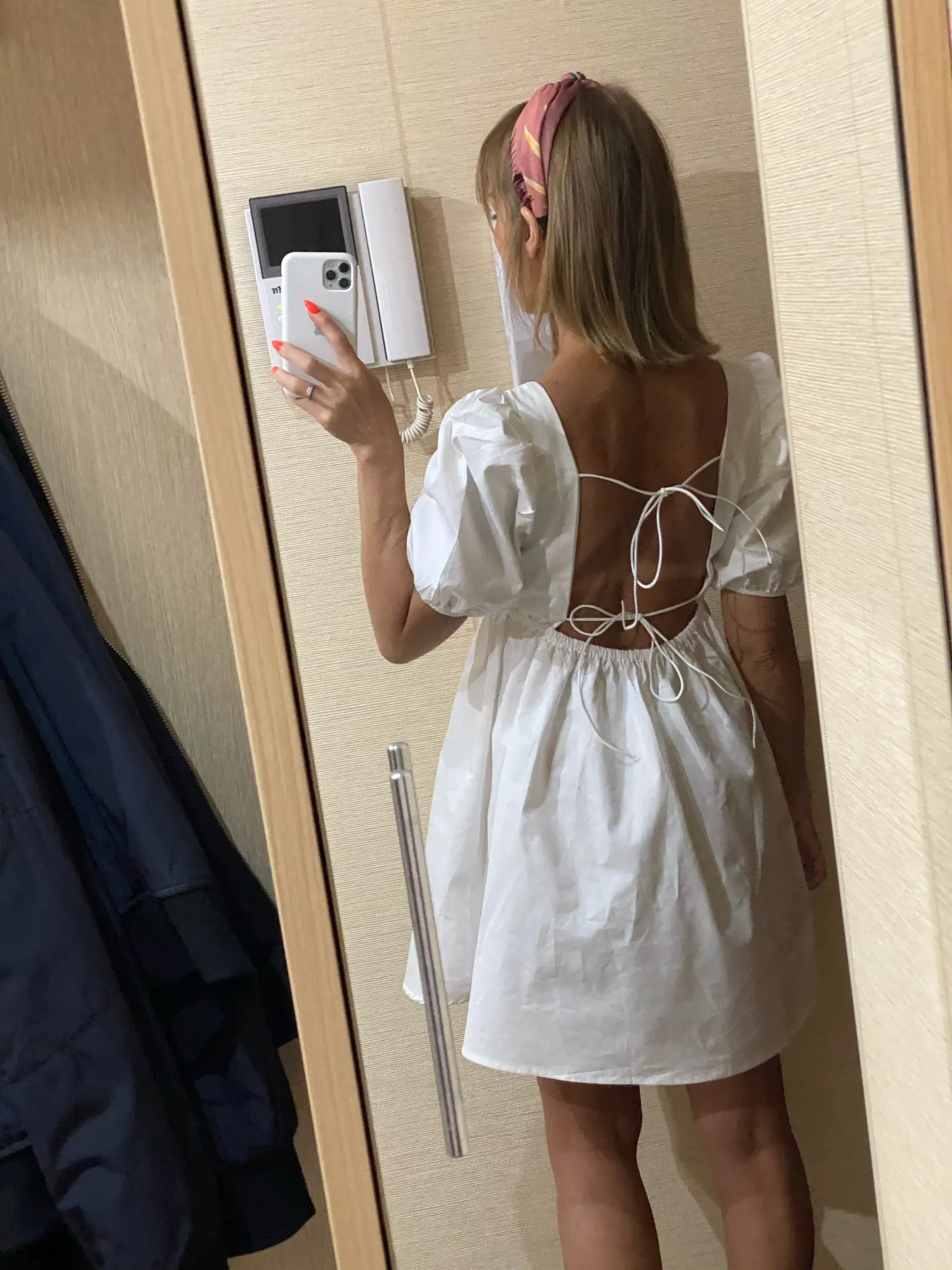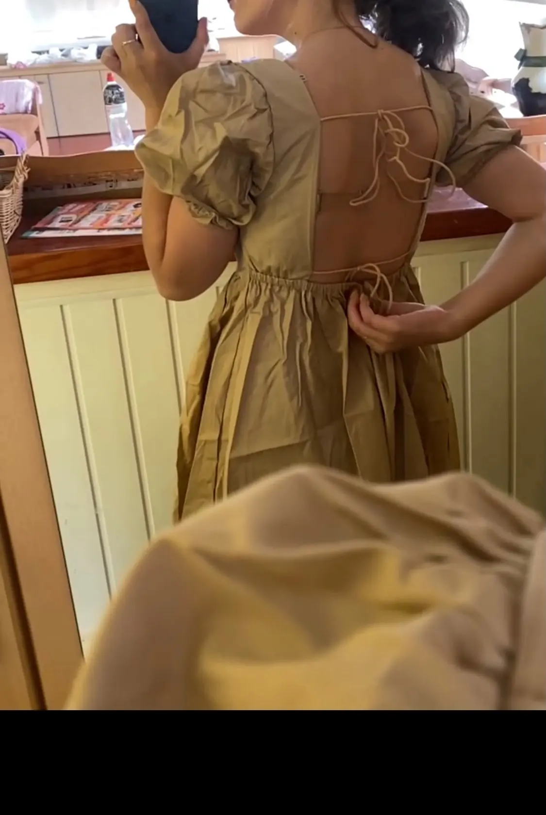Супер платье! Плотная качественная ткань, не светит. Веревочки на стене - это резинки.